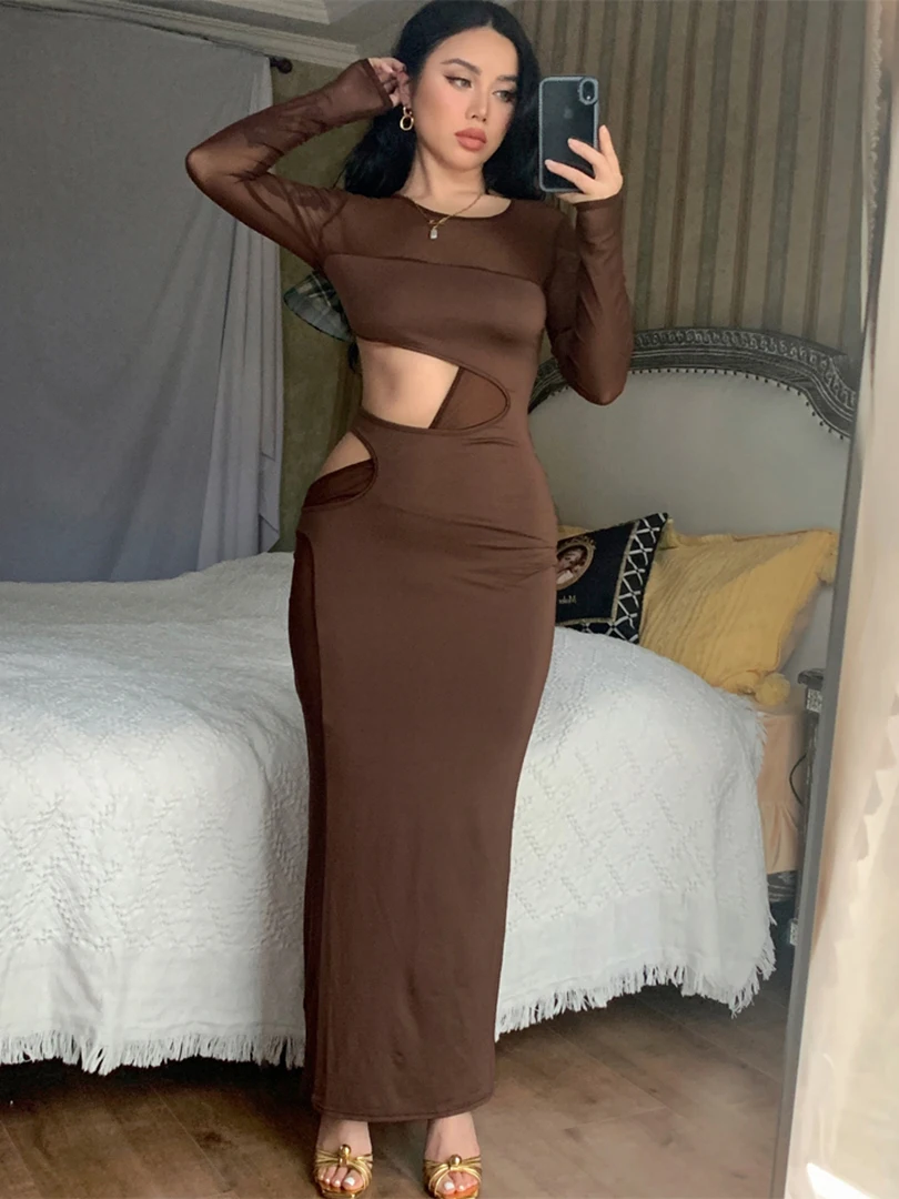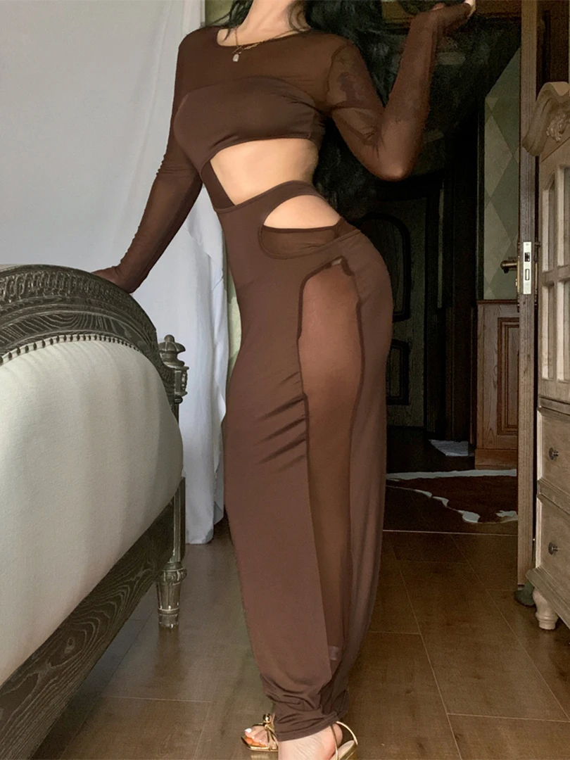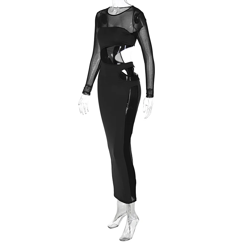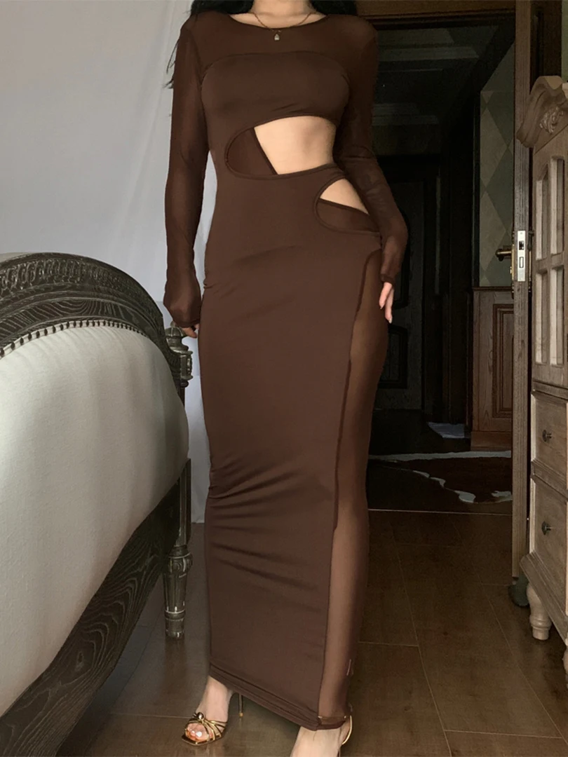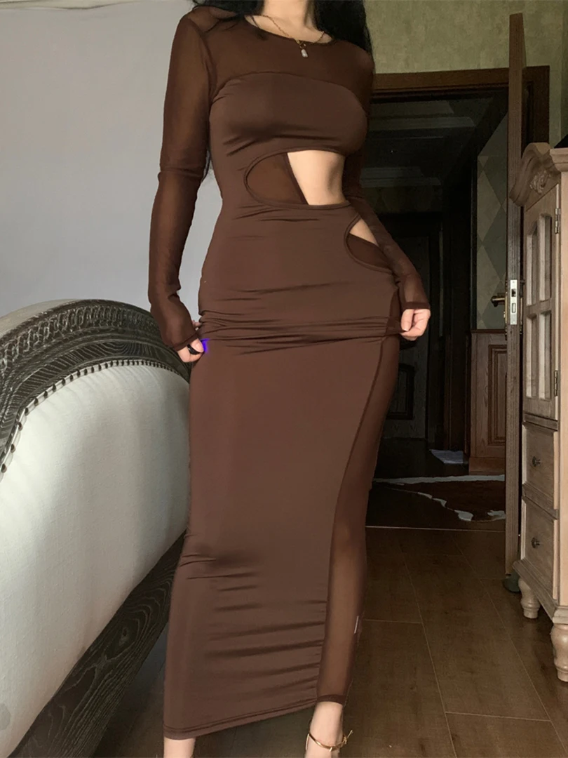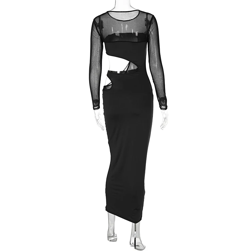 victoria’s vogue Mesh Patchwork Solid Long Sleeves O Neck Bright Line Hollow Out Maxi Dress 2022 Sexy Bodycon Party Club Wear Y2K