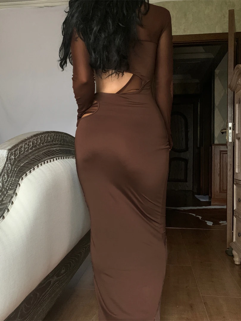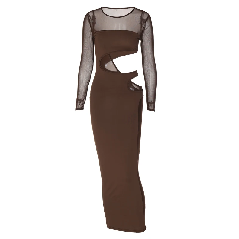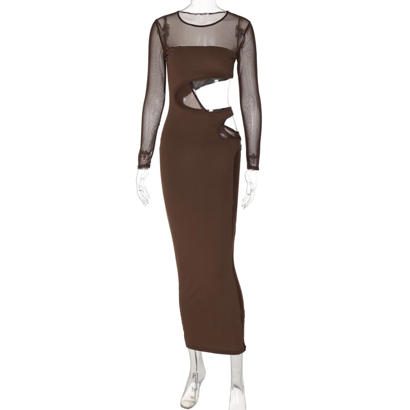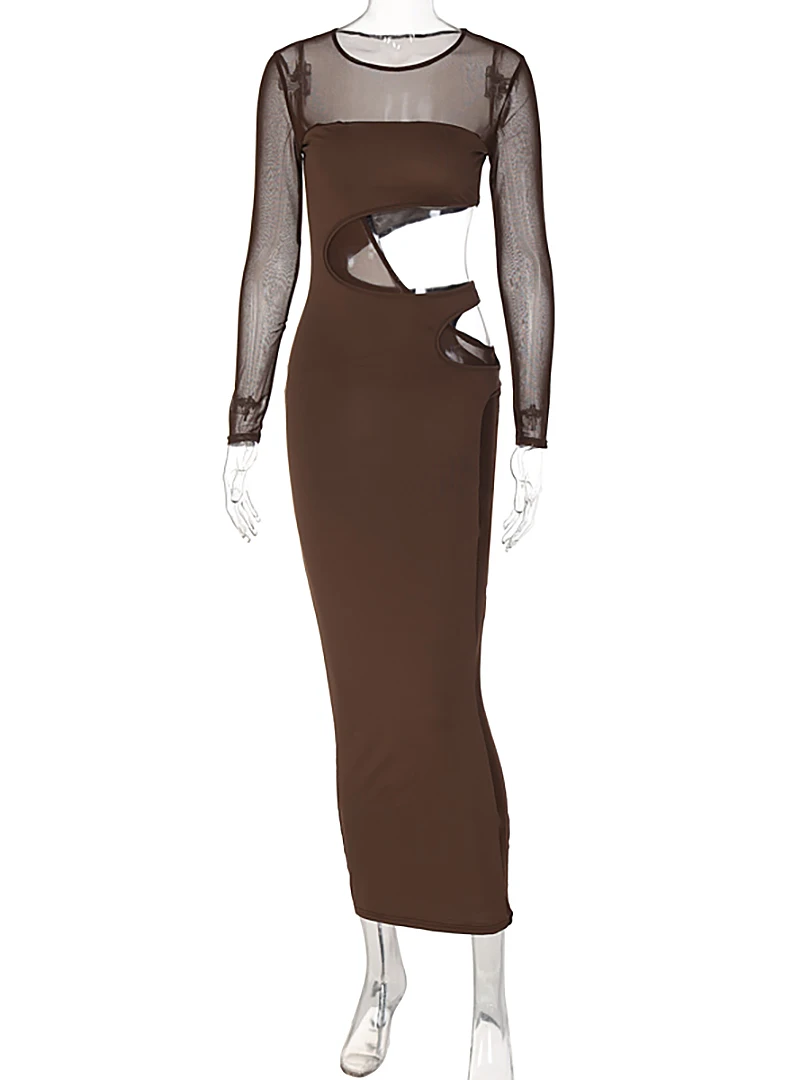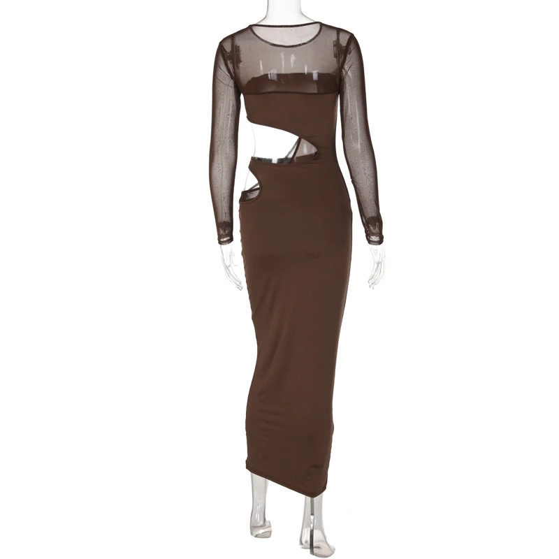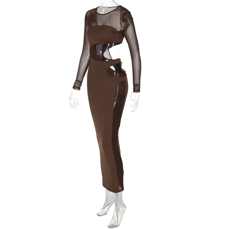 victoria’s vogue Mesh Patchwork Solid Long Sleeves O Neck Bright Line Hollow Out Maxi Dress 2022 Sexy Bodycon Party Club Wear Y2K