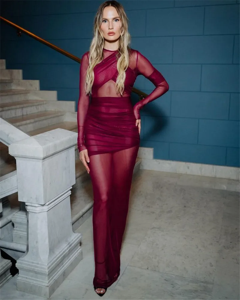Victoria’s Vogue Mesh Ruched Sexy Maxi Dress For Women Fashion Zipper Patchwork See Through Long Sleeve Elegant Club Party Long Dress