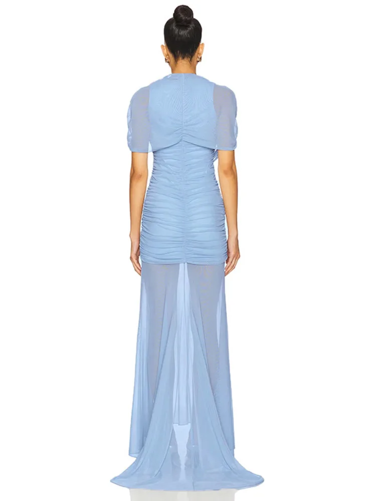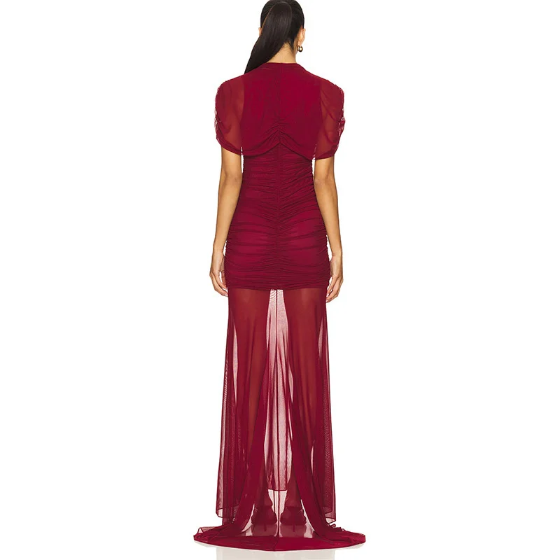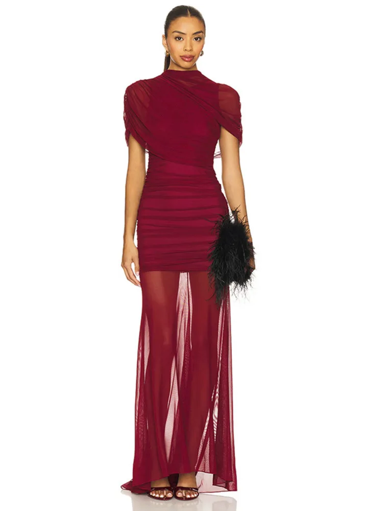 Victoria’s Vogue Mesh Short Sleeve Sexy Maxi Dress Women Elegant Summer Half High Collar Ruched Bodycon Club Party Long Dress Female