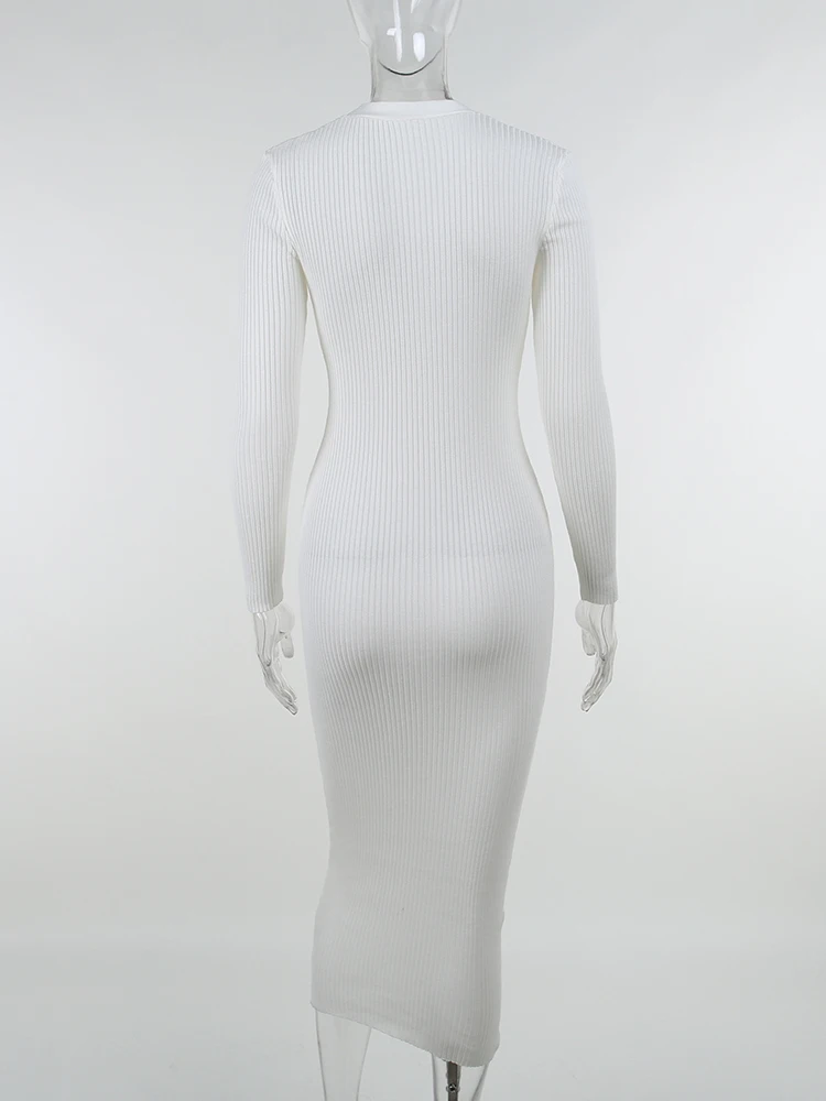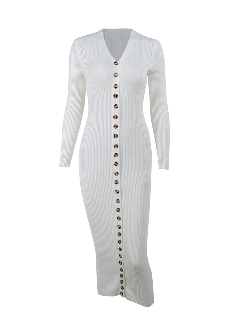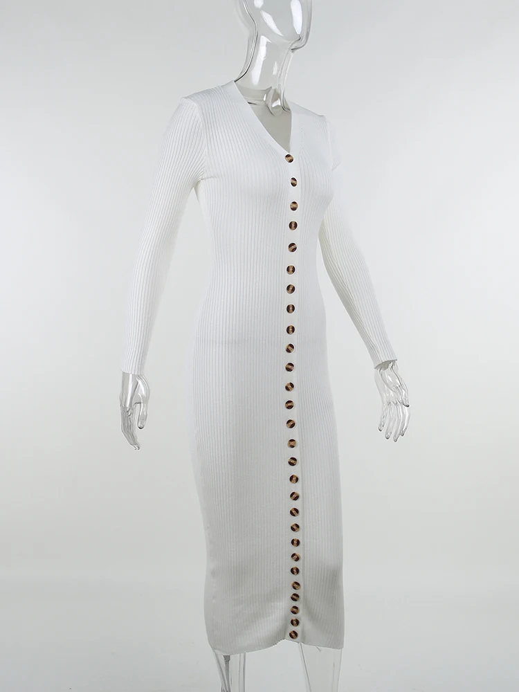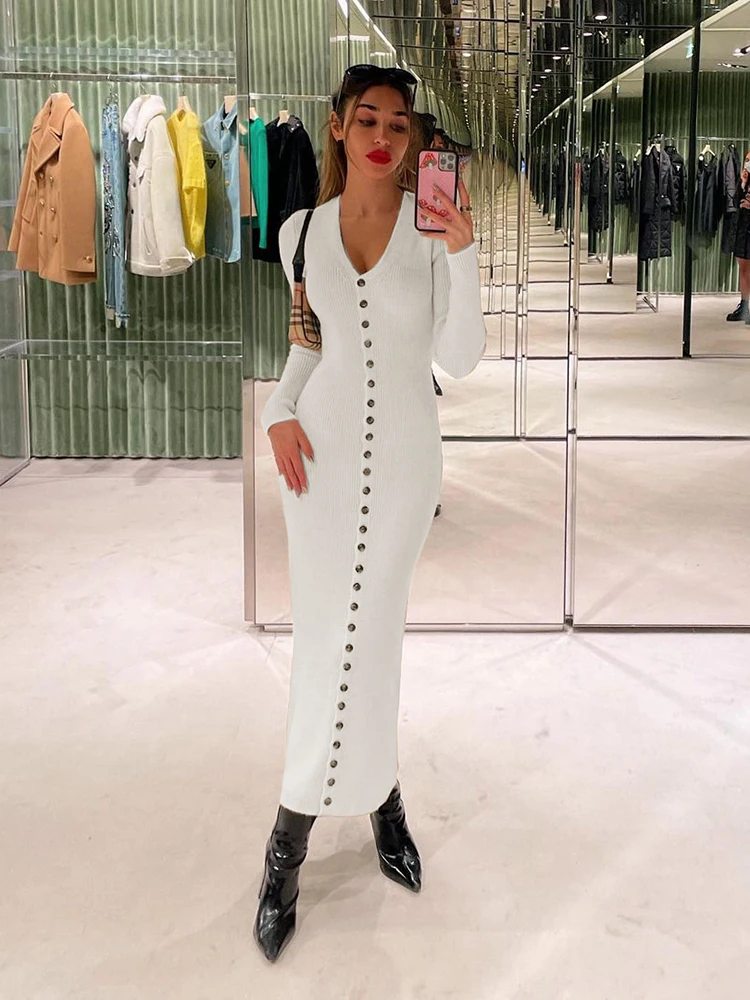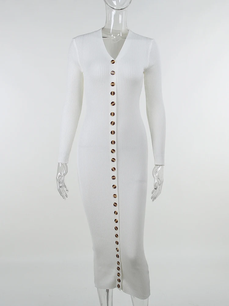 victoria’s vogue Midi Dress Long Sleeve Knitwear Button Split V Neck Sexy Party Club Dress Women Casual Bodycon Ladies Elegant Dresses