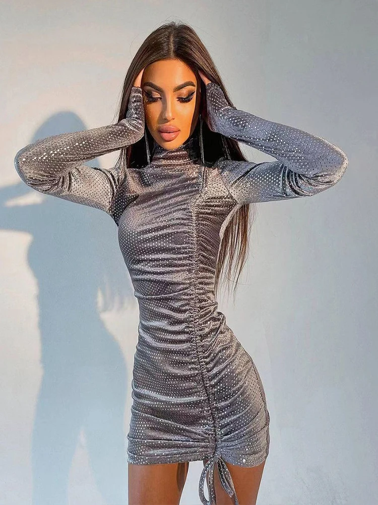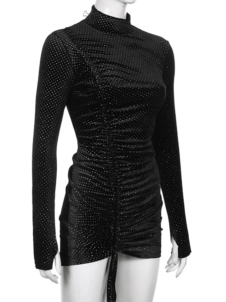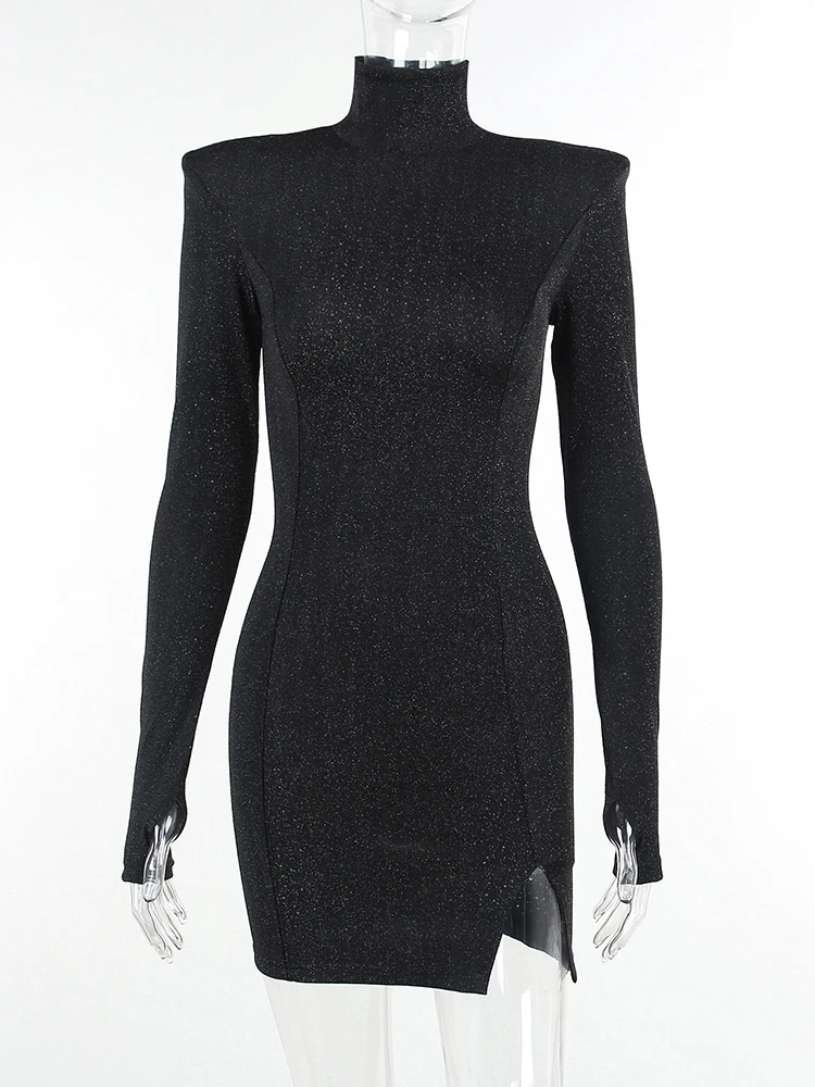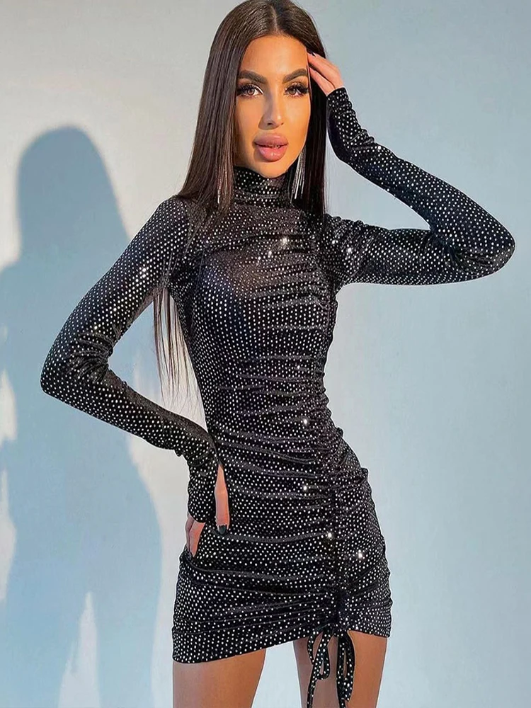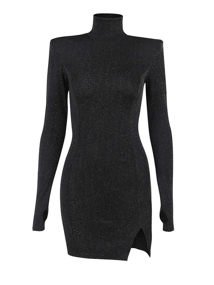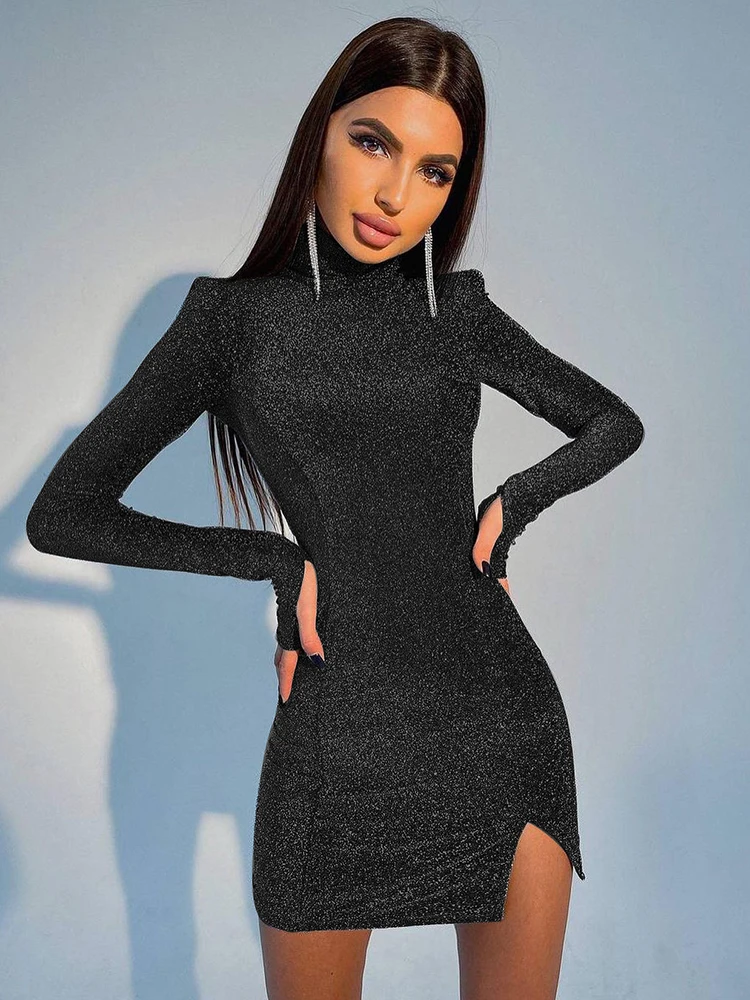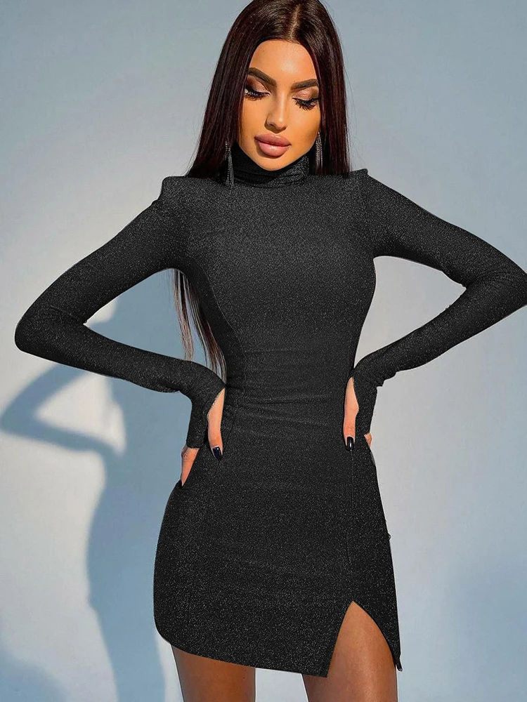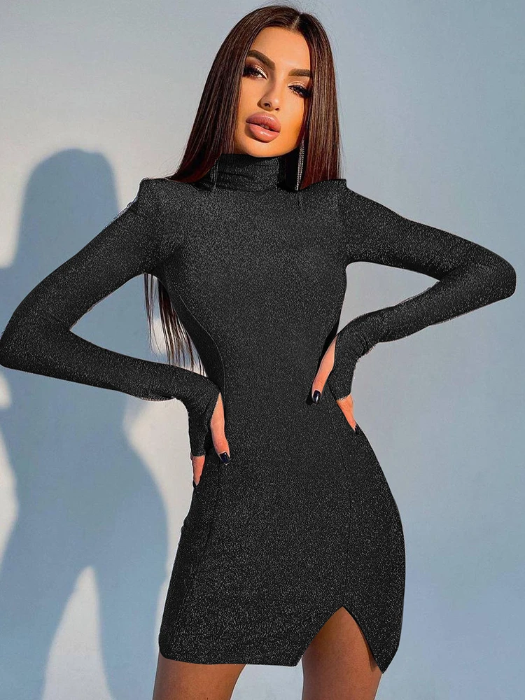 victoria’s vogue Mini Dress Women Fashion Turtleneck Sequin Casual Sexy Side Split Long Sleeve Bodycon Streetwear Party Elegant Dresses