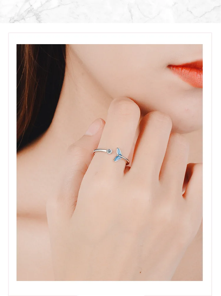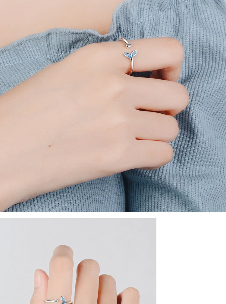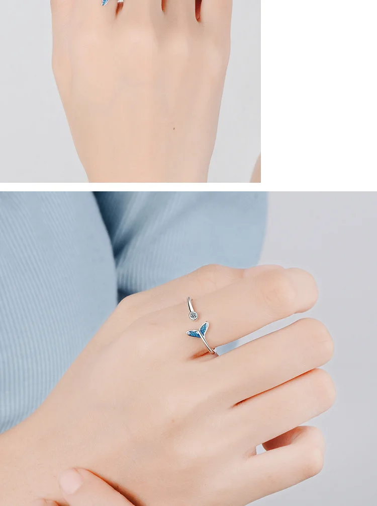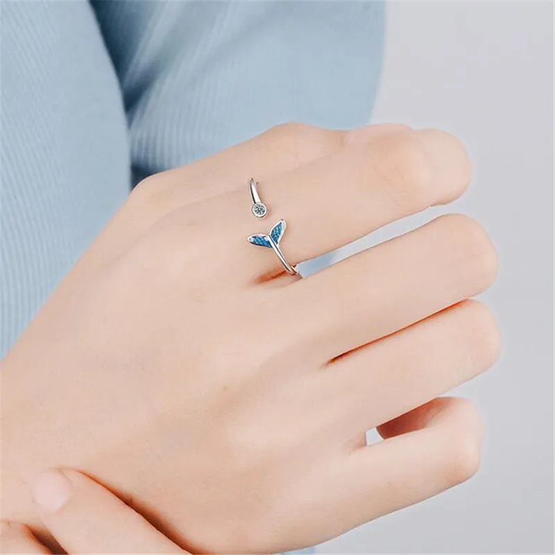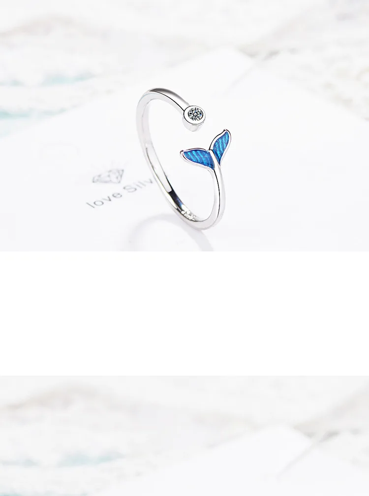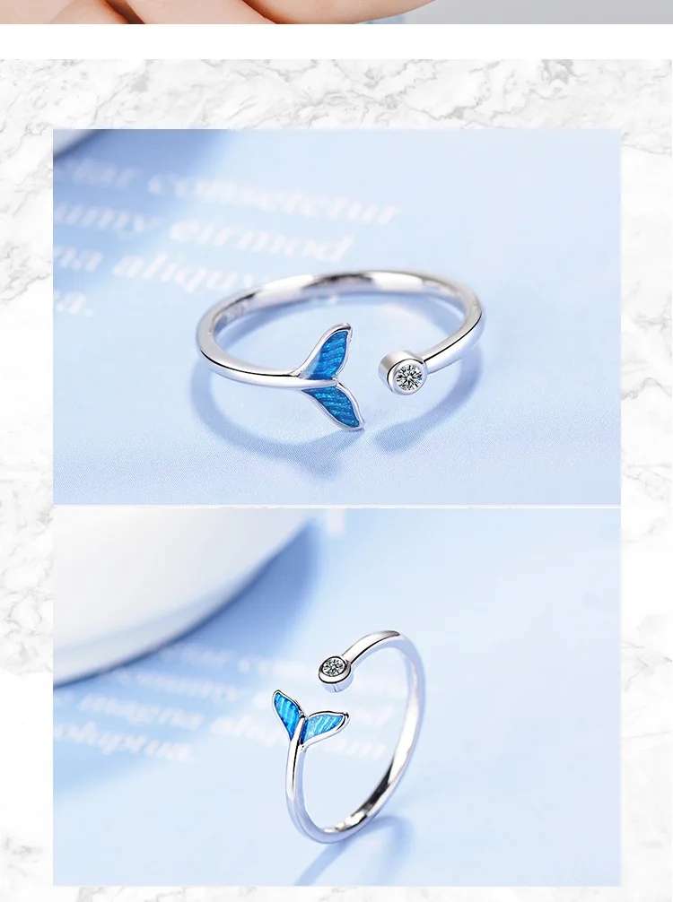 Victoria’s Vogue New Creative Beautiful Sweet Blue Fishtail 925 Sterling Silver Jewelry Fashion Fish Crystal Personality Opening Rings