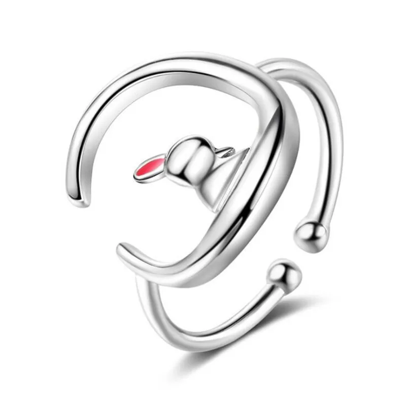 Victoria’s Vogue New Fashion Exquisite Crooked Moon Rabbit 925 Sterling Silver Jewelry Cute Jade Rabbit Sweet Animal Opening Rings