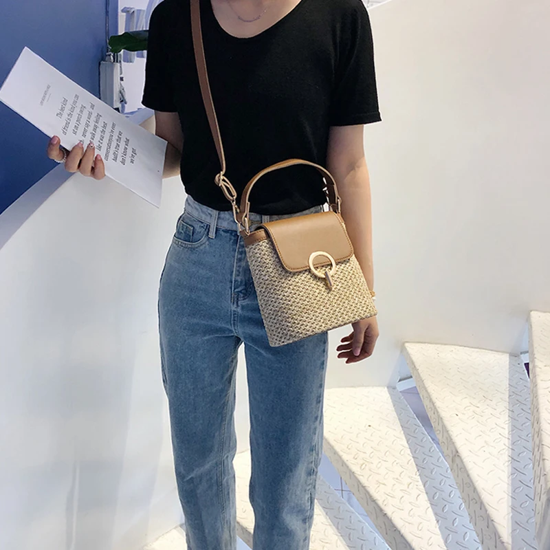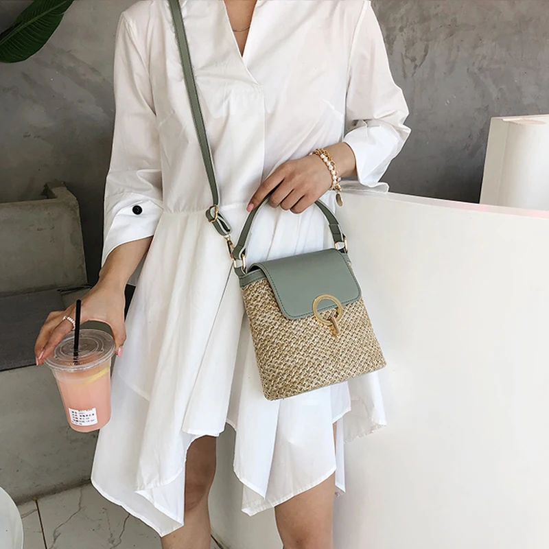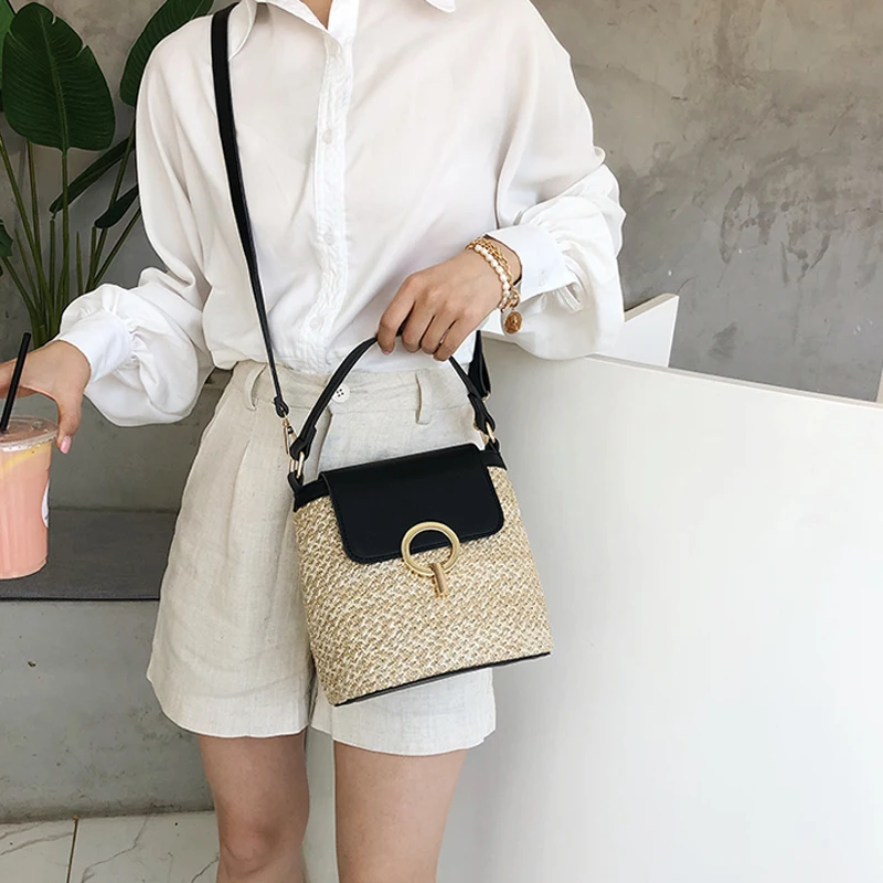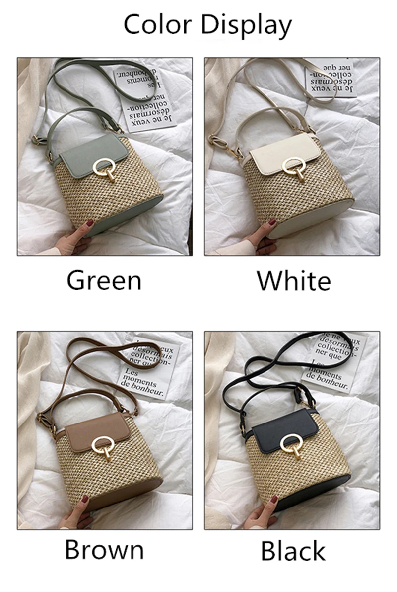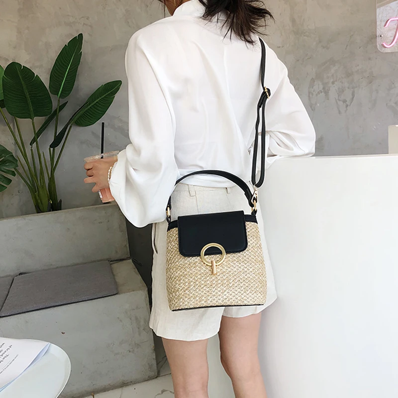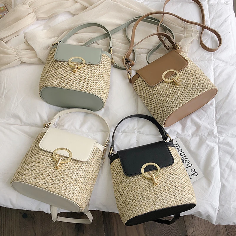 Victoria’s Vogue New Fashion Women Shoulder Messenger Bags Female Bucket Metal Buckle Beach Bags Handbags Ladies Handmade Woven Casual Straw Bags