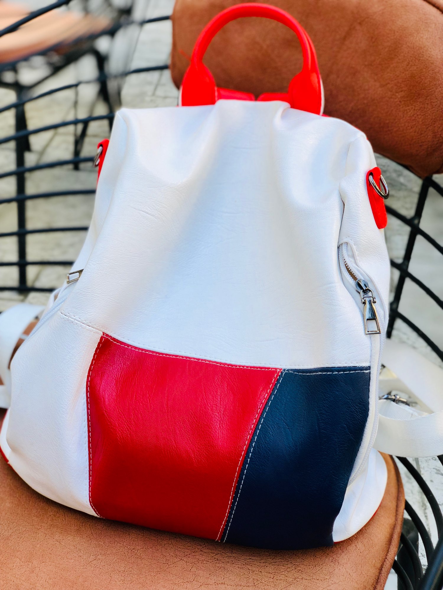 Very satisfied with the purchase of a backpack at such a price. Specially Selected colors for the summer under sandals. The only negative, it is necessary to use on the inside. Maybe that's a plus. There is no pain, leatherette soft.