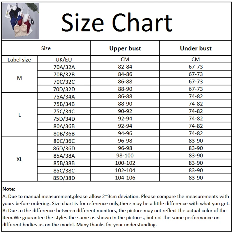 2:Recommendation: EU size 32ABC/34AB/36AB UK size 70ABC/75AB/80AB