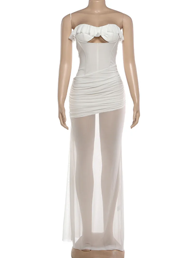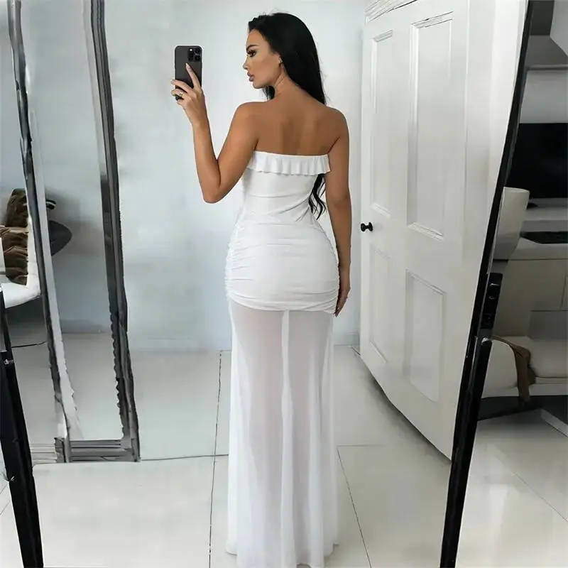 Victoria’s Vogue Off-shoulder Strapless Sexy Maxi Dress Women Elegant White Mesh Cutout Sleeveless Backless Ruched Bodycon Club Dress