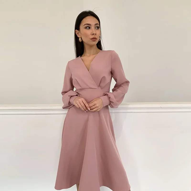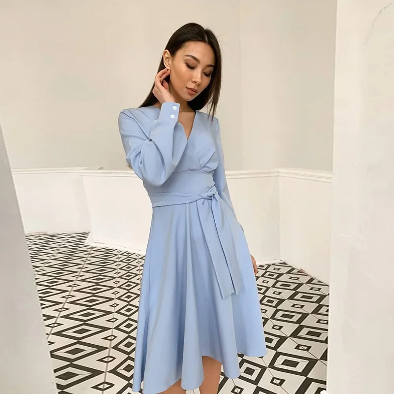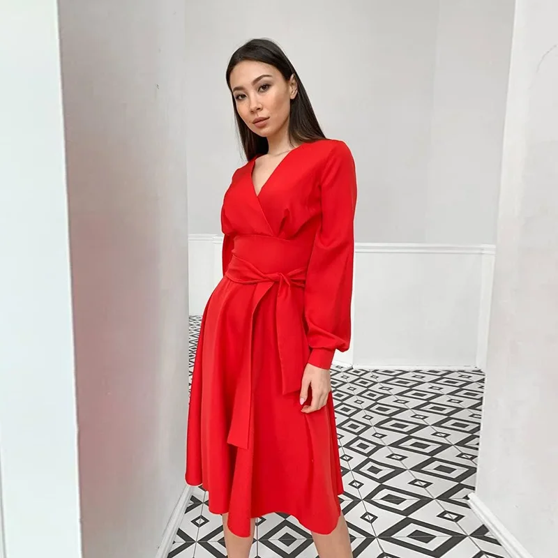 victoria’s vogue Office Lady a Line Midi Dress Women Lantern Sleeve v Neck High Waist Lace Up Elegant Fashion Autumn Winter 2021
