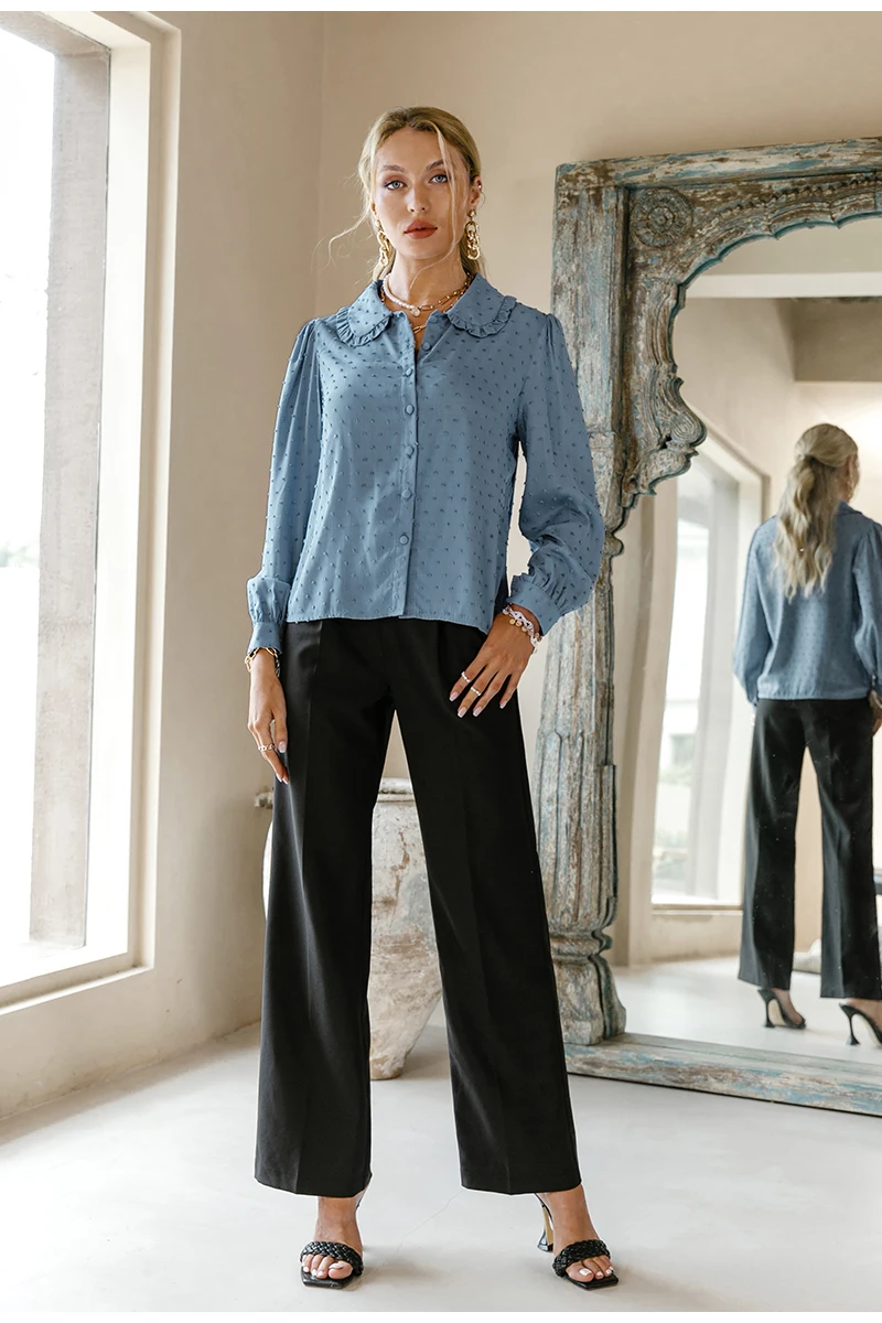 victoria’s vogue Office lady ruffle blouse shirt spring summer Solid button up long sleeve shirt Casual fashion blue soft lady tops 2022