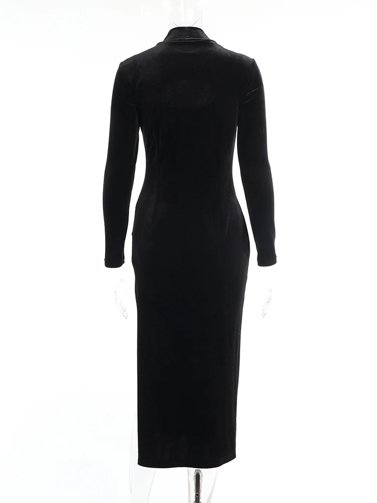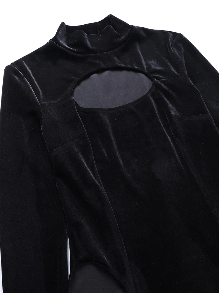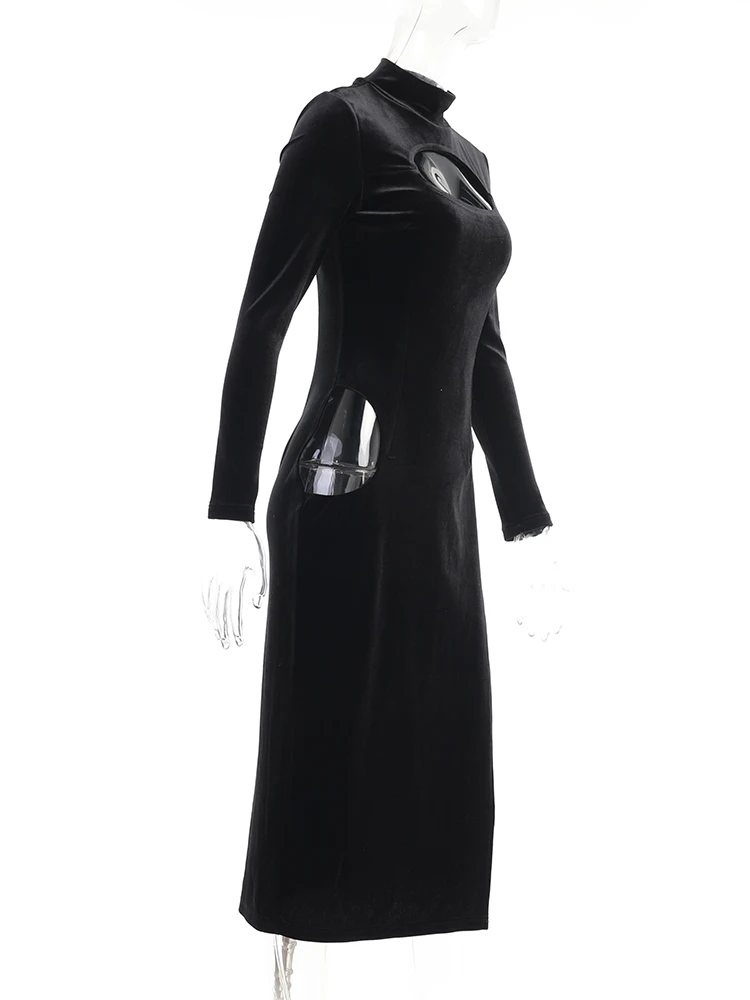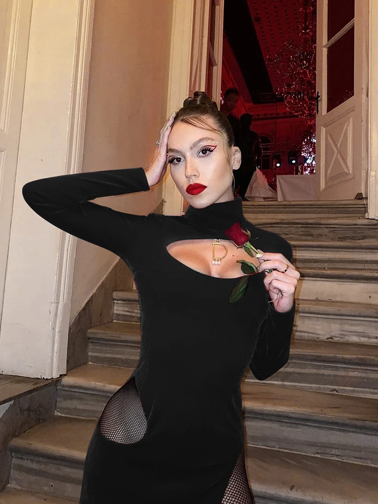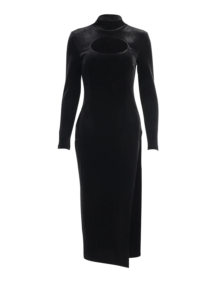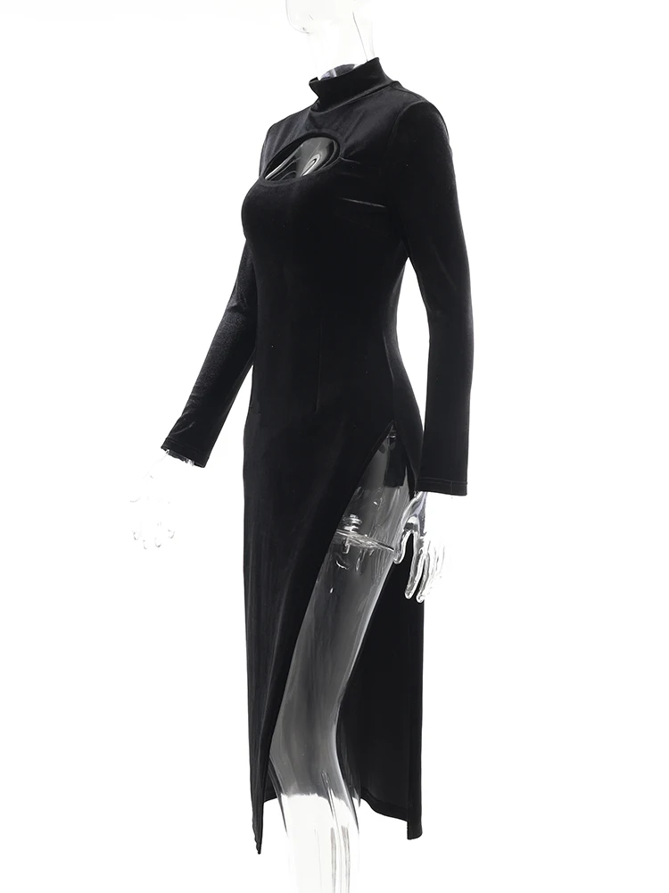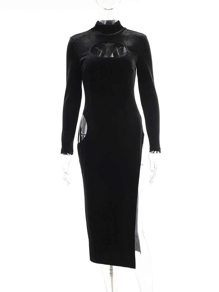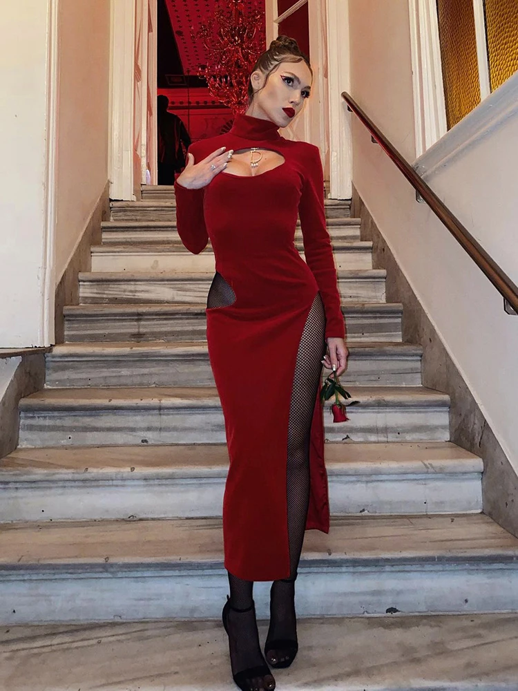 victoria’s vogue Party Dress Women Velvet Hollow Out Turtleneck Sexy Side Split Elegant Women Red Midi Dresses For Woman