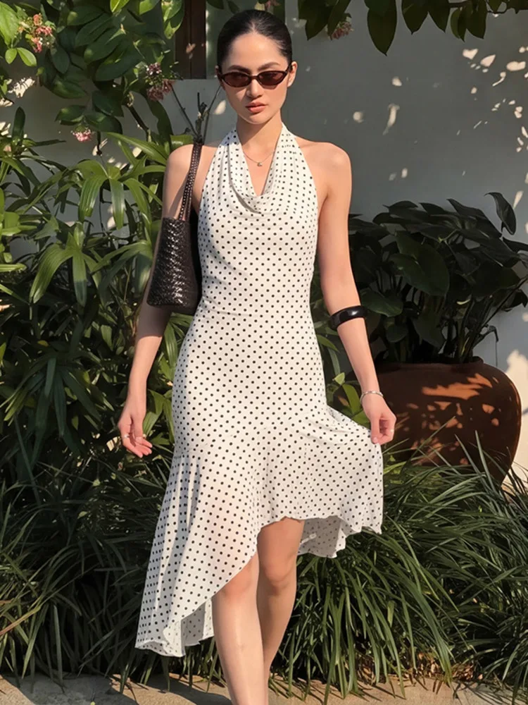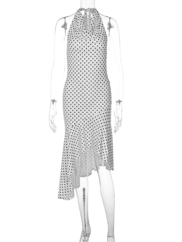 Victoria’s Vogue Polka Dot Backless Sexy Midi Dress Women Elegant Halter Off-shoulder Sleeveless Irregular Ruffle Sexy Midi Dresses