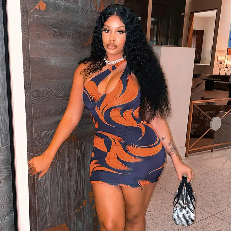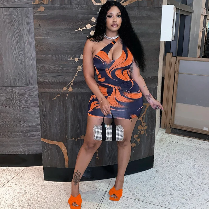 Victoria’s Vogue Print One Shoulder Sleeveless Hollow Out Irregular Mini Dress Sexy Skinny 2022 Summer Women Streetwear Party Outfits
