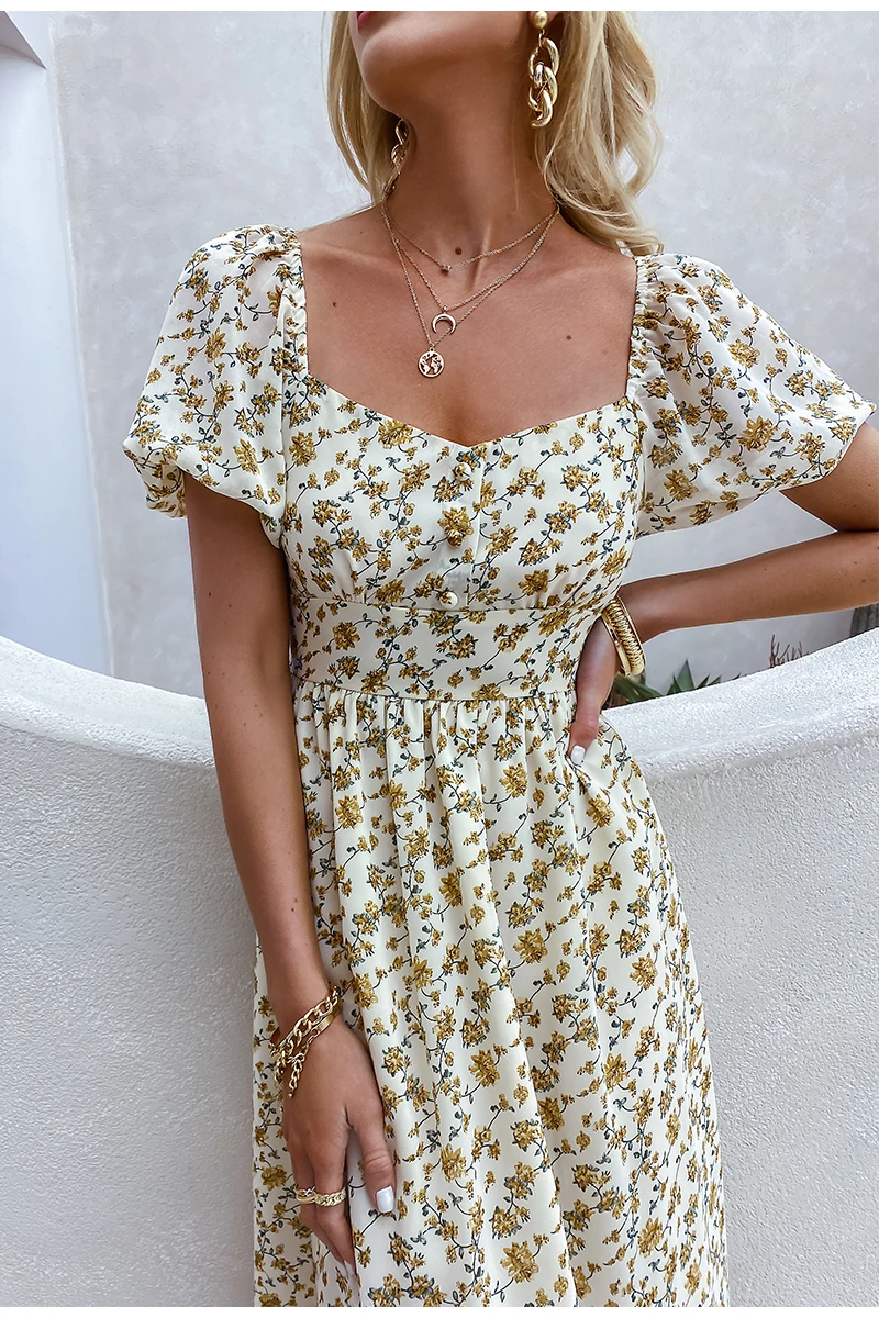 victoria’s vogue Puff Sleeve Square Neck Flower Print Women Dress Summer 2022 Casual High Waist A-line Long Dress Elegant Female Vestidos
