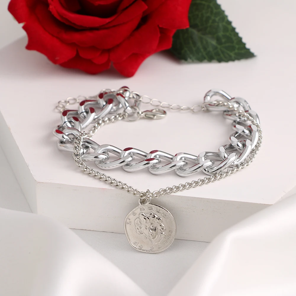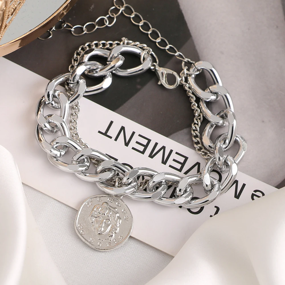 Victoria’s Vogue Punk Metal Portrait Coin Thick Chain Bracelet Women Vintage Twist Chain Geometric Charm Bracelet Fashion Jewelry Gift