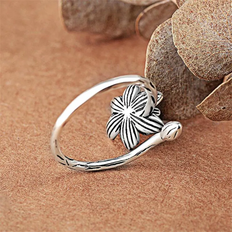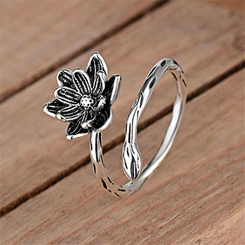 Victoria’s Vogue Retro Thai Silver Lotus Simple Ethnic 925 Sterling Silver Jewelry Temperament Flower Opening Lotus Rings