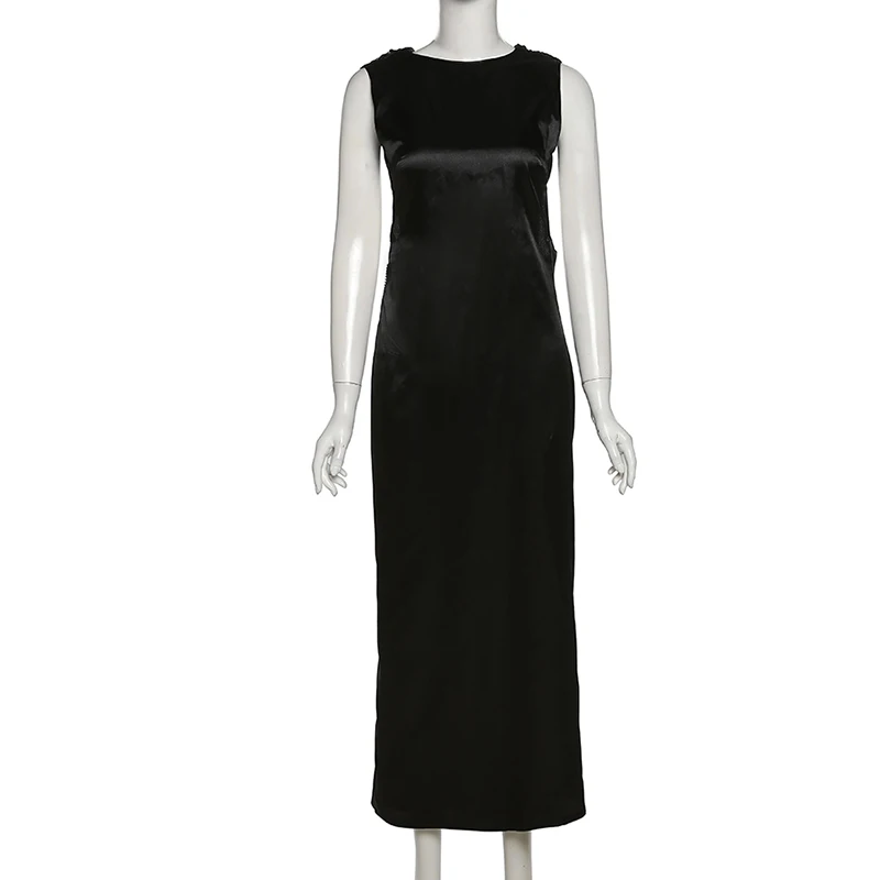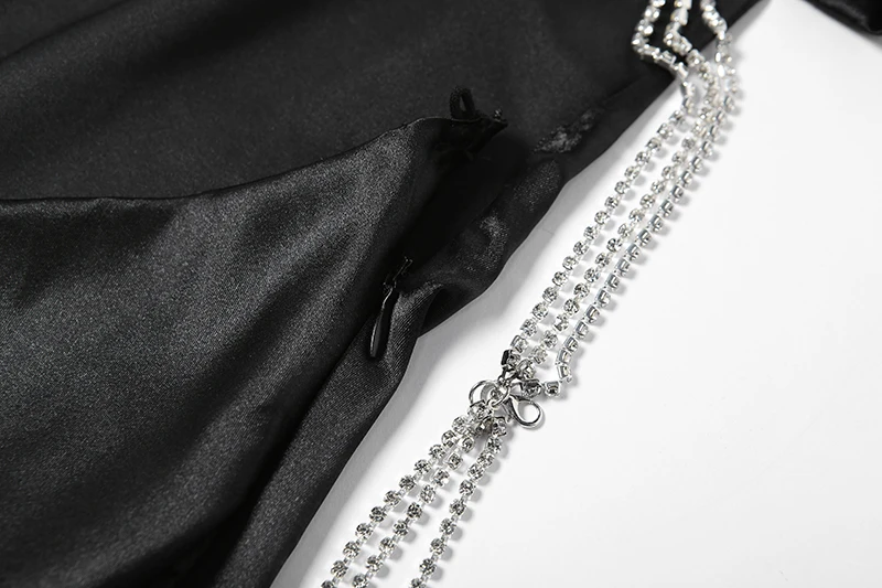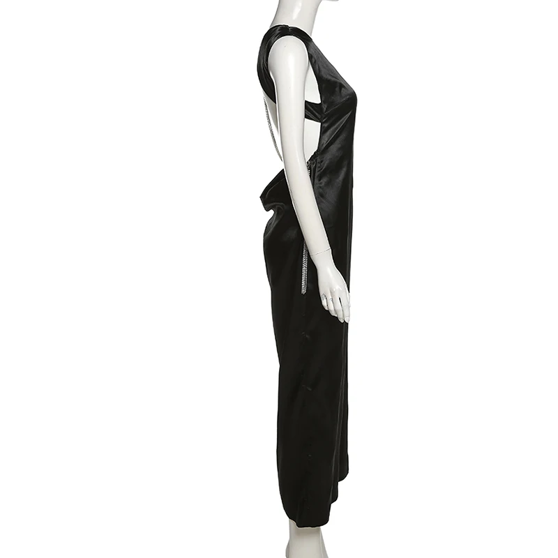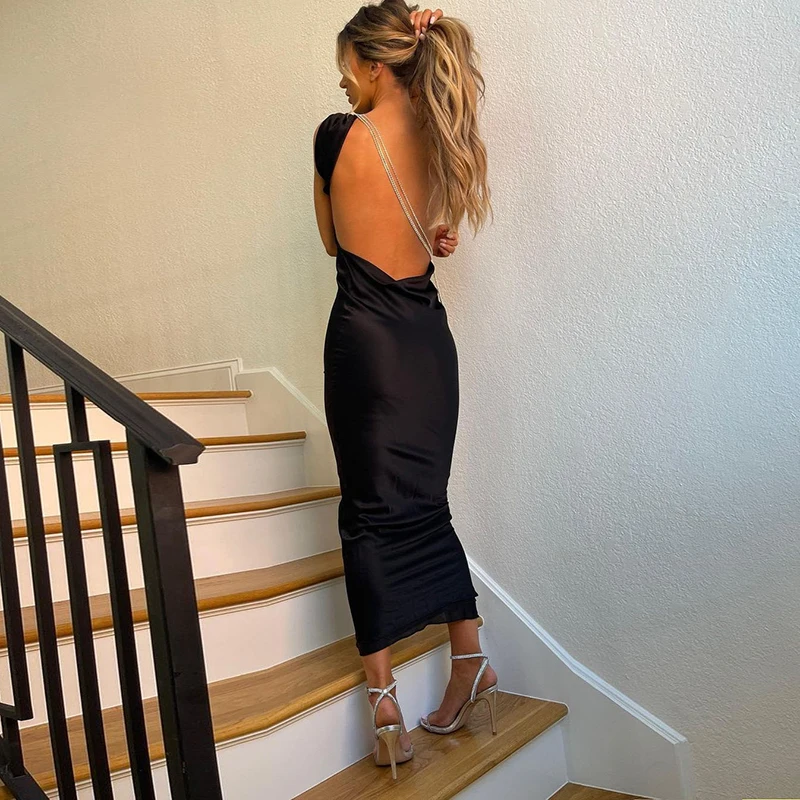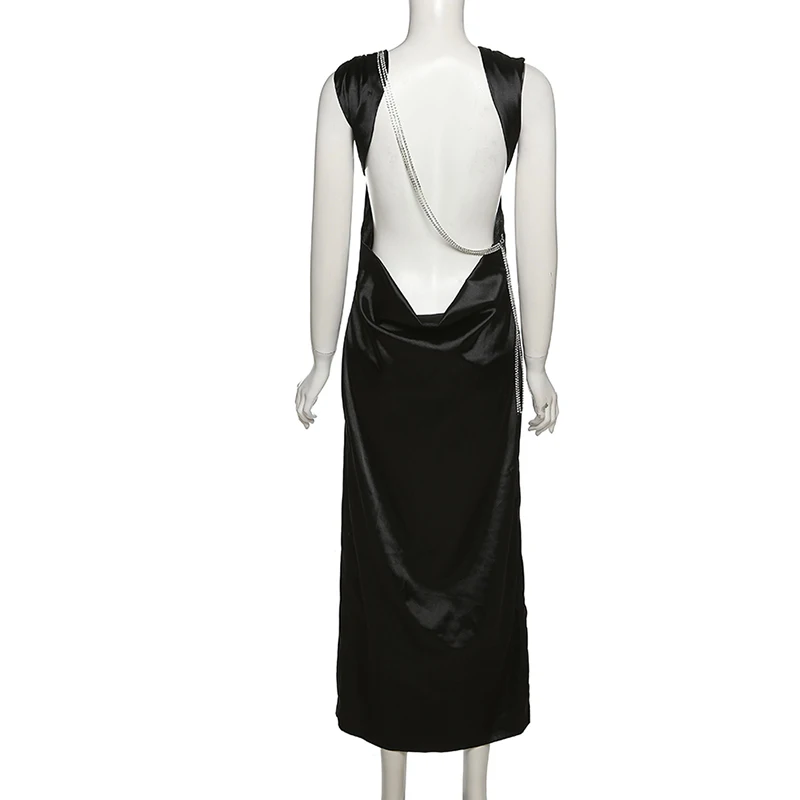 victoria’s vogue Rhinestone Chain Satin Dress Women Sexy Sleeveless Backless Round Collar Evening Dress 2022 Spring Black Party Vestidos