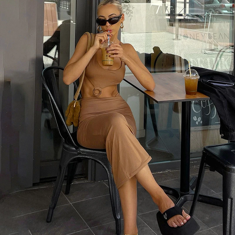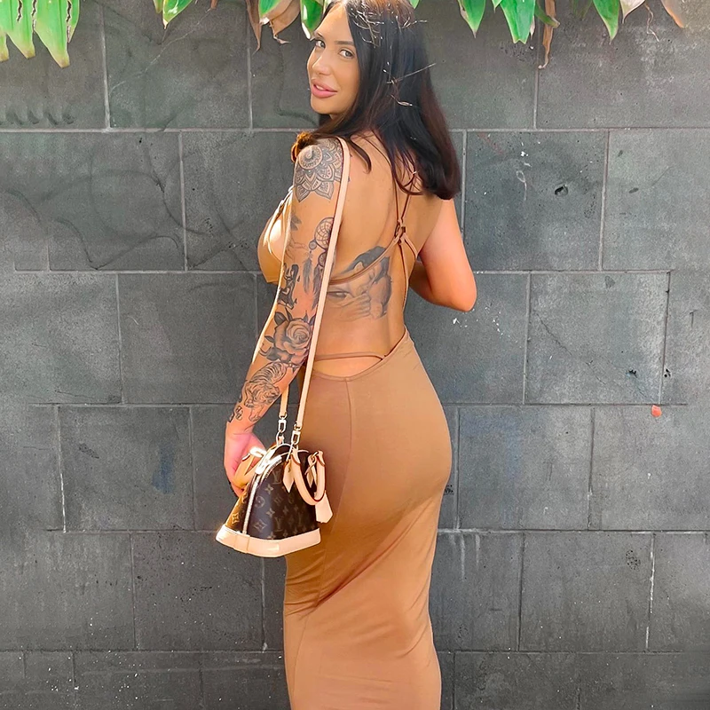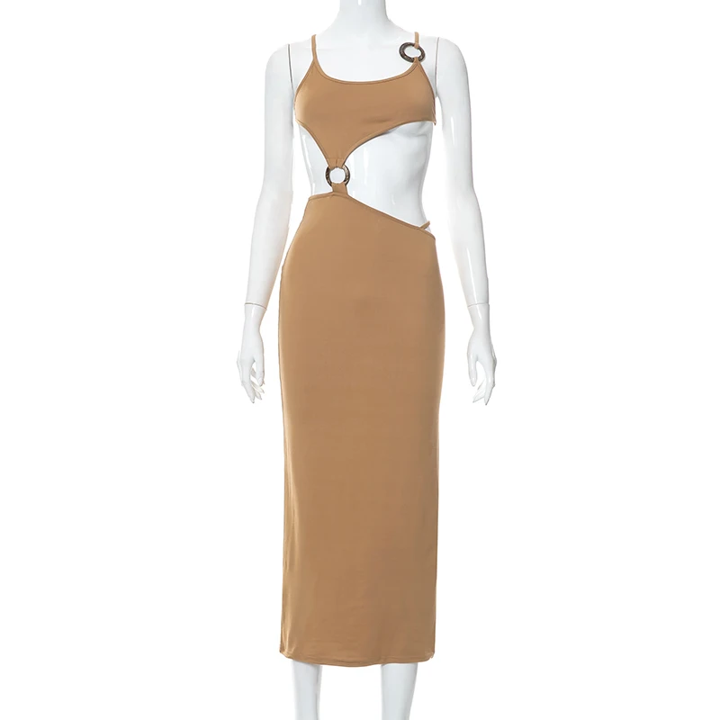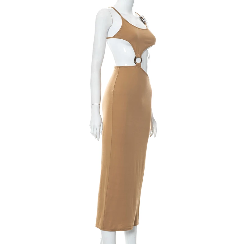 victoria’s vogue Ring Halter Neck Hollow Out Crotch Solid Color Tight Casual Dress Long Skirt Women Variety Style