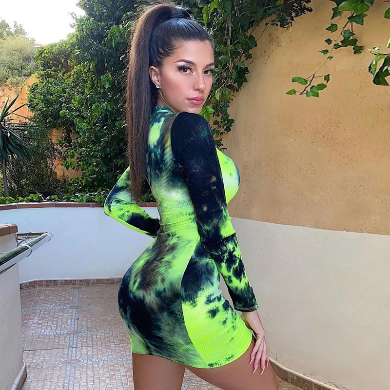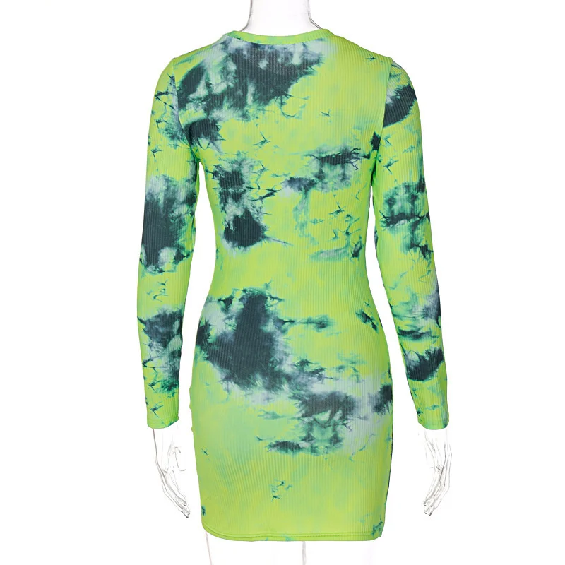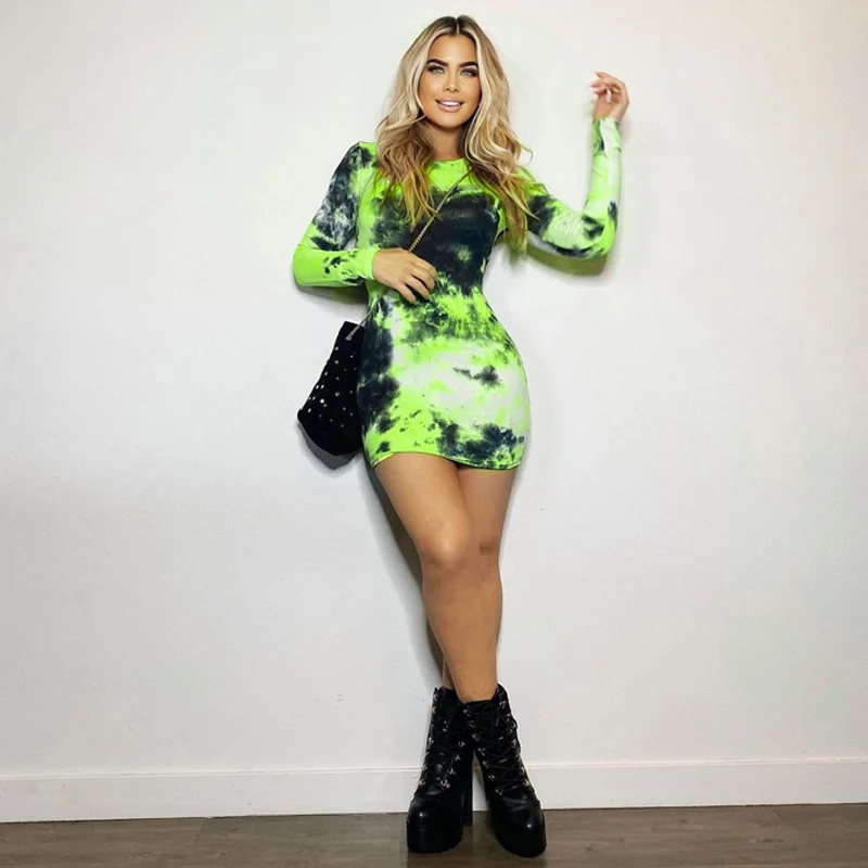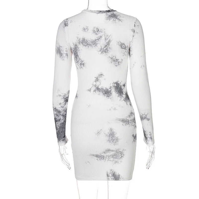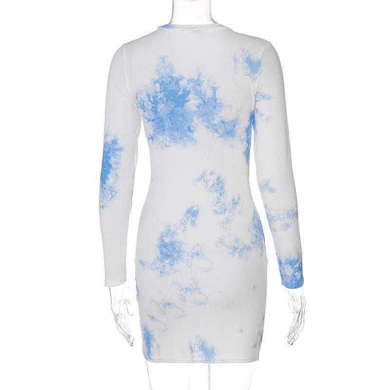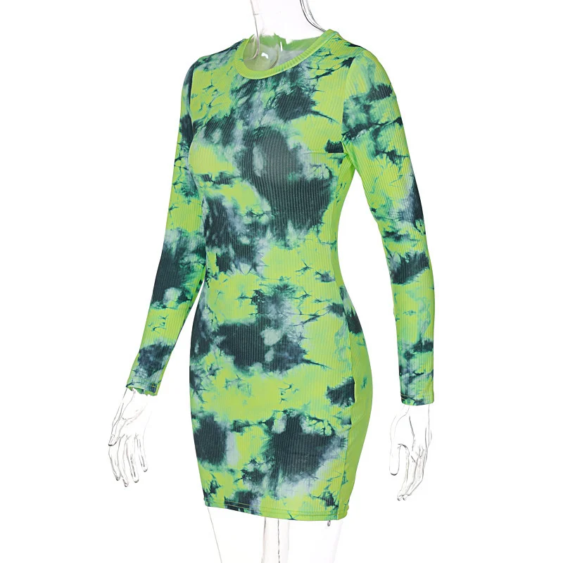 victoria’s vogue Round Collar Tie Dye Print Dress Slim Long Sleeve Casual Elegant Women Clothing Sexy Ladies Bodycon Running Sport Dress