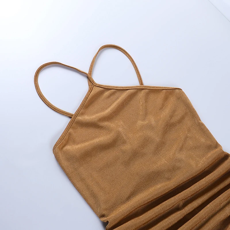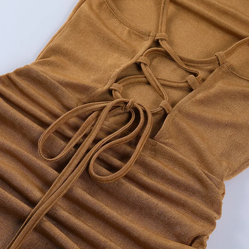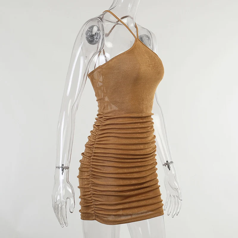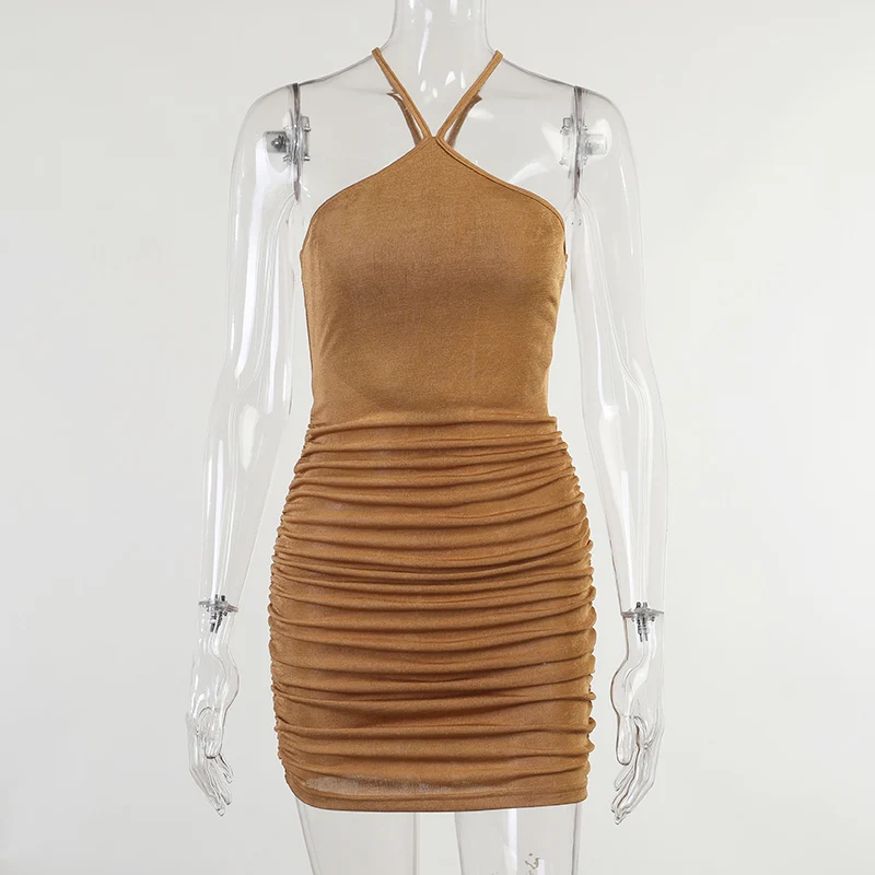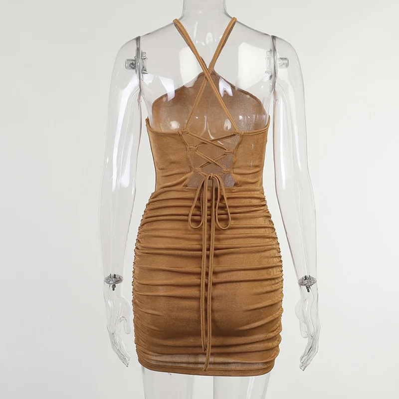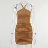 victoria’s vogue Ruched Sleeveless Halter Mini Dress For Women Brwon V-Neck Lace Up Backless 2021 Summer Slim Sexy Basis Gril Dress2021