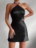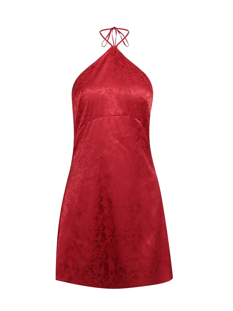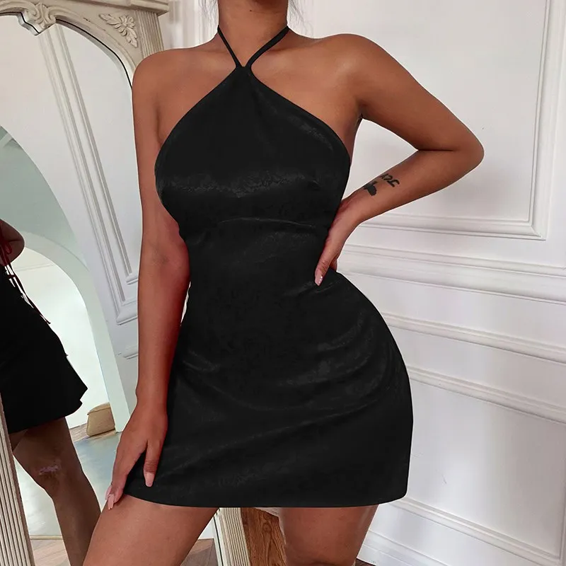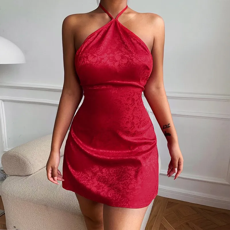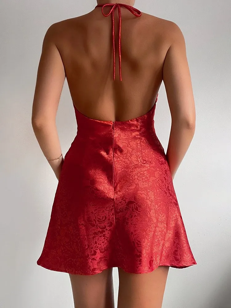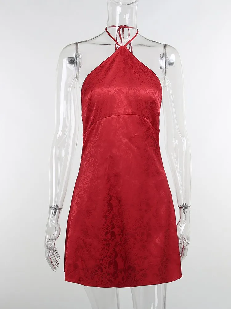 victoria’s vogue Satin Jacquard Mini Dress Women Halter Backless Sleeveless Lace Up Sexy Bodycon Fashion Vintage Female Partywear