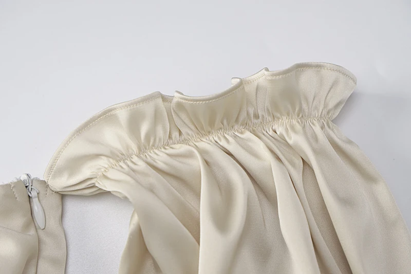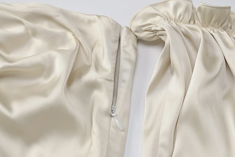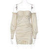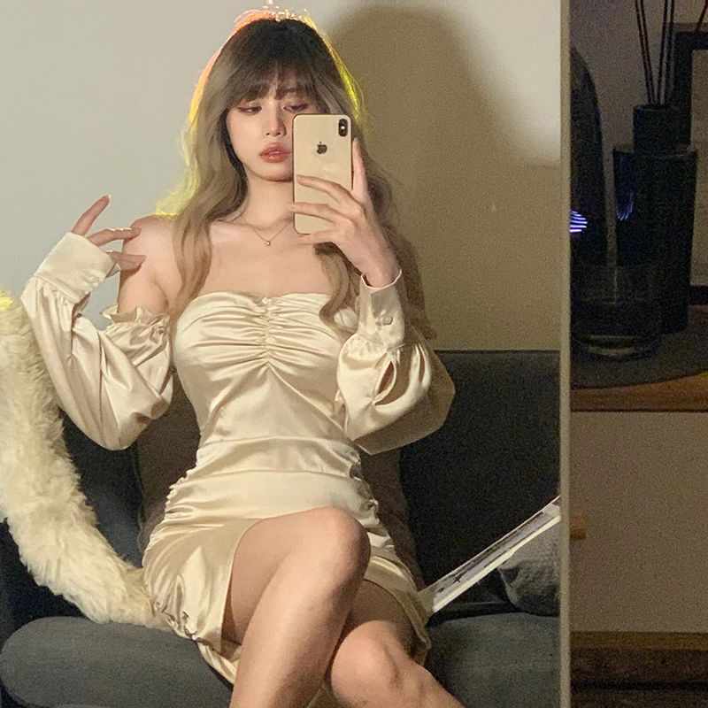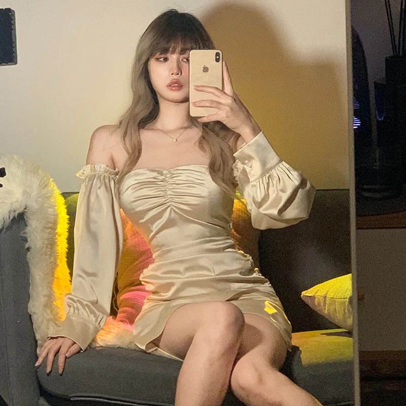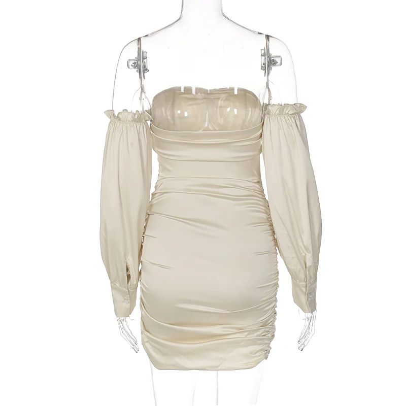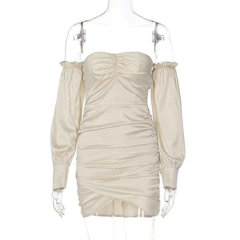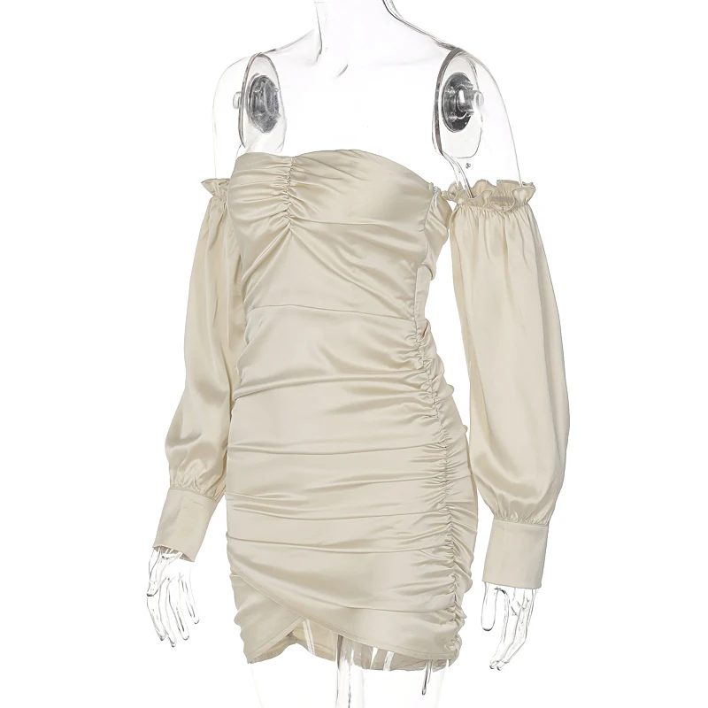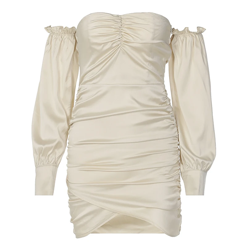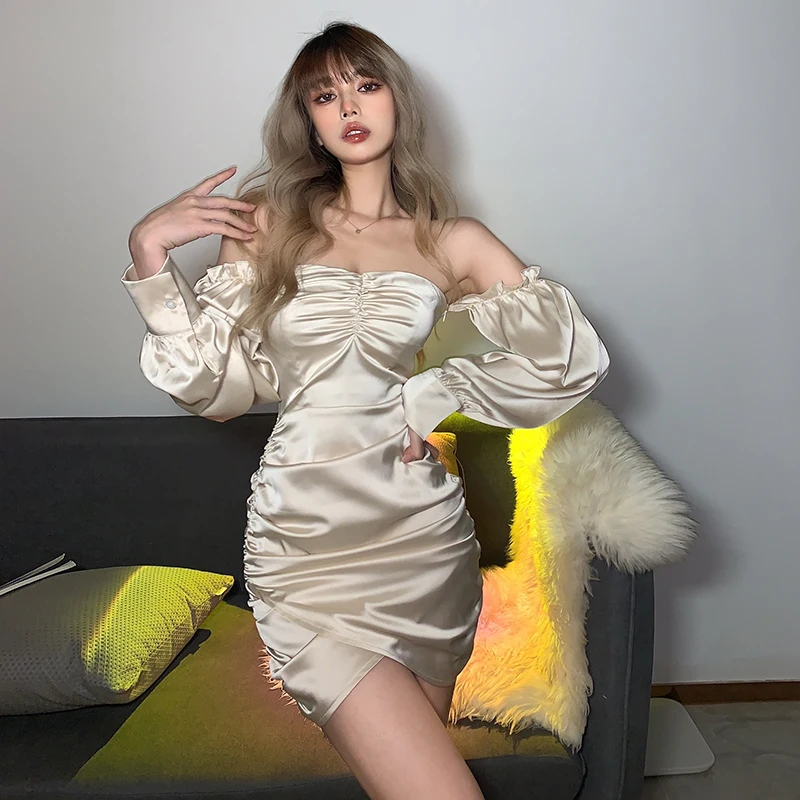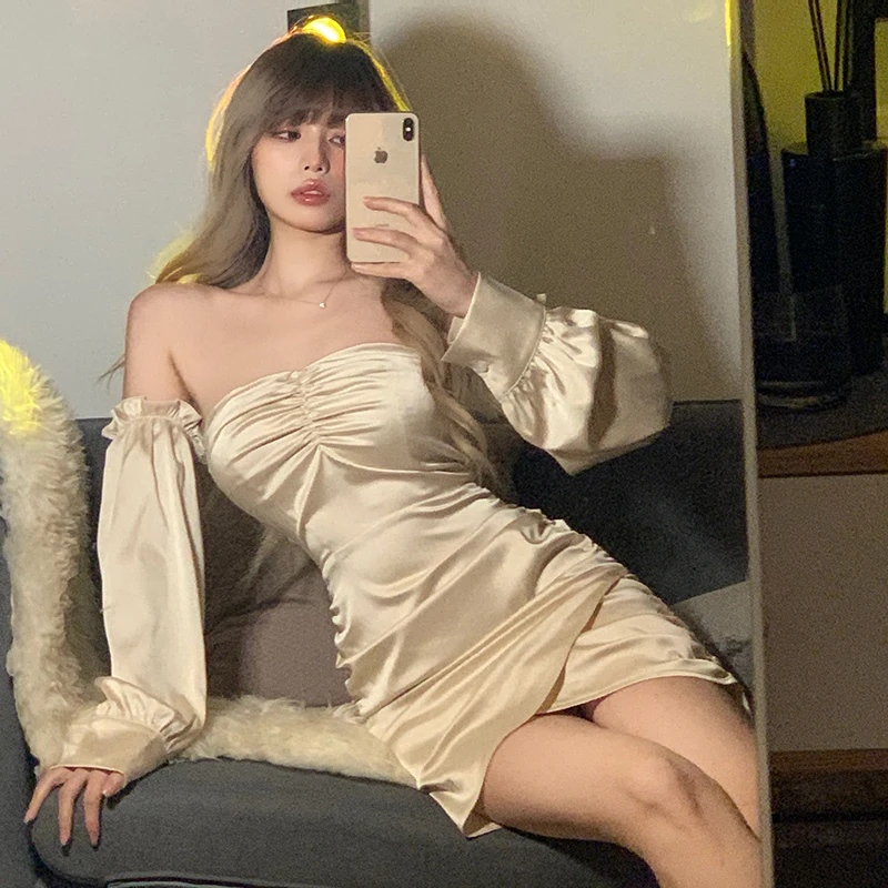 victoria’s vogue Satin Slash Neck Off Shouldder Long Puff Sleeves Pleated Mini Dress 2022 Bodycon Sexy Streetwear Evening Party Elegant