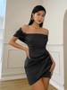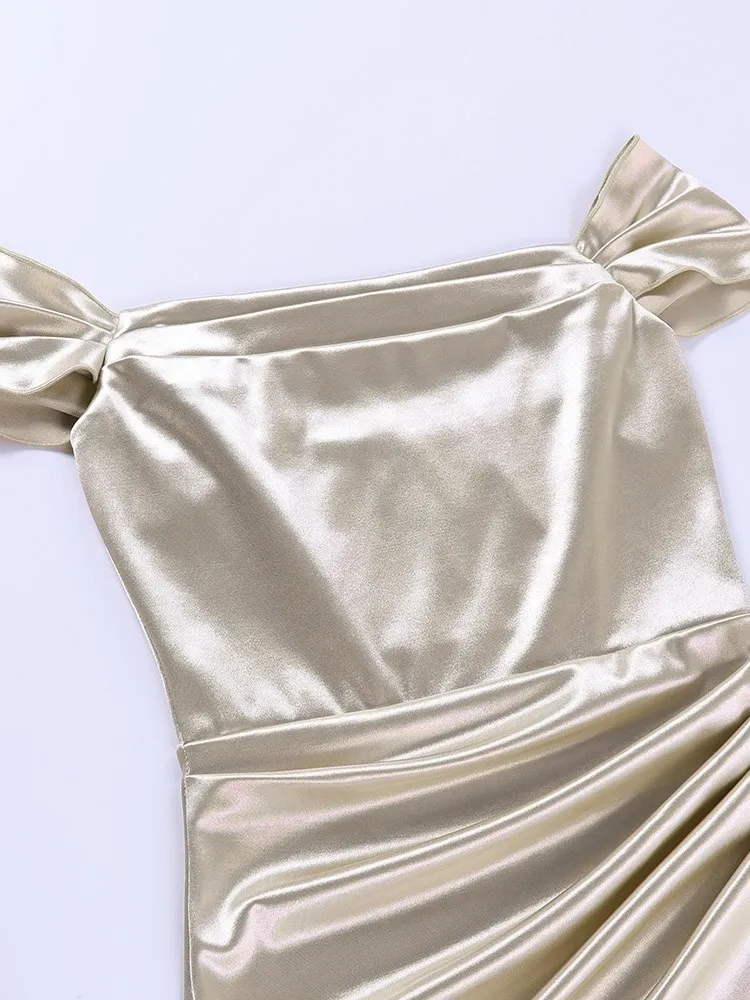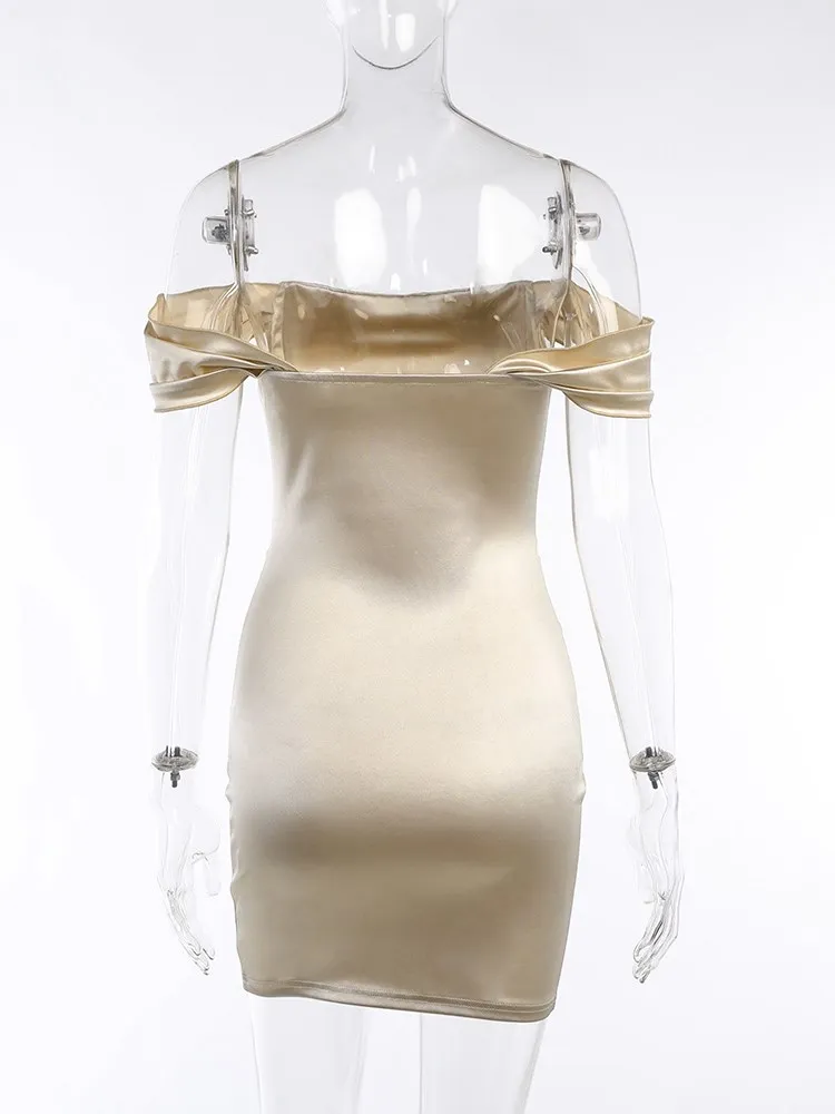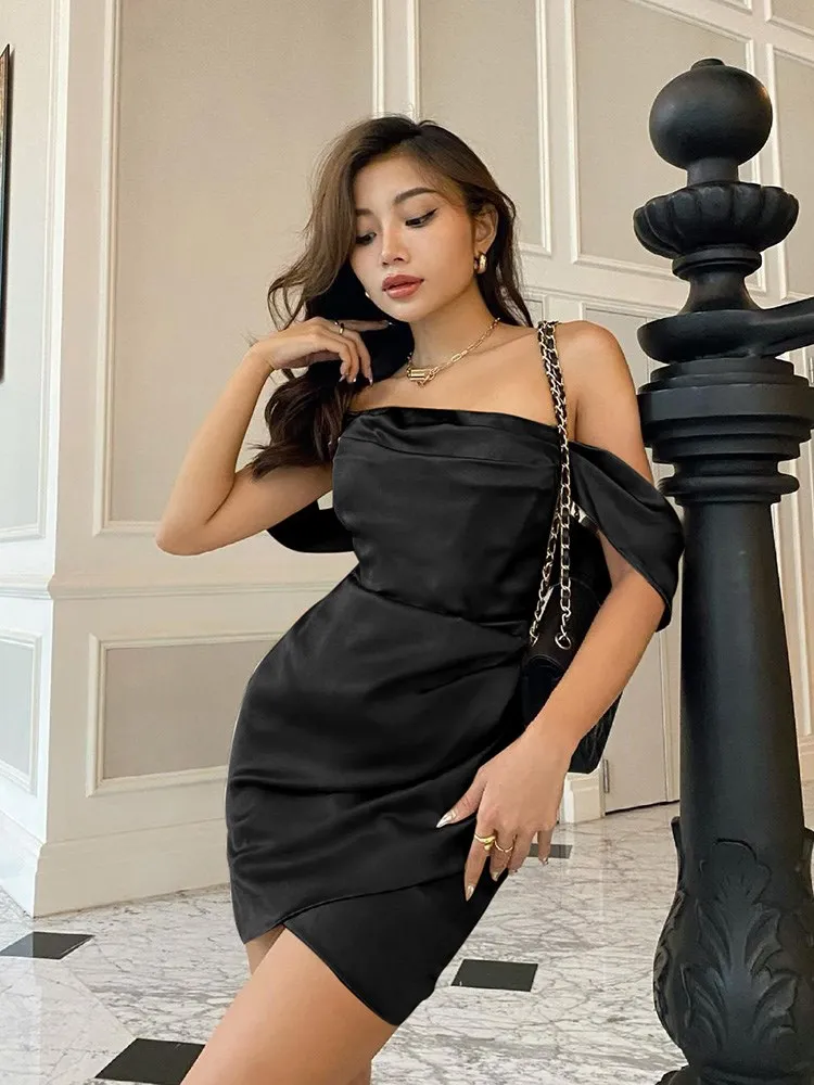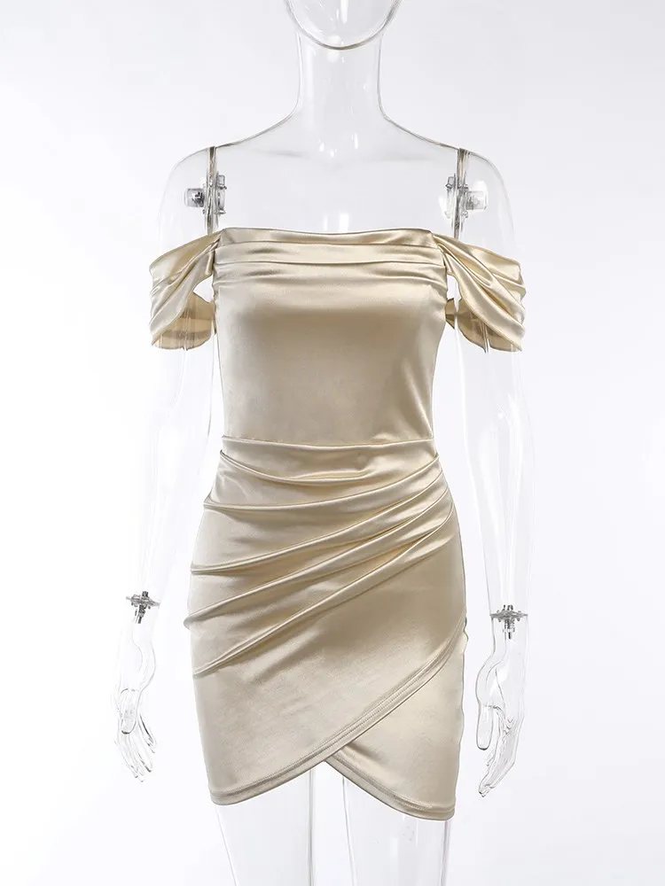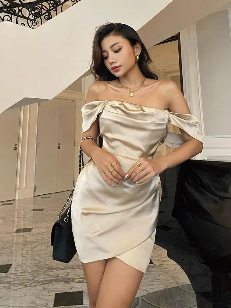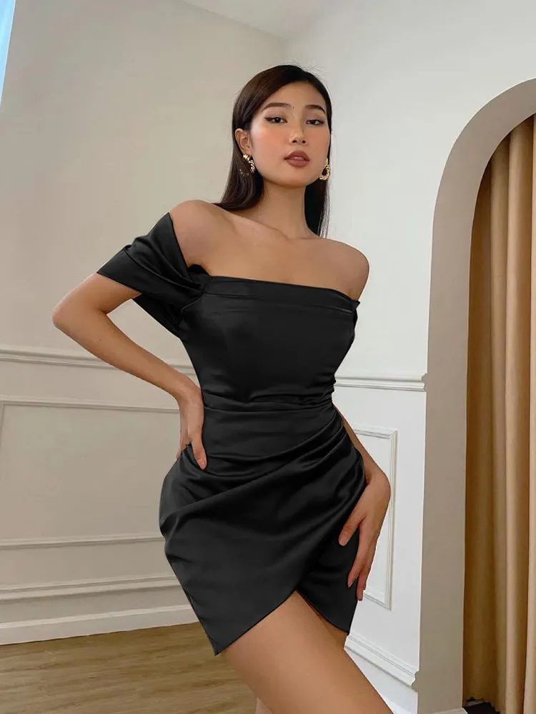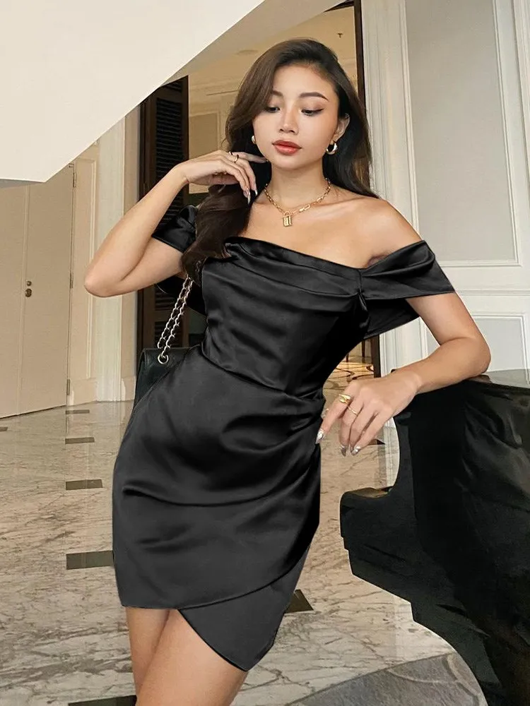 victoria’s vogue Satin Women Folds Mini Dress Off The Shoulder Irregular Summer Dress Tight Sexy Party Prom Old Night Bride Lady Dress
