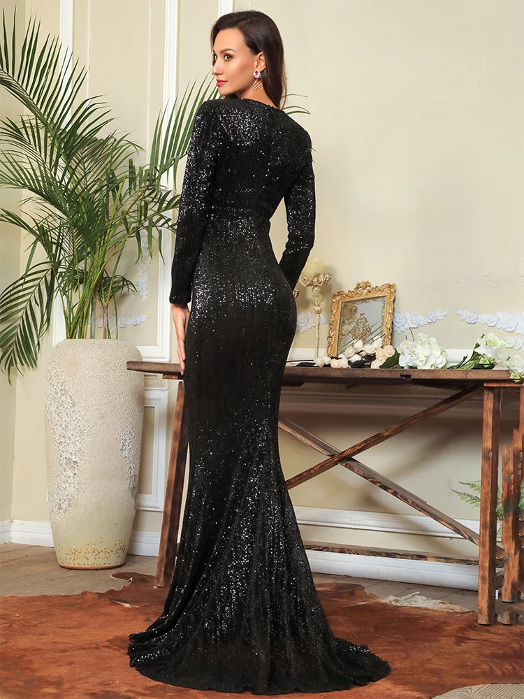 victoria’s vogue Sexy 0-Neck High Waist Elastic Pleated Sequins Fishtail Shape Party Long Dress