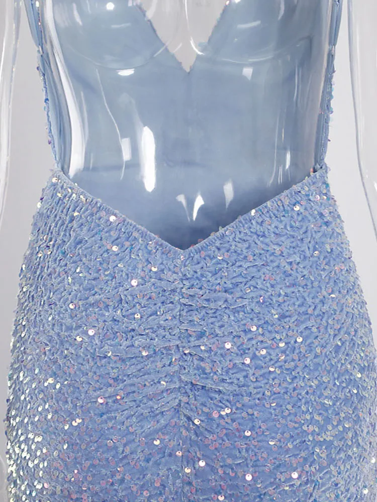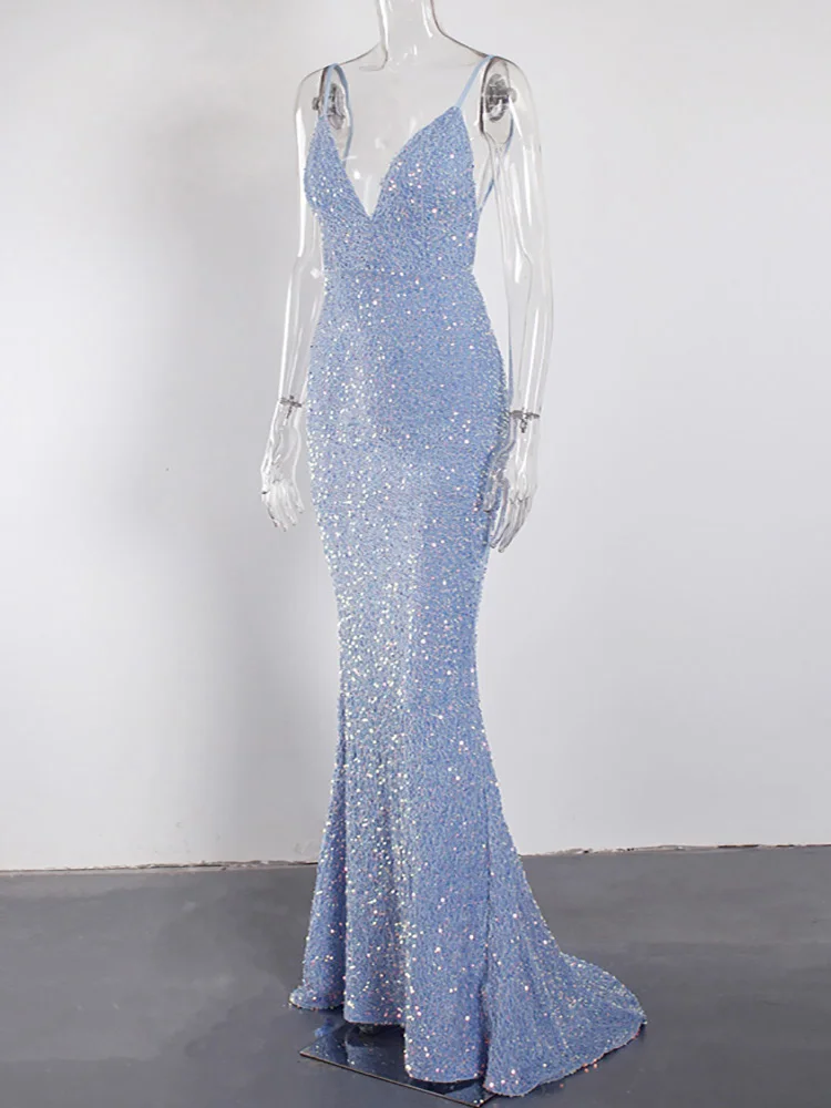 Victorias vogue Sexy Blue Backless Slip Sequin Mermaid Wedding Gown V Neck Sleeveless Velvet Padded Stretch Prom Evening Long Dress Women 2022