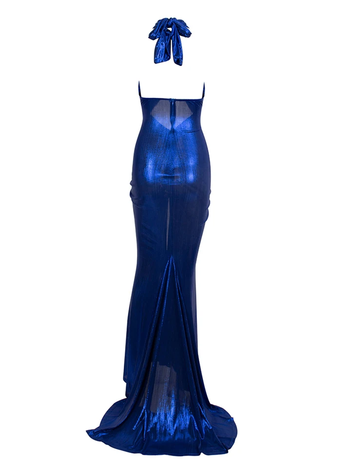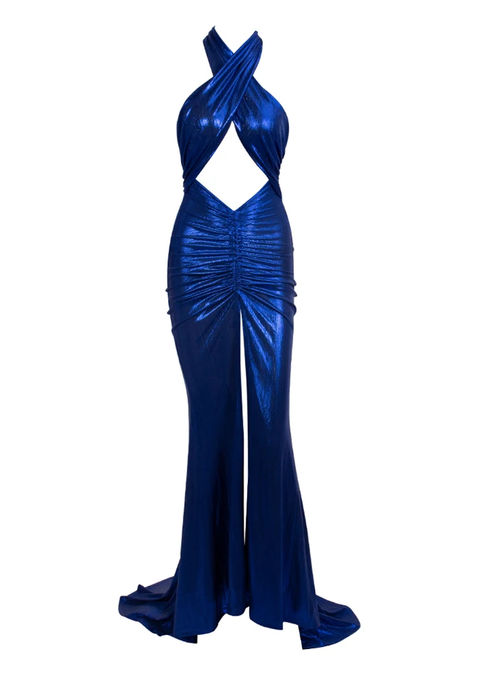 victoria’s vogue Sexy Blue Cross Straps Cut Out Drawstring Decoration Glitter Print Fabric Bodycon Maxi Reflective Dress