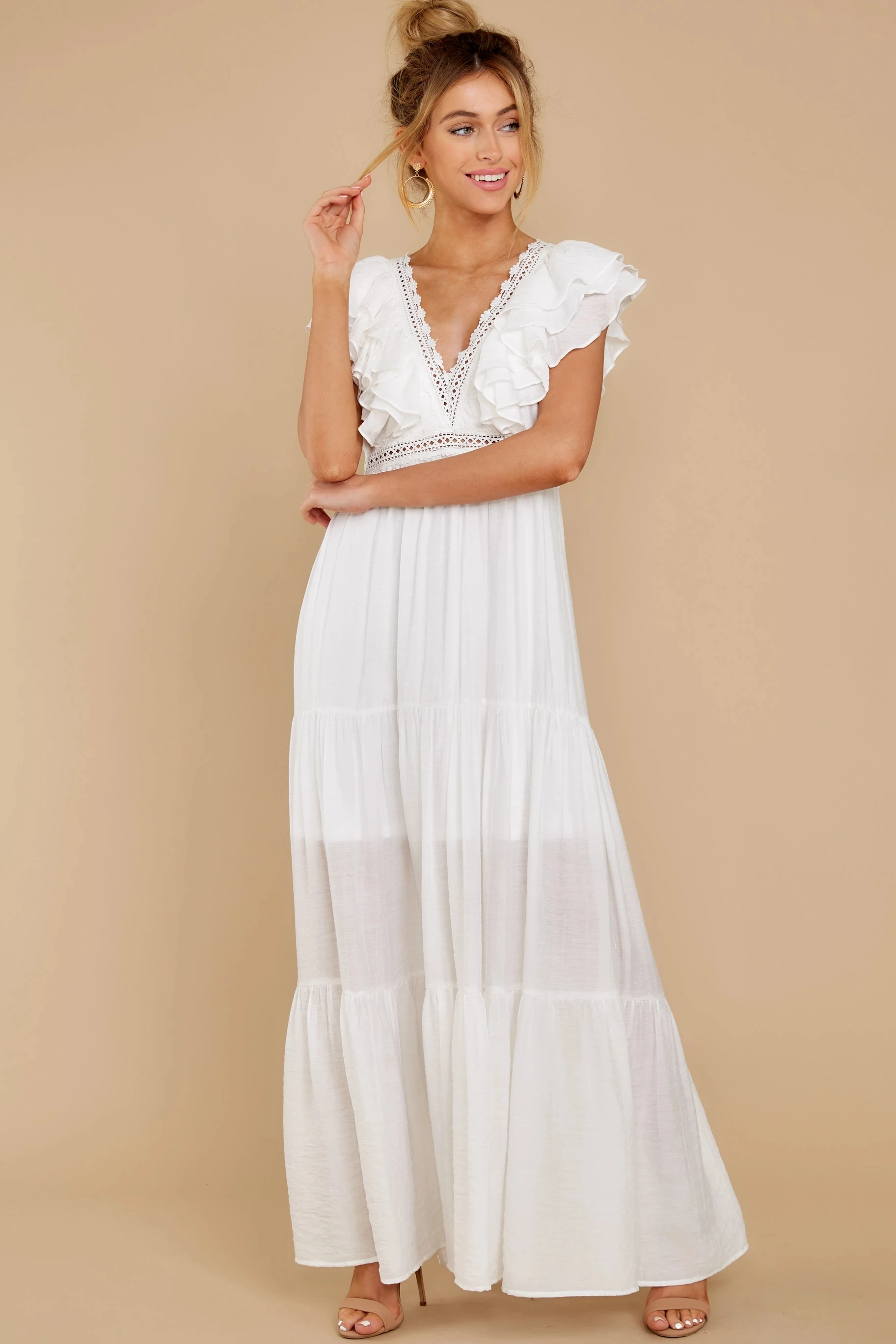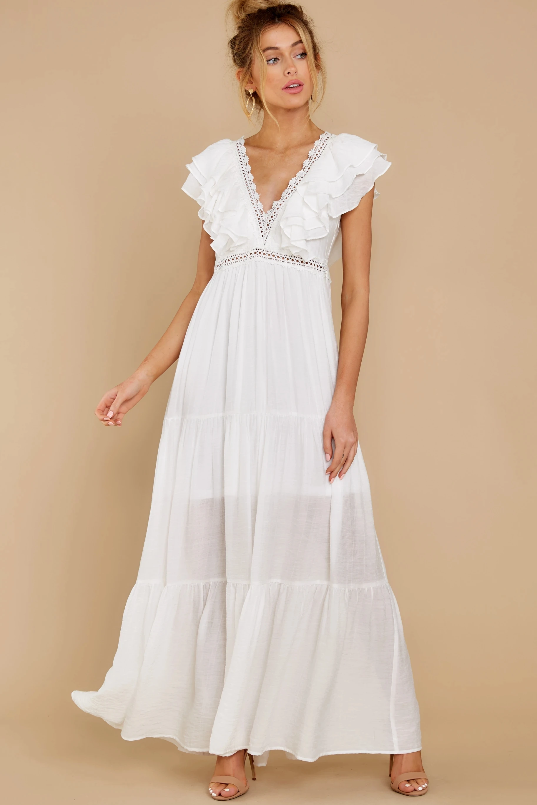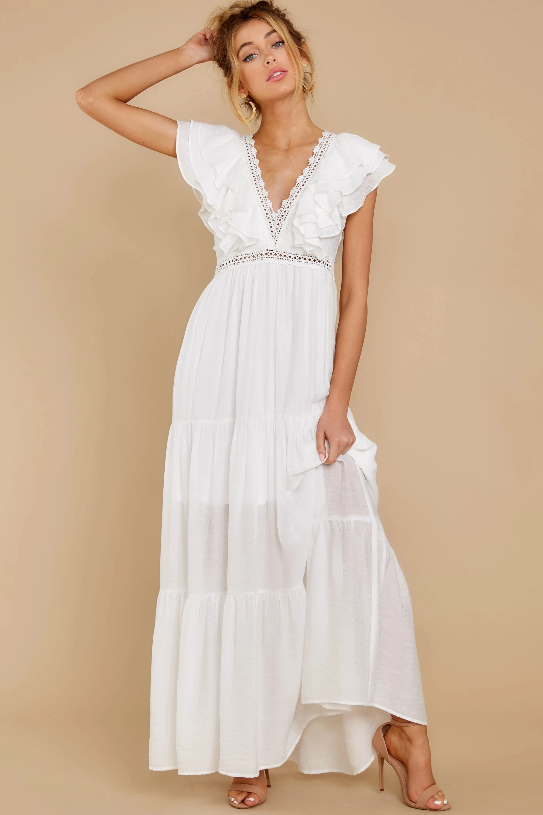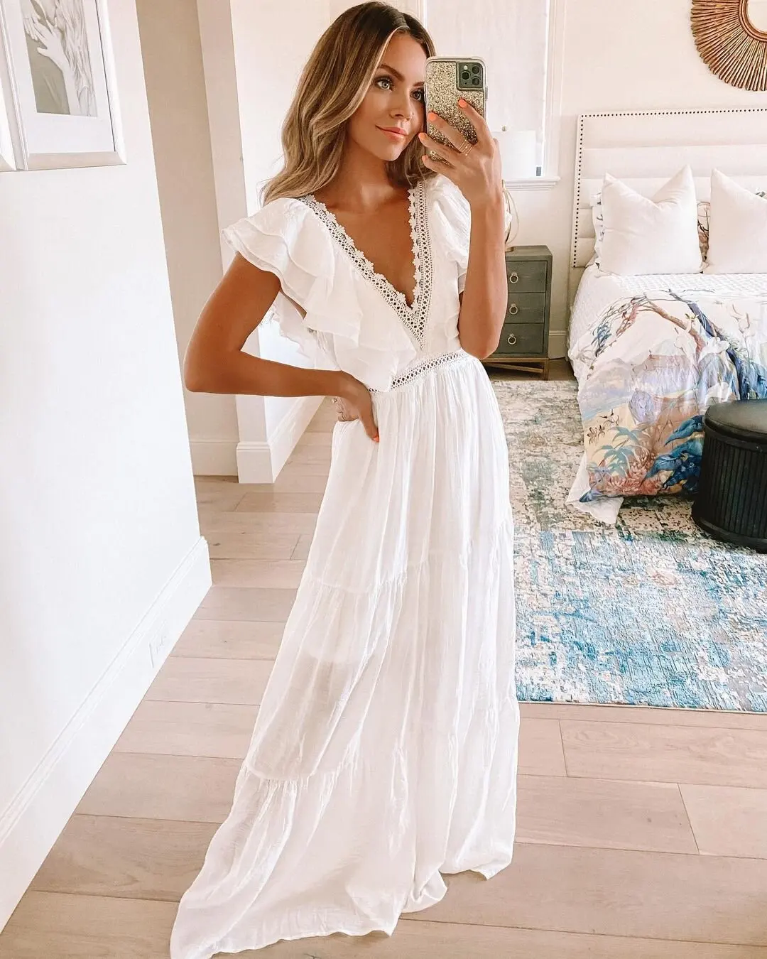 victoria’s vogue Sexy Deep V-neck Butterfly Sleeve Maxi Dress White High Waist Mid-length A-line Dress Casual Women Summer Holiday Dress