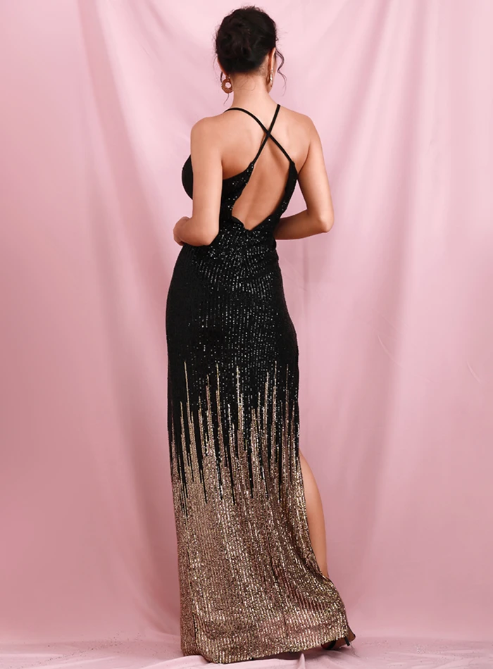 victoria’s vogue Sexy Deep V-Neck Open Back Black Gradient Sequins Side Split Party Maxi Drress