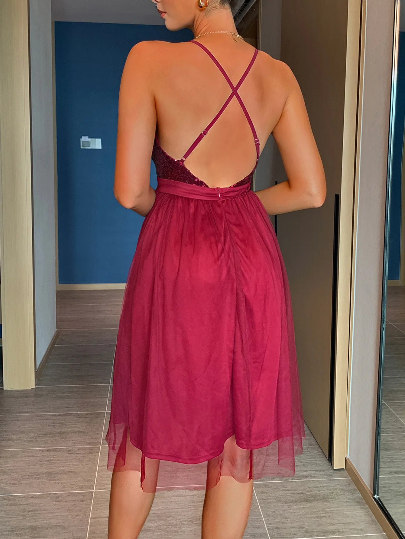 victoria’s vogue Sexy deep v-neck spaghetti straps backless summer sequin party dress Patchwork women mesh mini dresses Elegant vestidos