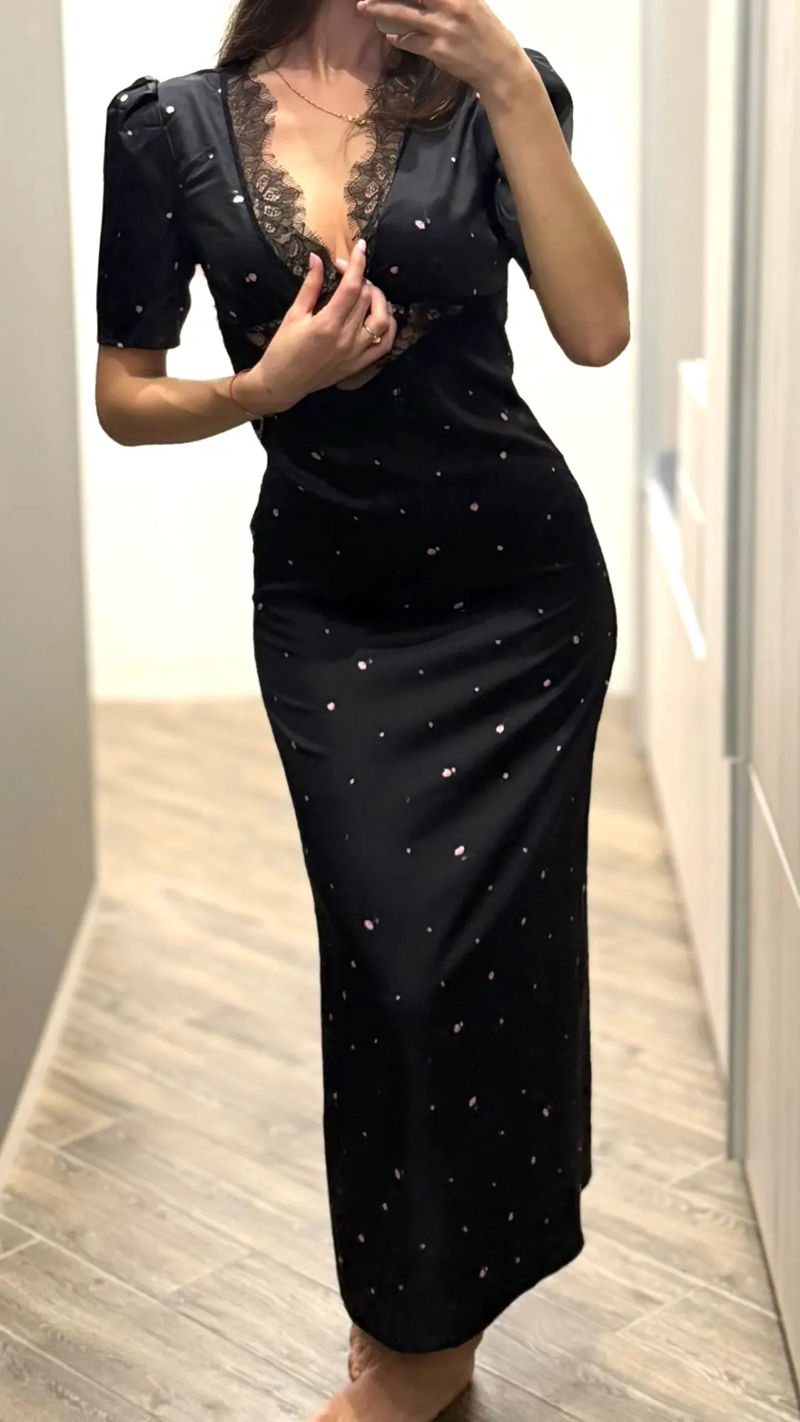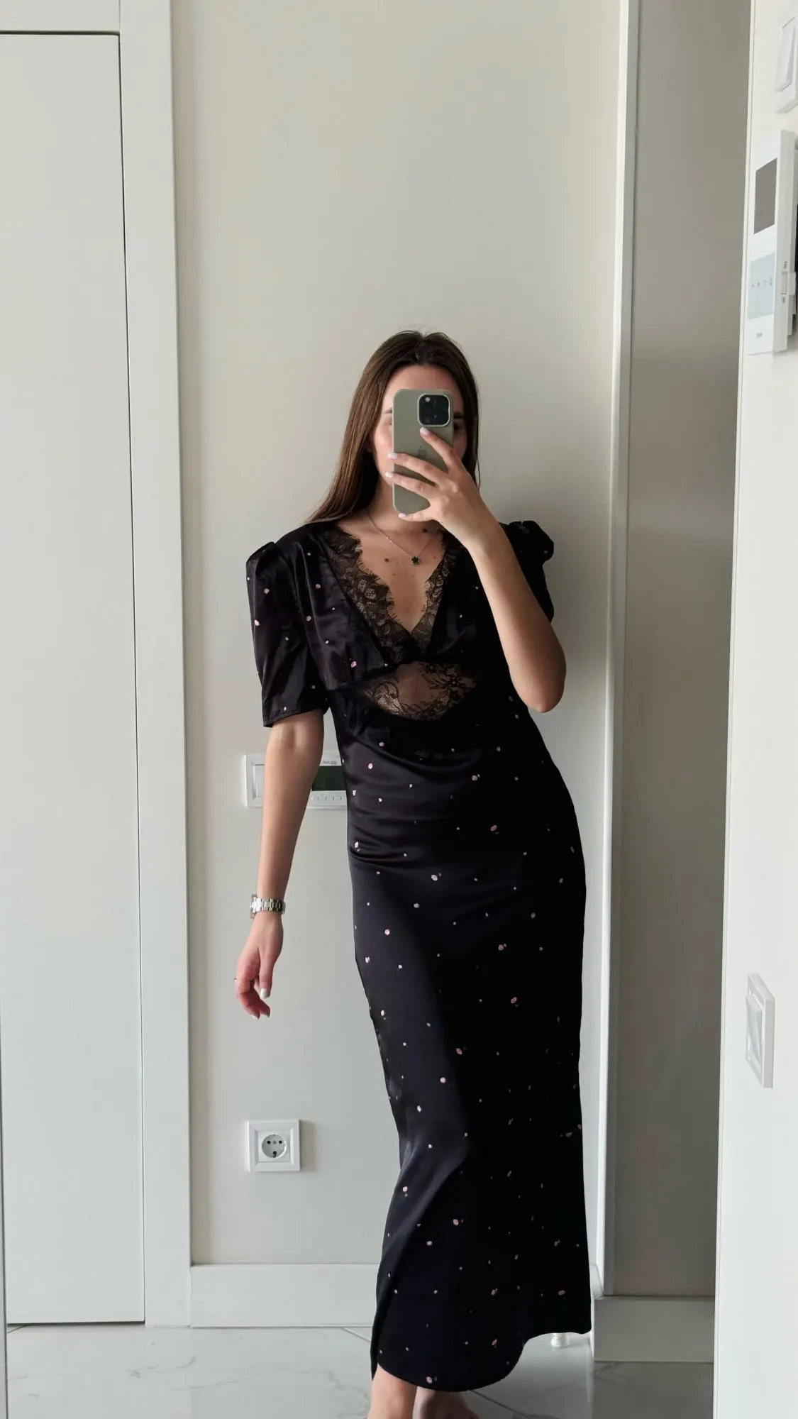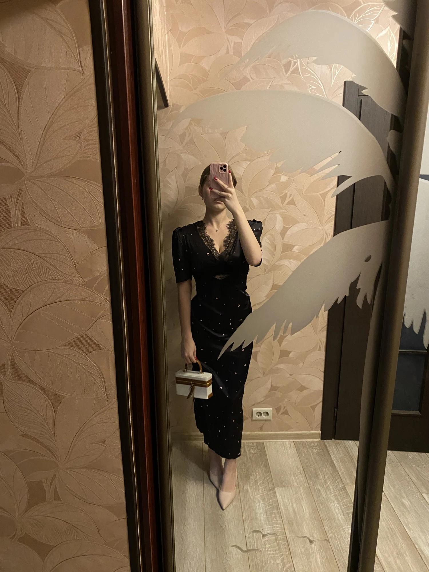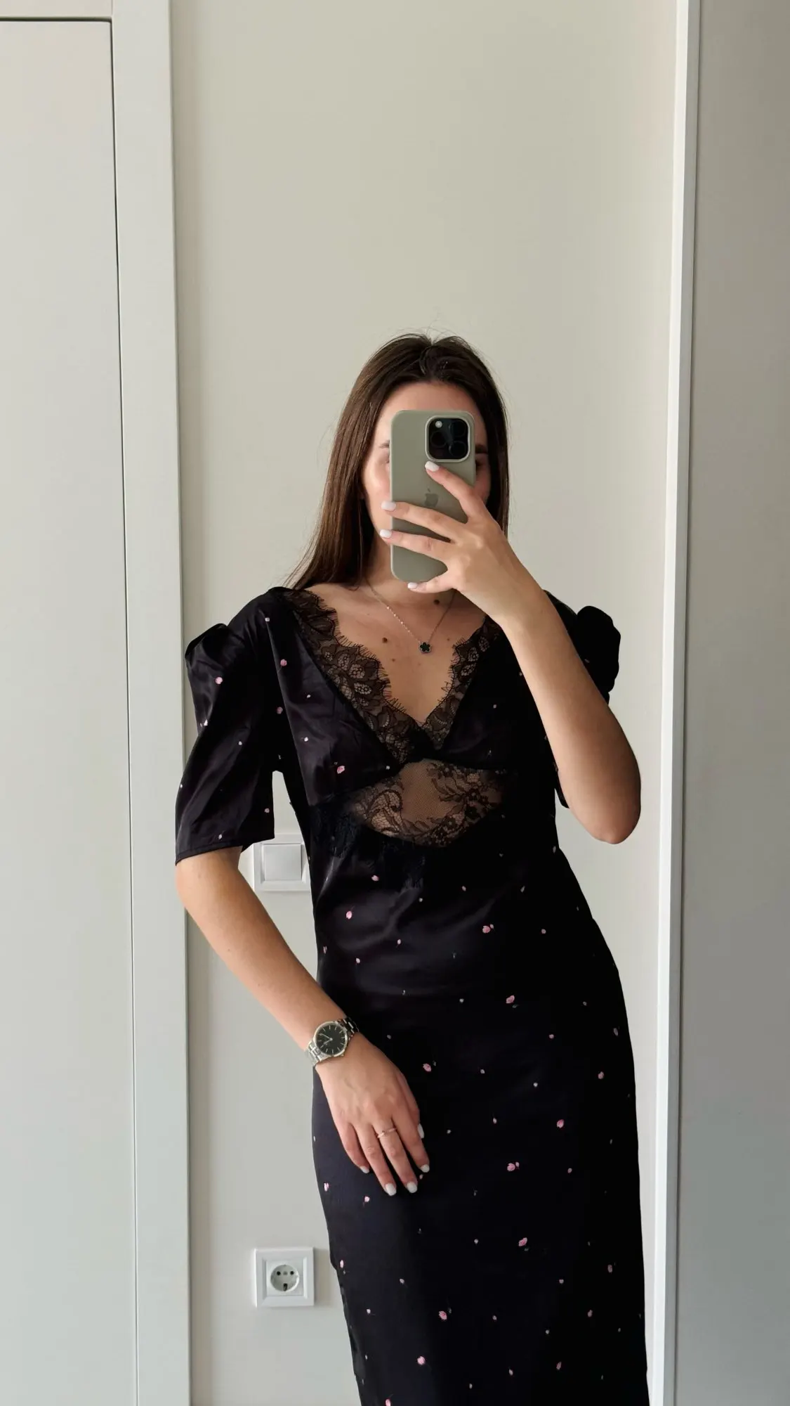 Платье просто супер! Черное атласное, с красивыми кружевными вставками — смотрится очень женственно и действительно дорого. По фигуре сидит идеально, на рост 170 см длина как раз. Размерная сетка полностью соответствует. Ткань легкая, летящая, после стирки не линяет и не скатывается. Прошито аккуратно, без торчащих ниток. Доставка в Украину заняла около 3 недель. Очень красивое и эффектное платье — я в восторге!
