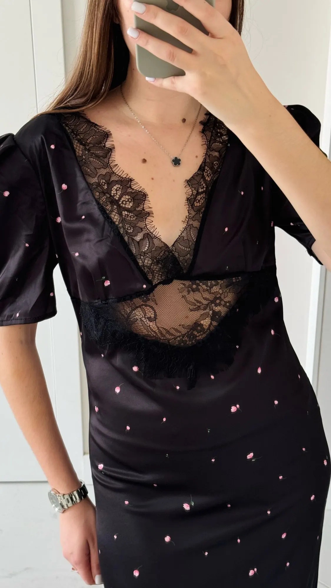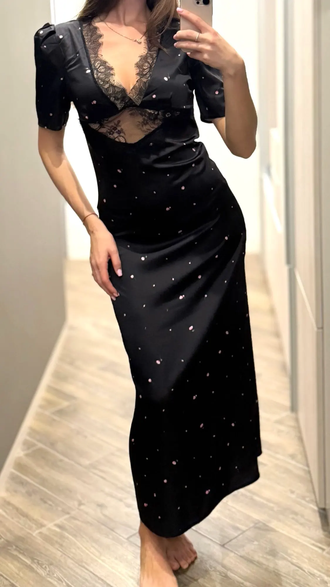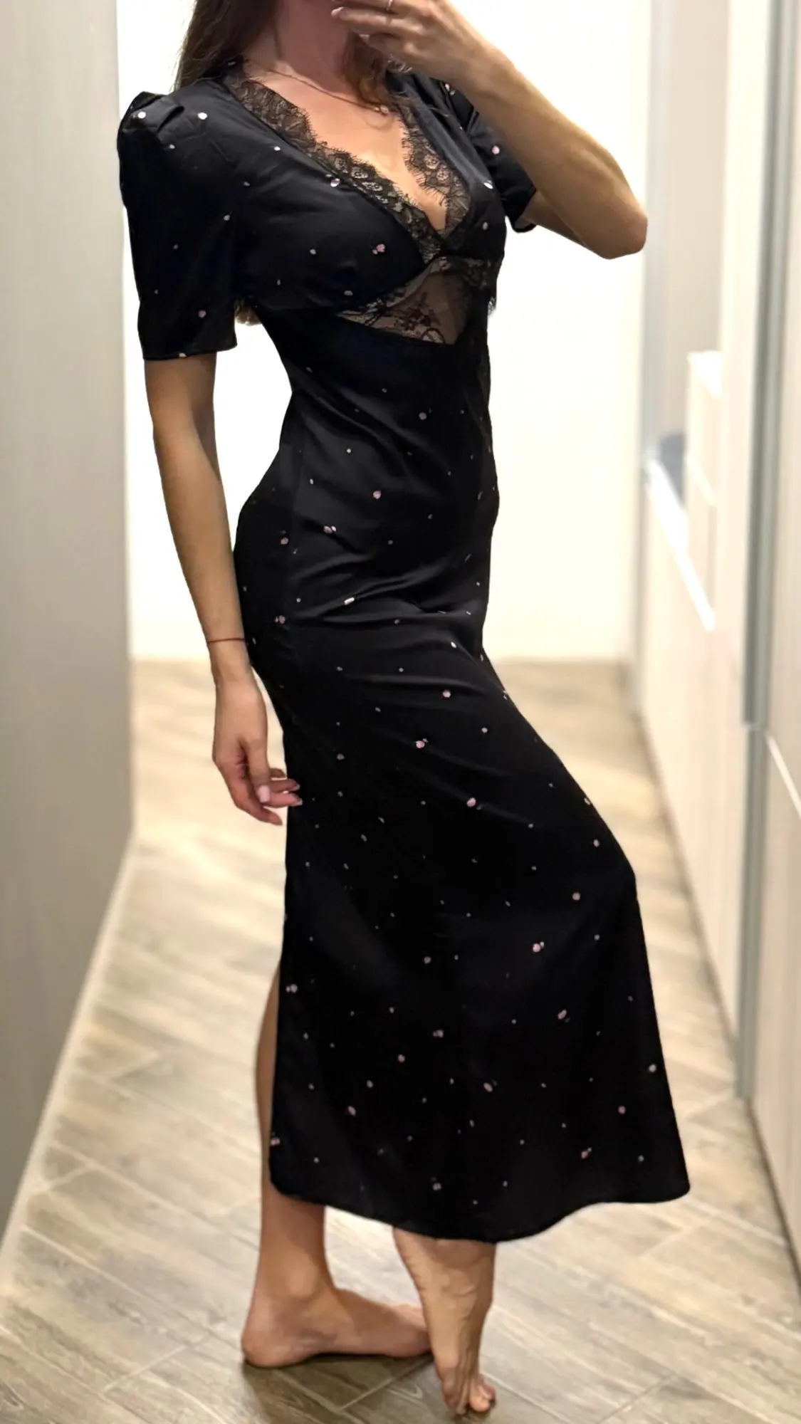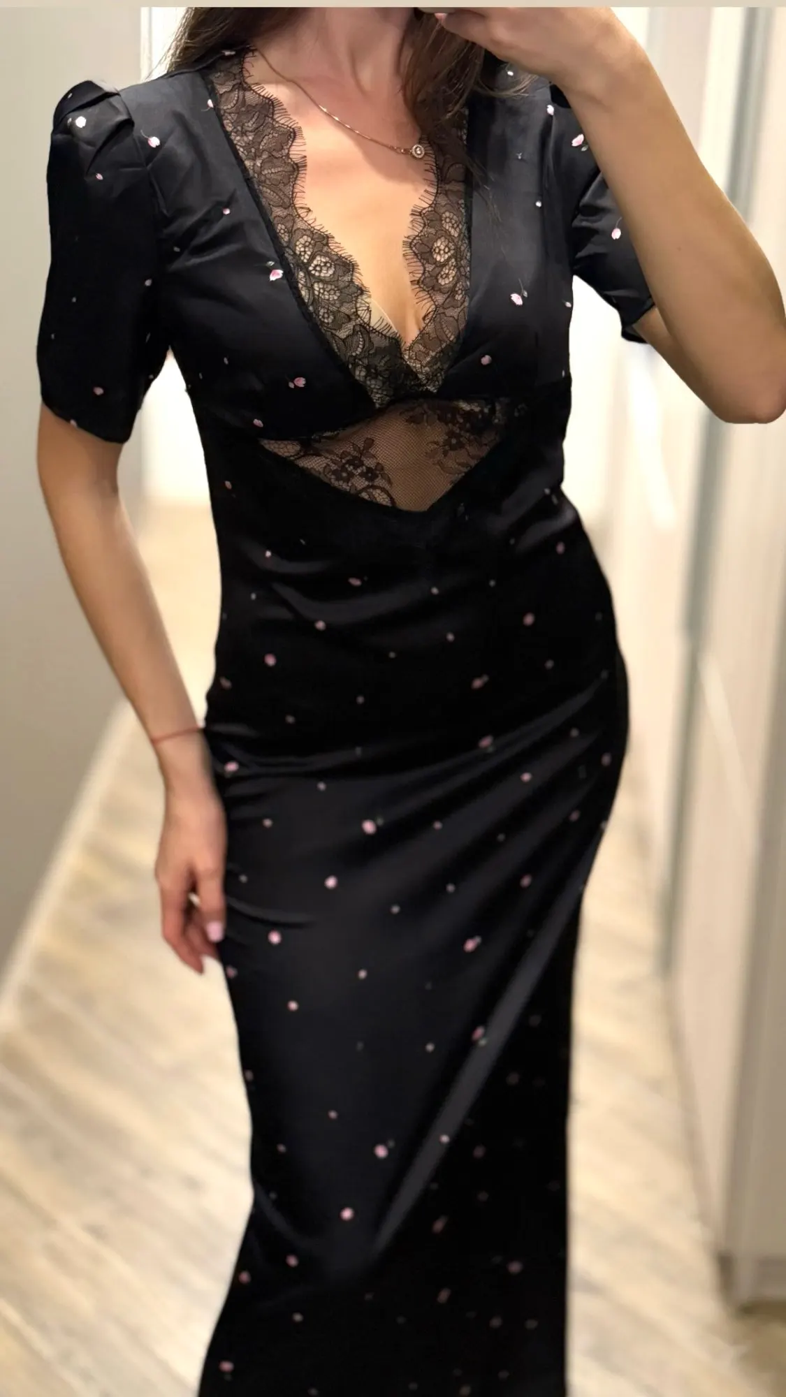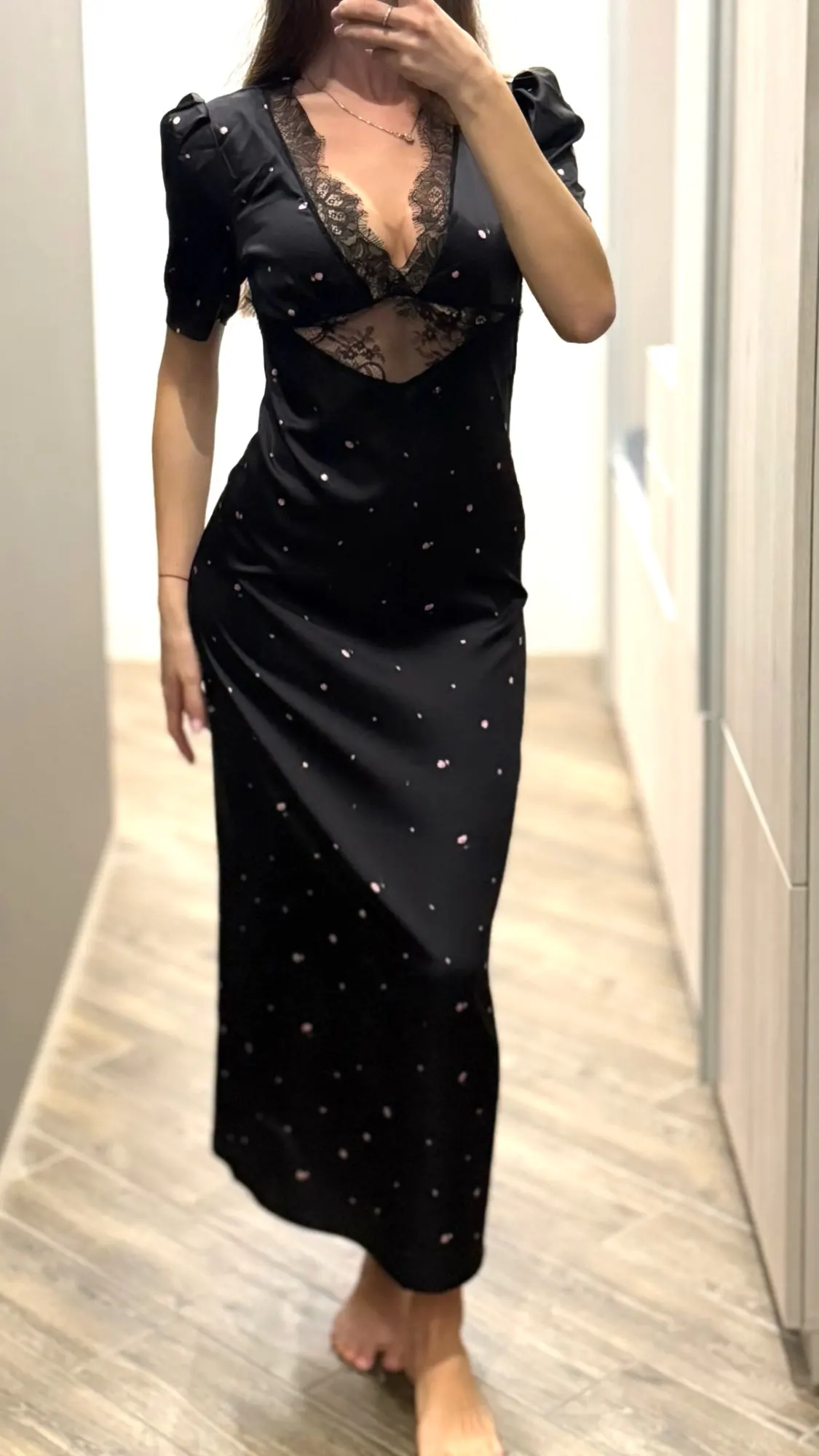 Платье просто супер! Черное атласное, с красивыми кружевными вставками — смотрится очень женственно и действительно дорого. По фигуре сидит идеально, на рост 170 см длина как раз. Размерная сетка полностью соответствует. Ткань легкая, летящая, после стирки не линяет и не скатывается. Прошито аккуратно, без торчащих ниток. Доставка в Украину заняла около 3 недель. Очень красивое и эффектное платье — я в восторге!