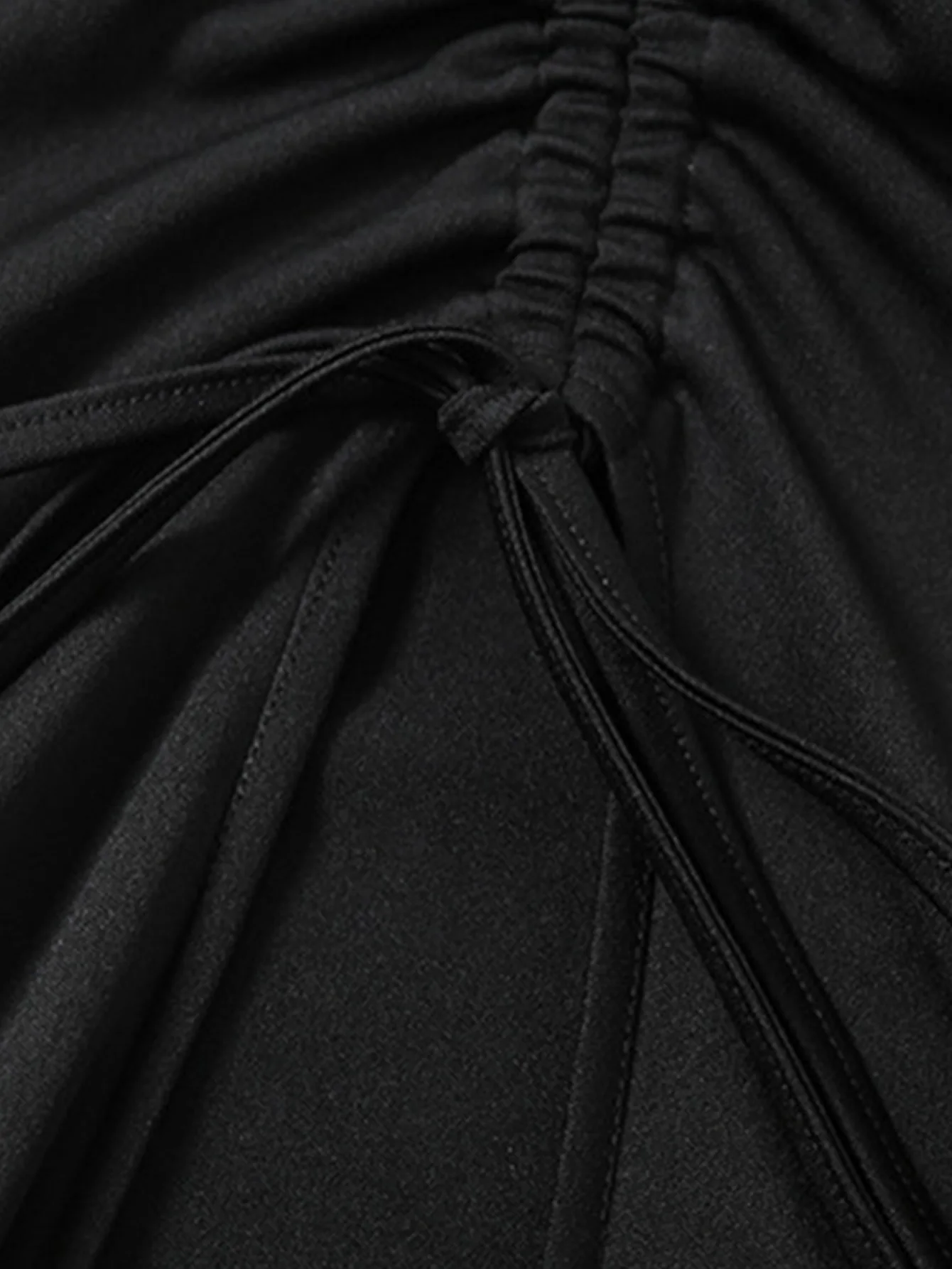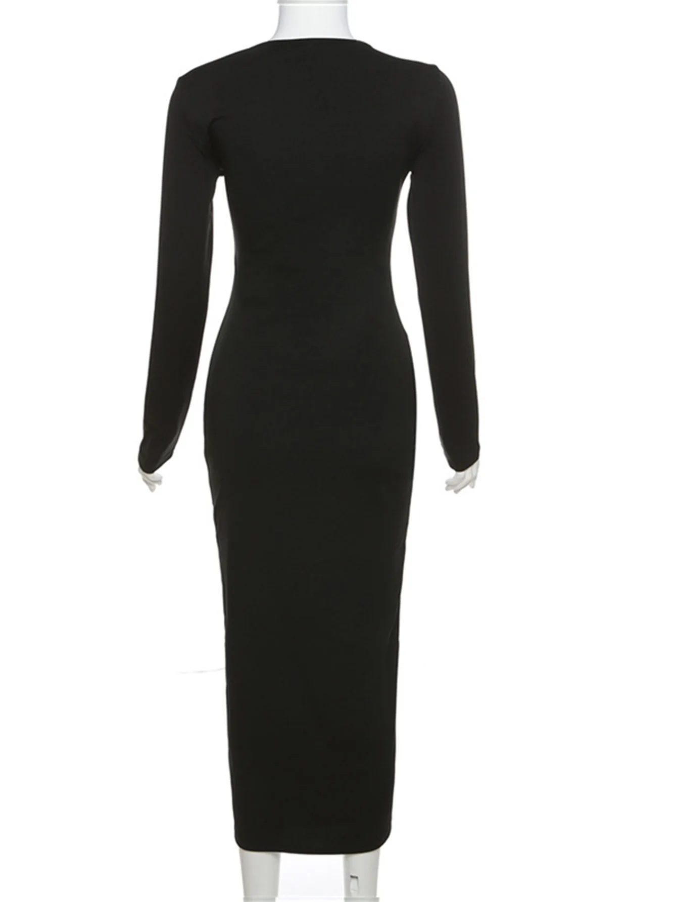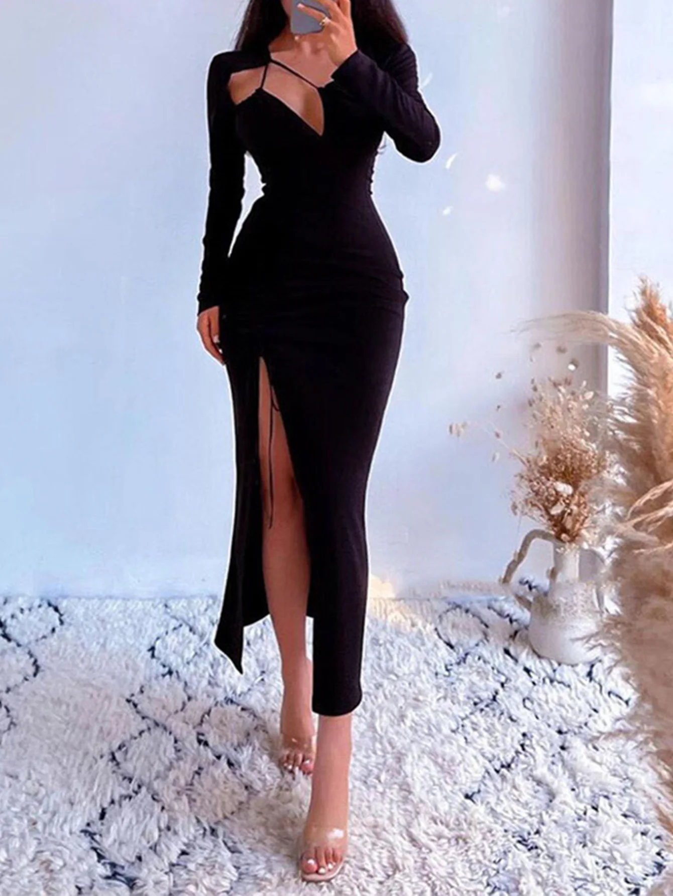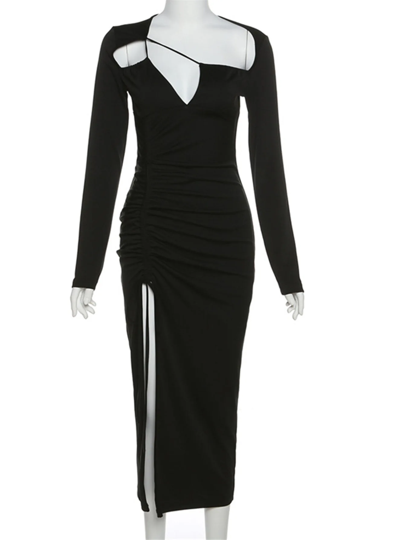 victoria’s vogue Sexy irregular v-neck women party dress black Club shirring split maxi dress Skinny long sleeve fashion vestido 2021