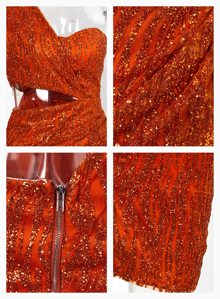 victoria’s vogue Sexy Orange Cut Out Single Sleeve Glitter Glue Bead Material Bodycon Party Dress