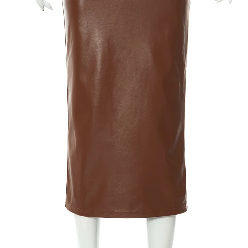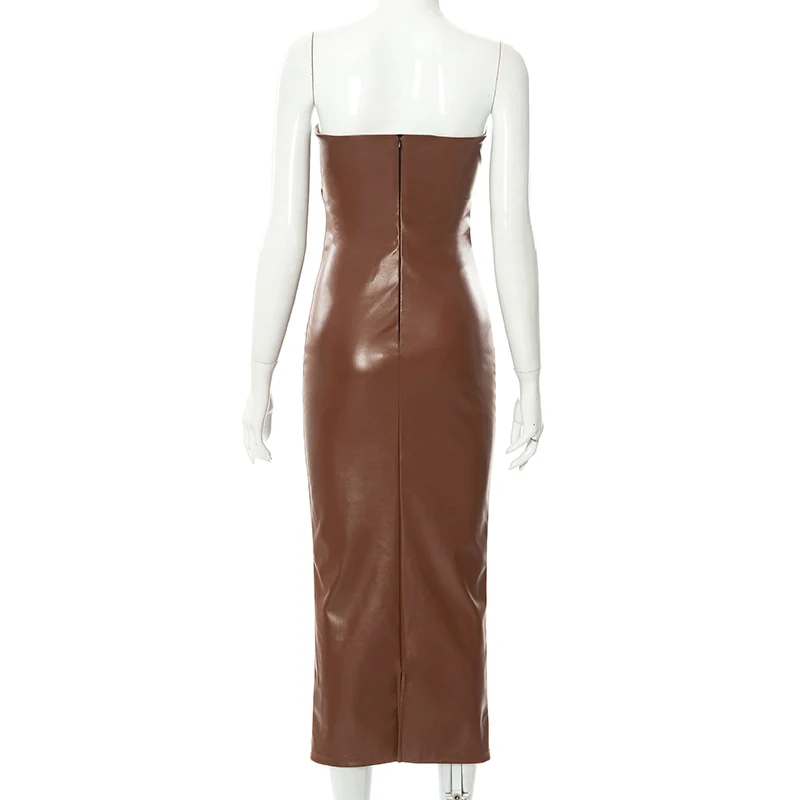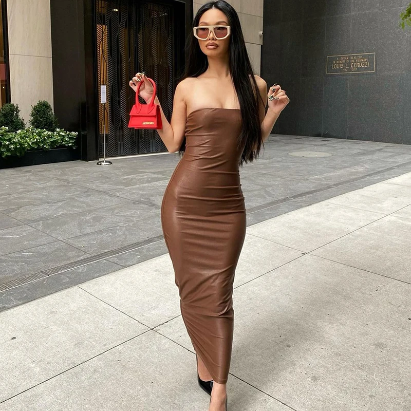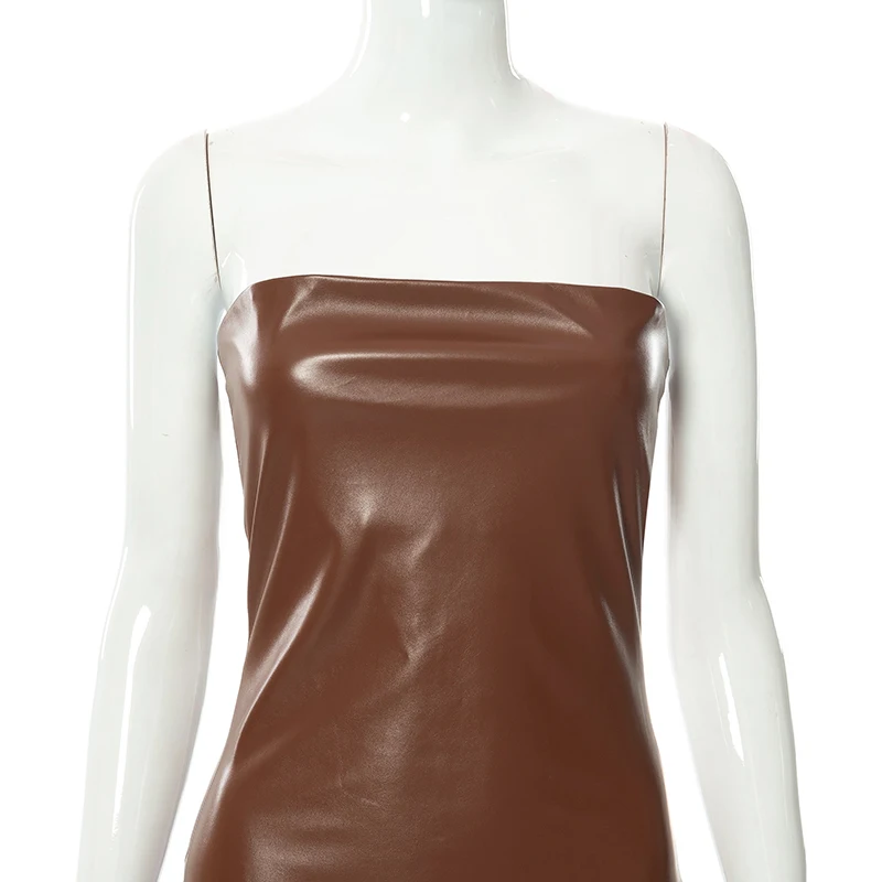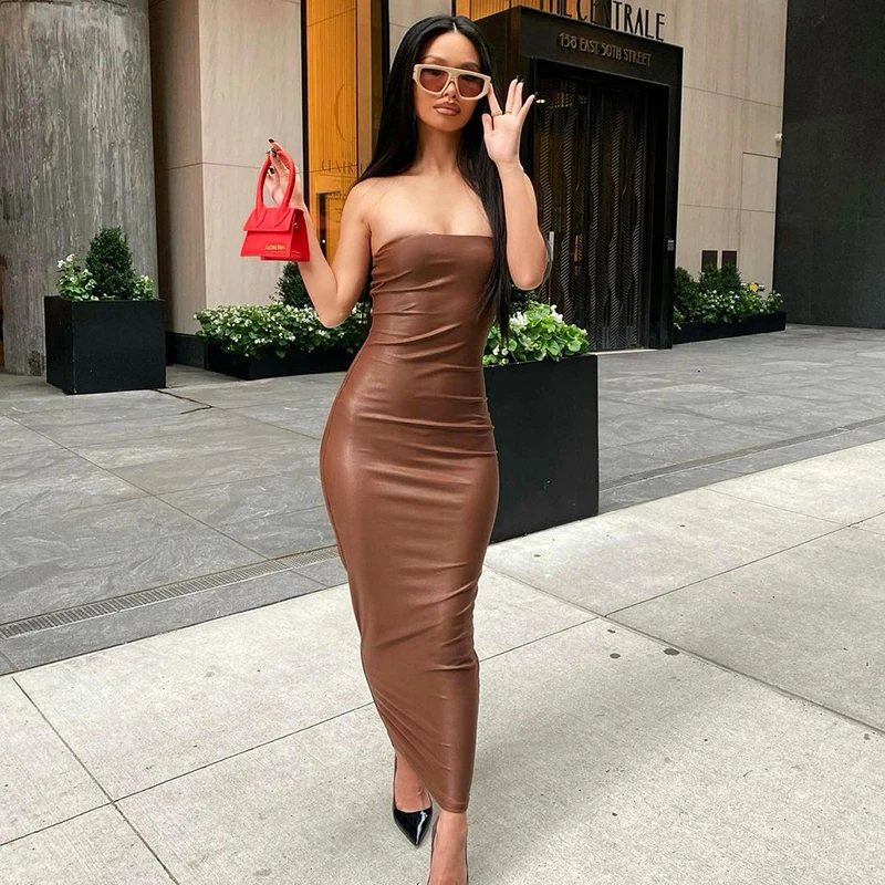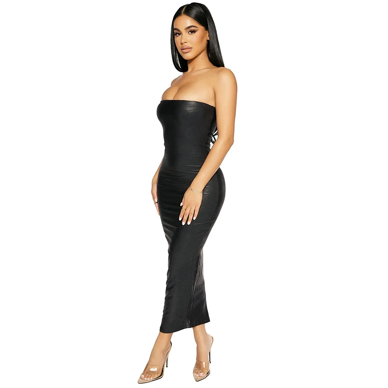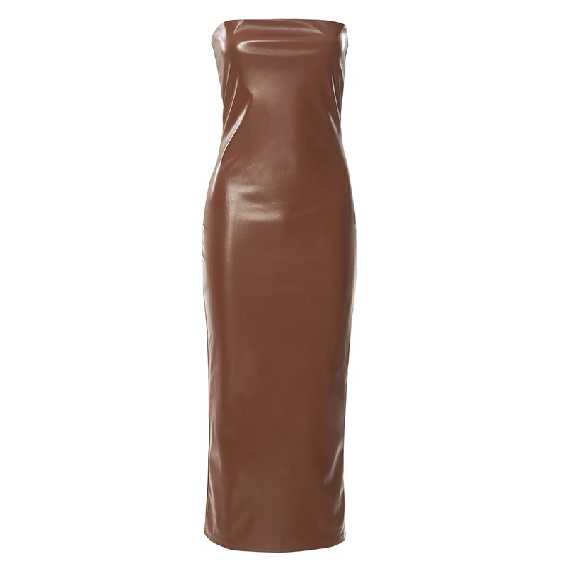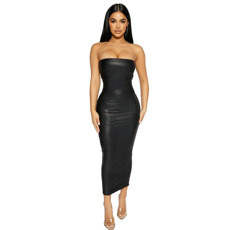 victoria’s vogue Sexy Party Club Bodycon Dresses For Women 2022 Autumn Solid Strapless PU Zippers Midi Dress Female Streetwears