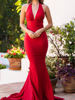 victoria’s vogue Sexy Red Summer Floor Length Evening Party Mermaid Dress Deep V Neck Halter Sleeveless BacklessRuched Hollow Out Stretch