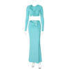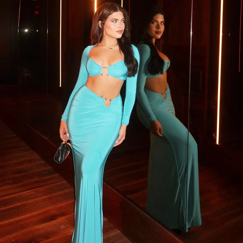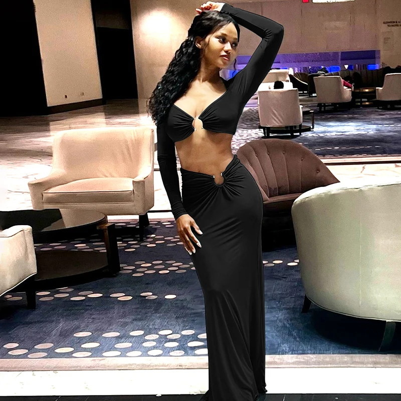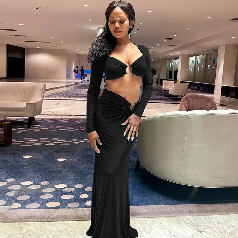 Victoria’s Vogue Sexy Skirt Two Piece Sets Women V Neck Long Sleeve T-shirt And Maxi Skirt Femme Metal Buckle Slim Fit Two Piece Sets