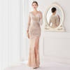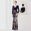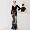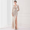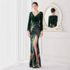 victoria’s vogue Sexy Slit Green Velour Evening Dress Women Long Sleeve Dress Deep V Neck Sequin Party Prom Dress