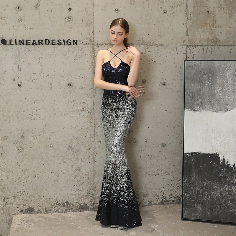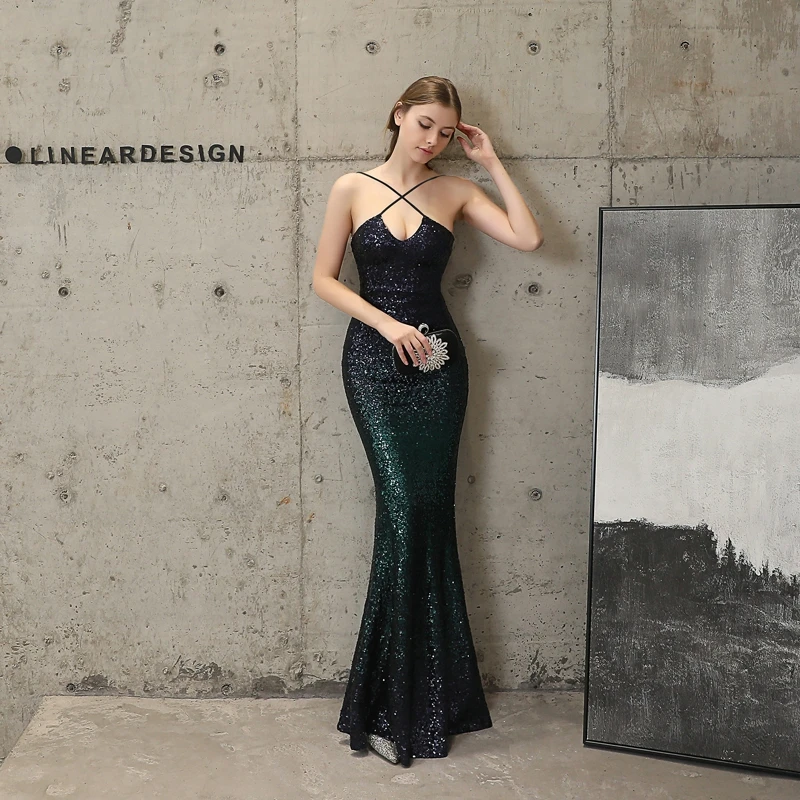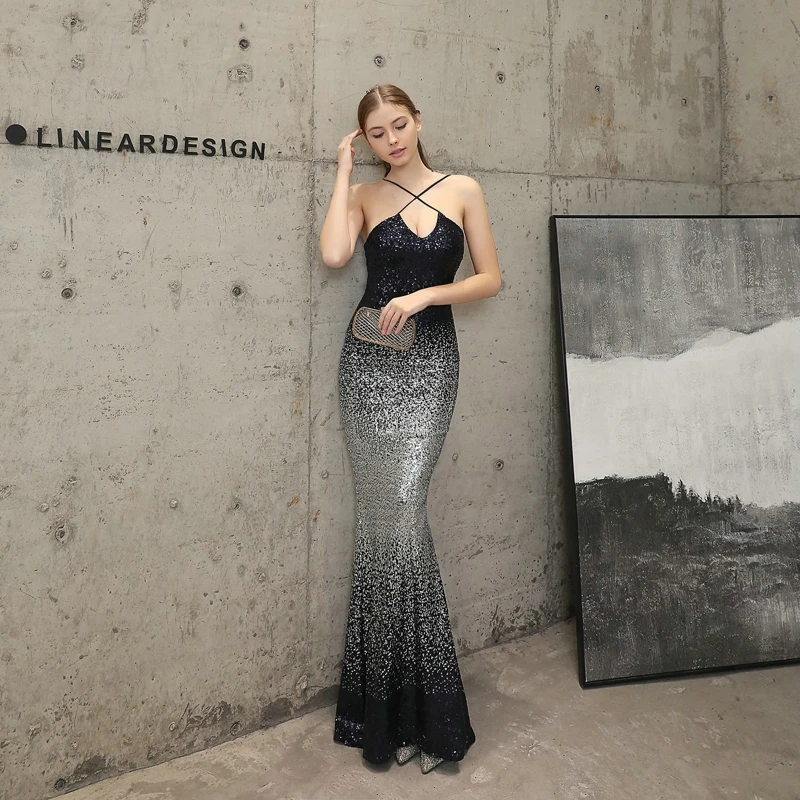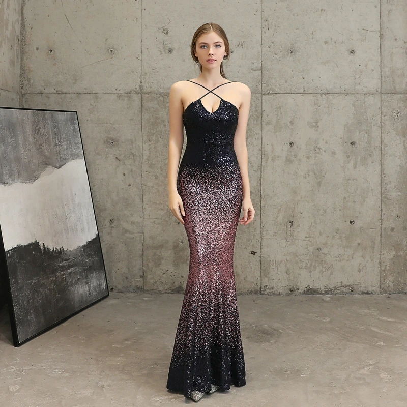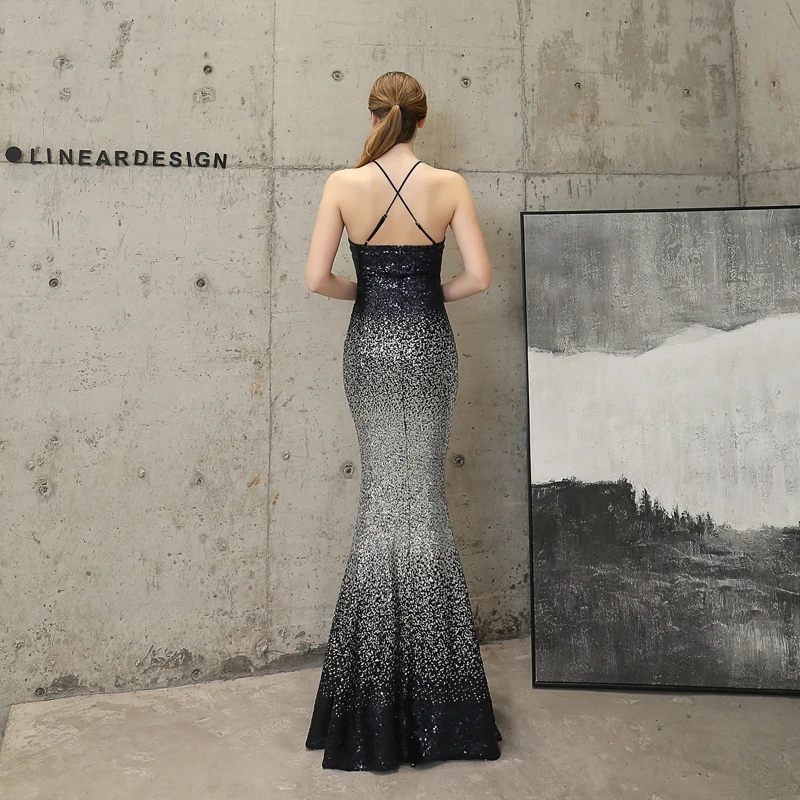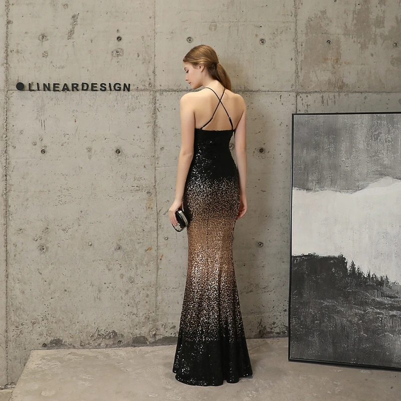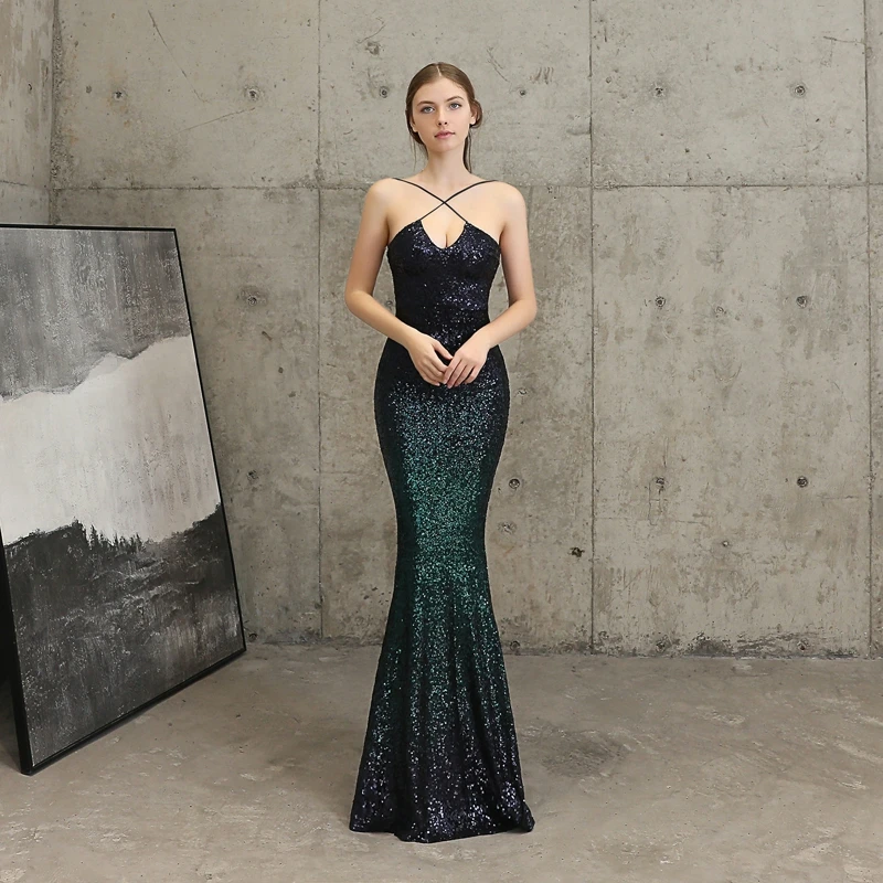 victoria’s vogue Sexy Strap Cross Back Sequins Evening Dress Backless Long Evening Party Dress