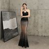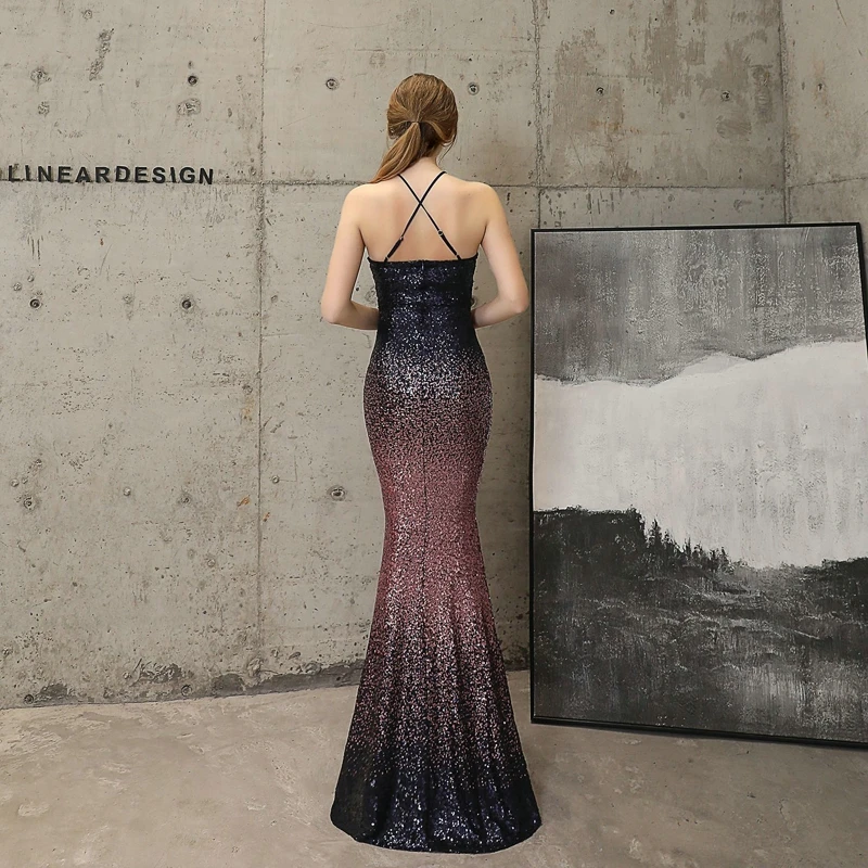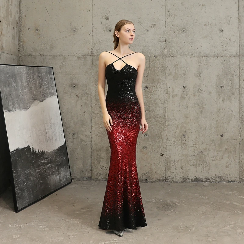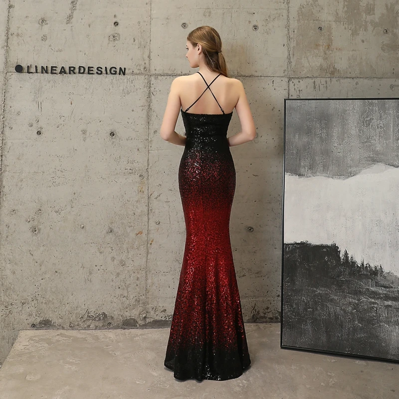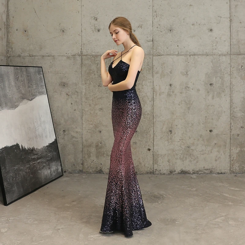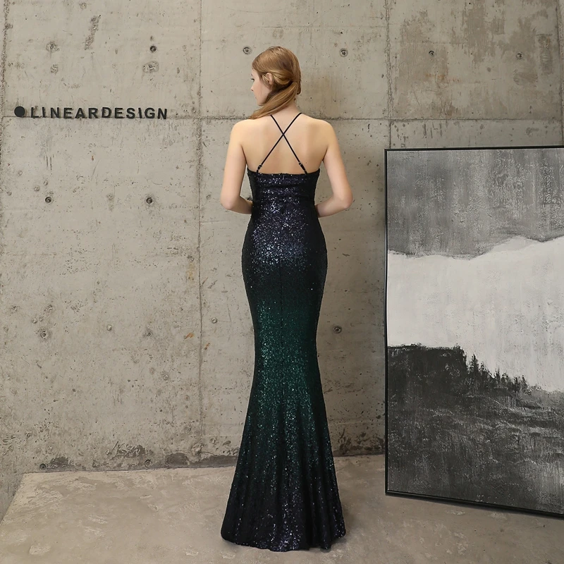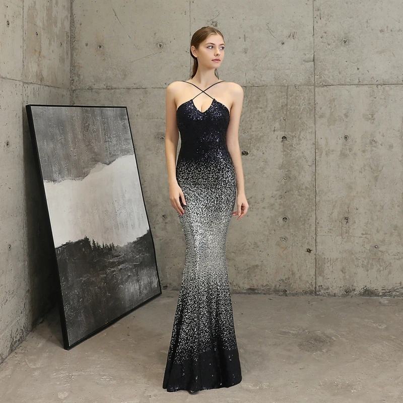 victoria’s vogue Sexy Strap Cross Back Sequins Evening Dress Backless Long Evening Party Dress