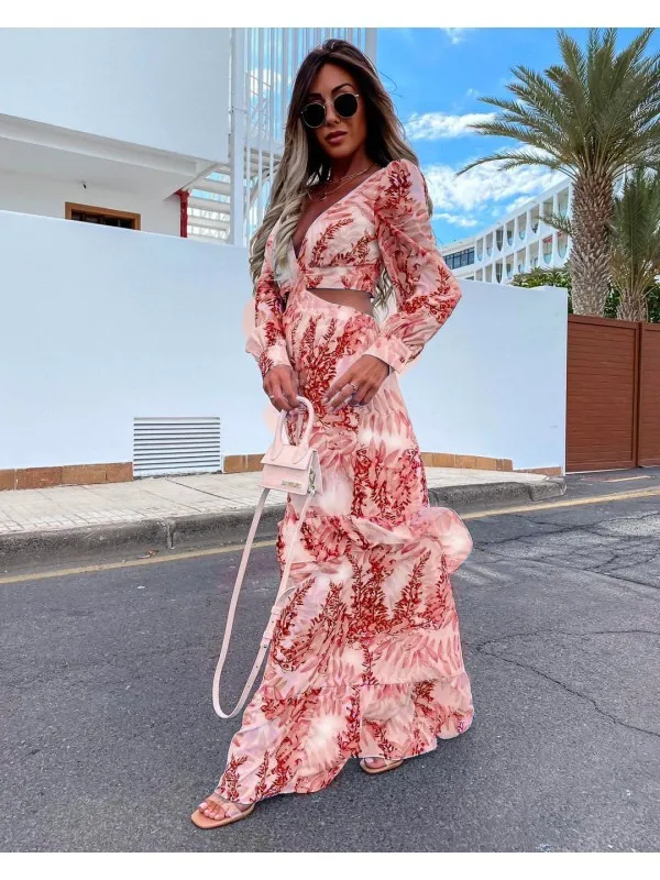 victoria’s vogue Sexy V-Neck Backless Hollow Out Dress Summer Women Long Lantern Sleeve Club Party Long Maxi Dresses