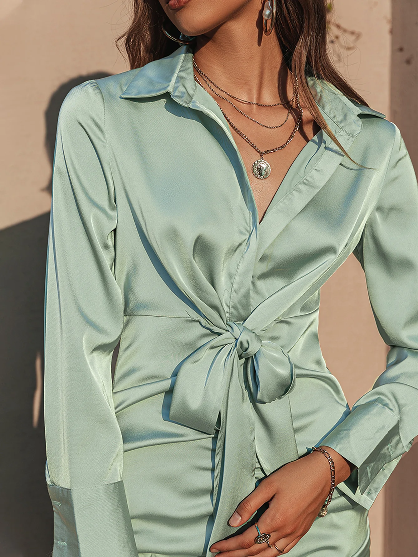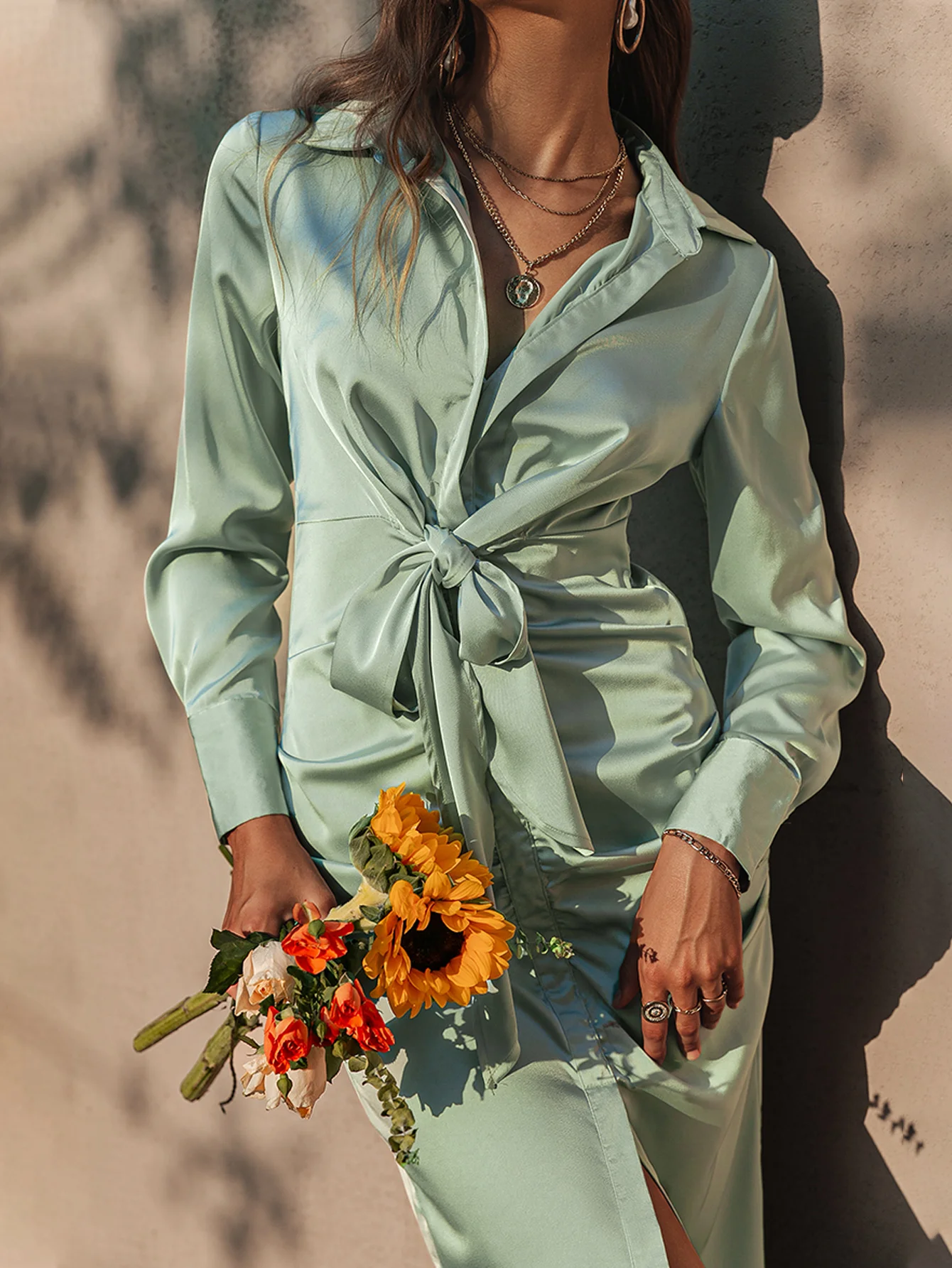victoria’s vogue Sexy v-neck knot long sleeve lace up women dress Elegant slim satin lapel split frills maxi vestido Female green dresses