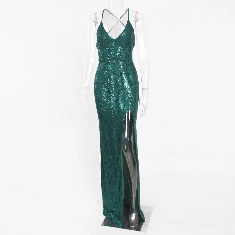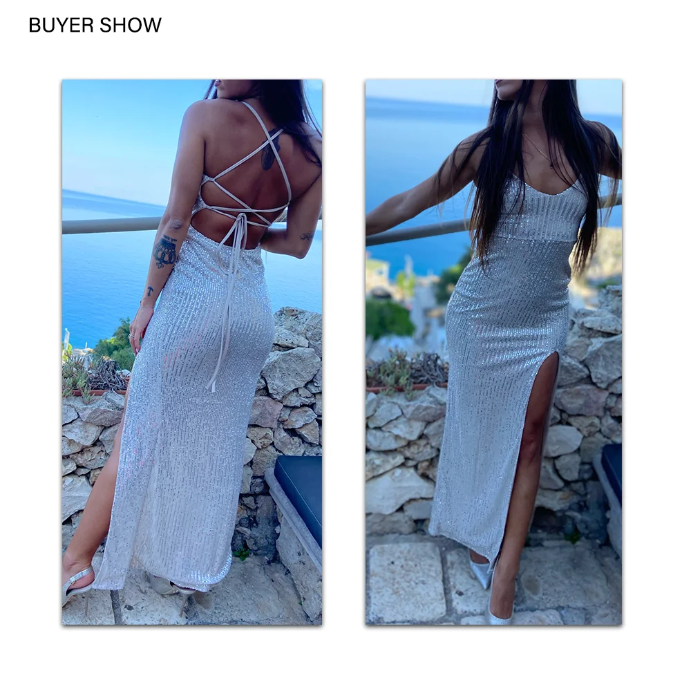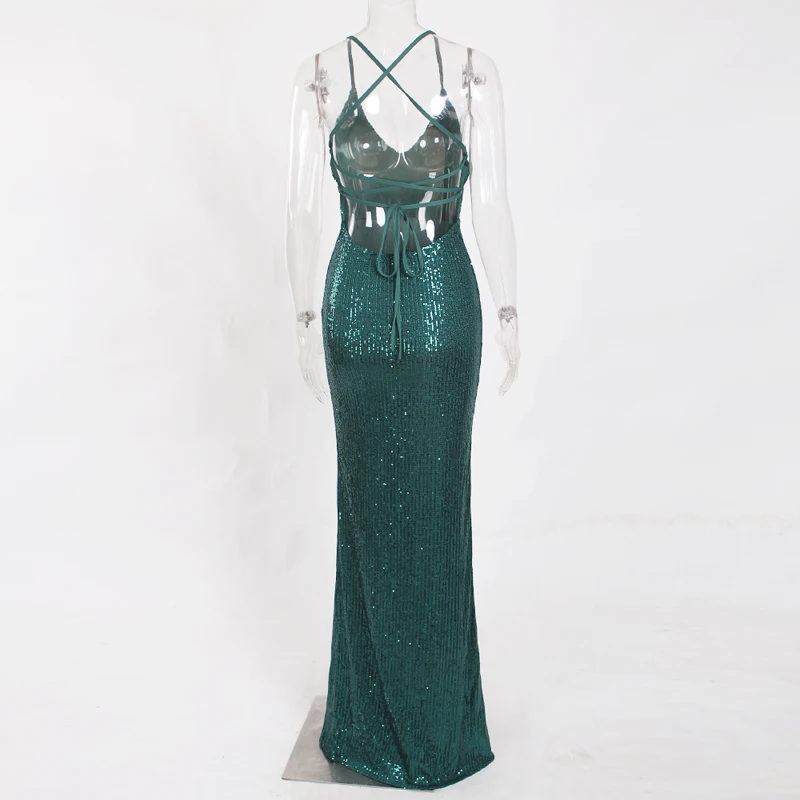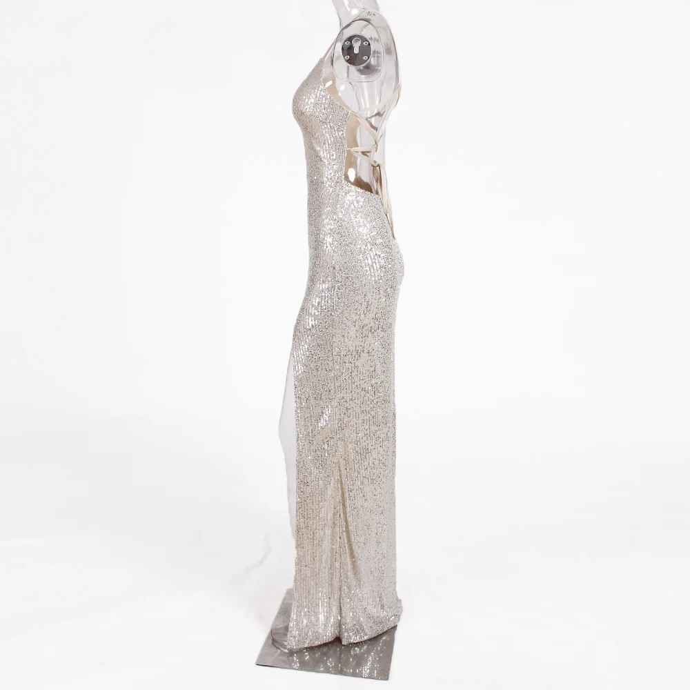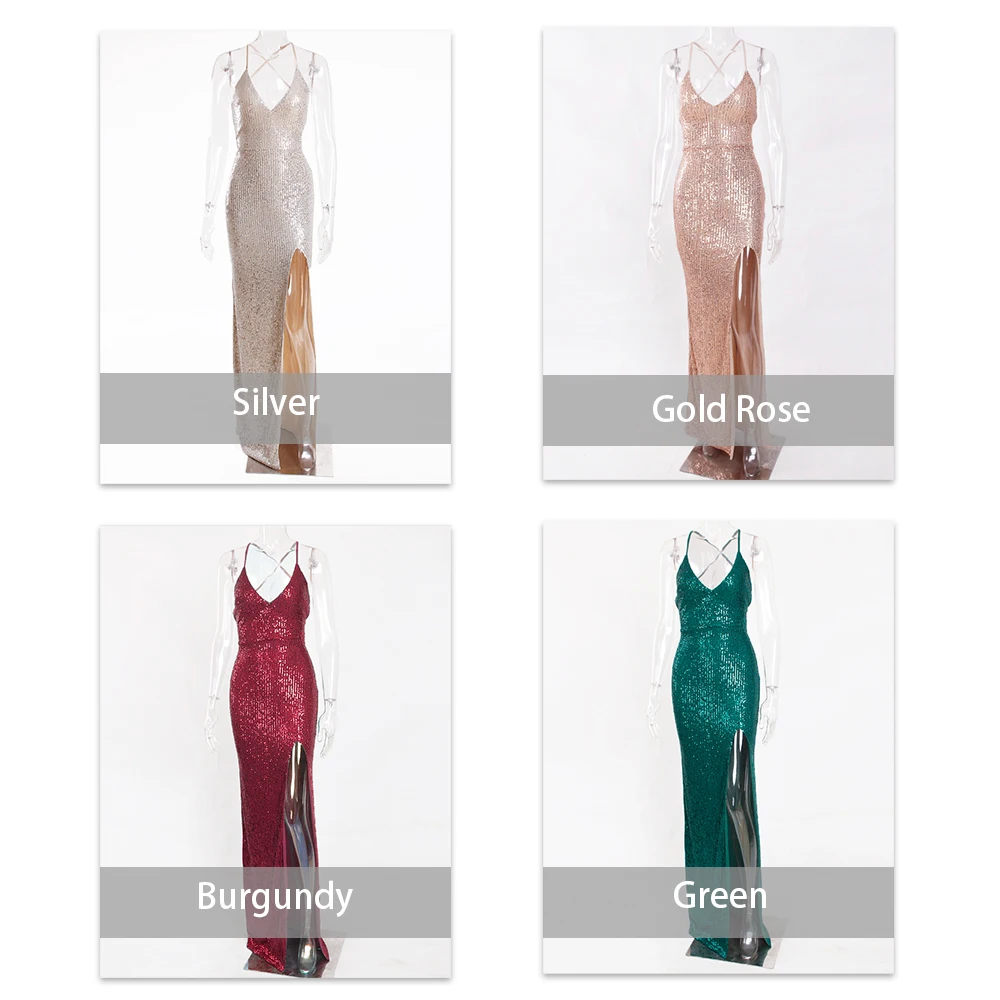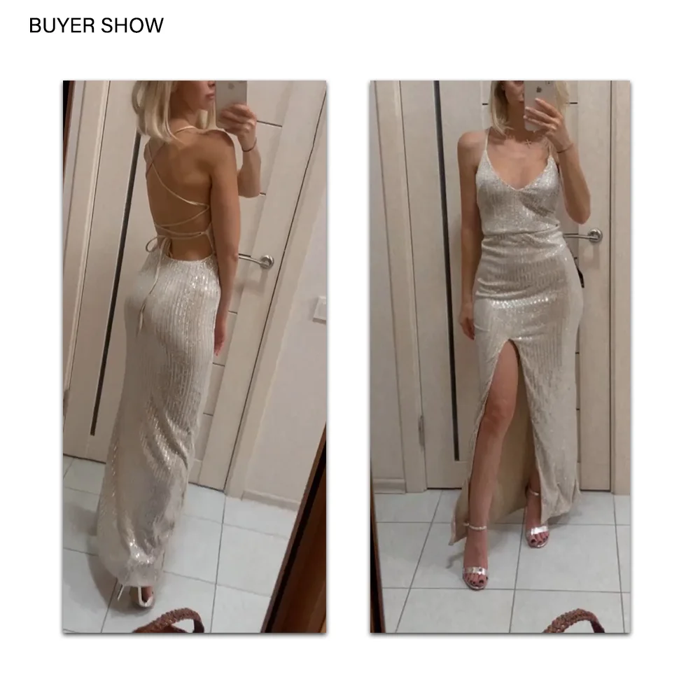 Victorias vogue Sexy V Neck Lace Up Sequined Cocktail Party Dress Backless Split Leg Sleeveless Summer Long Dresses Evening Wedding Gown