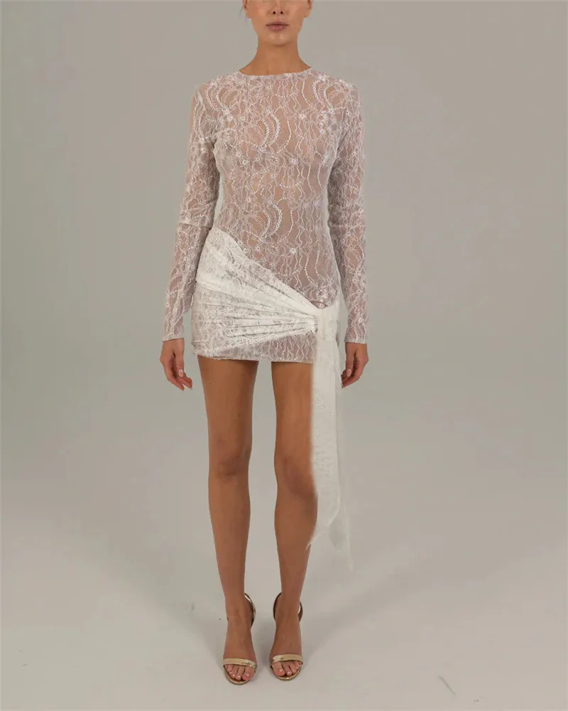 Victoria’s Vogue Sheer Lace Sexy Mini Dress For Women Fashion O Neck Long Sleeve Irregular Ruched Bodycon Night Club Party Dress