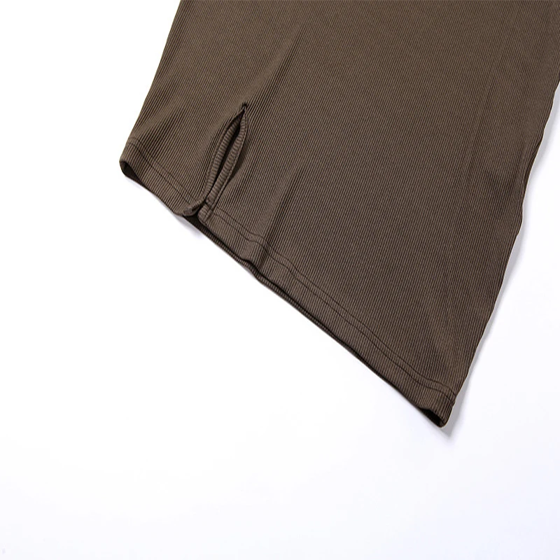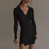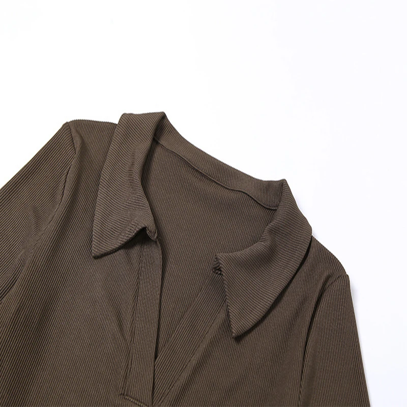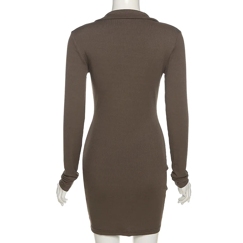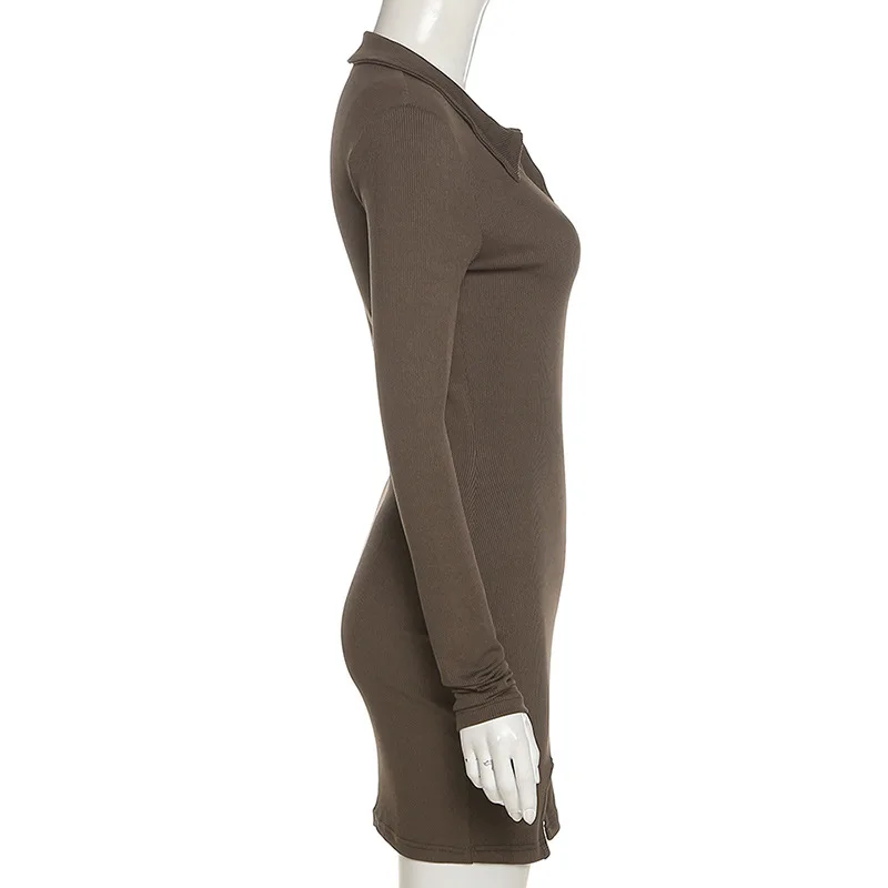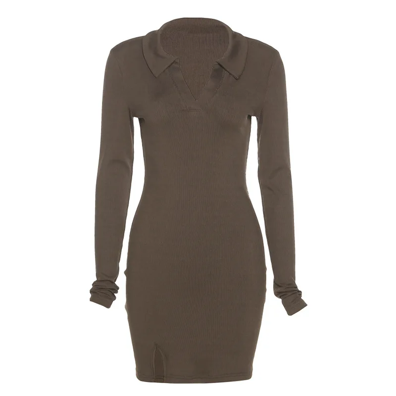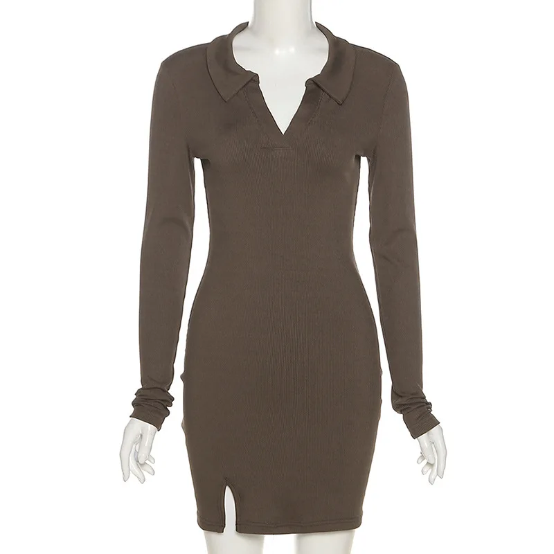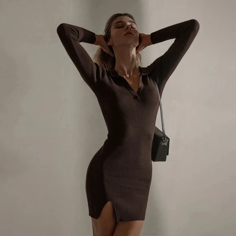 victoria’s vogue Side Split Long Sleeve Mini Dress For Women Sexy Turn Down Collar Autumn Office Lady Bodycon Fashion Brown Dress 2021