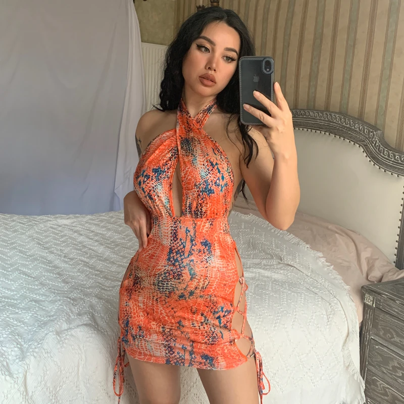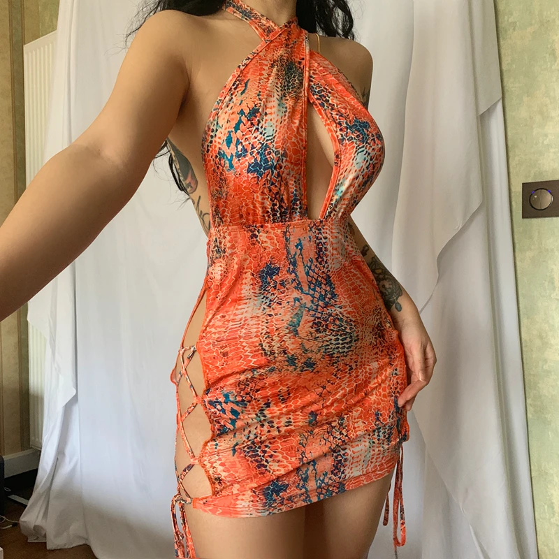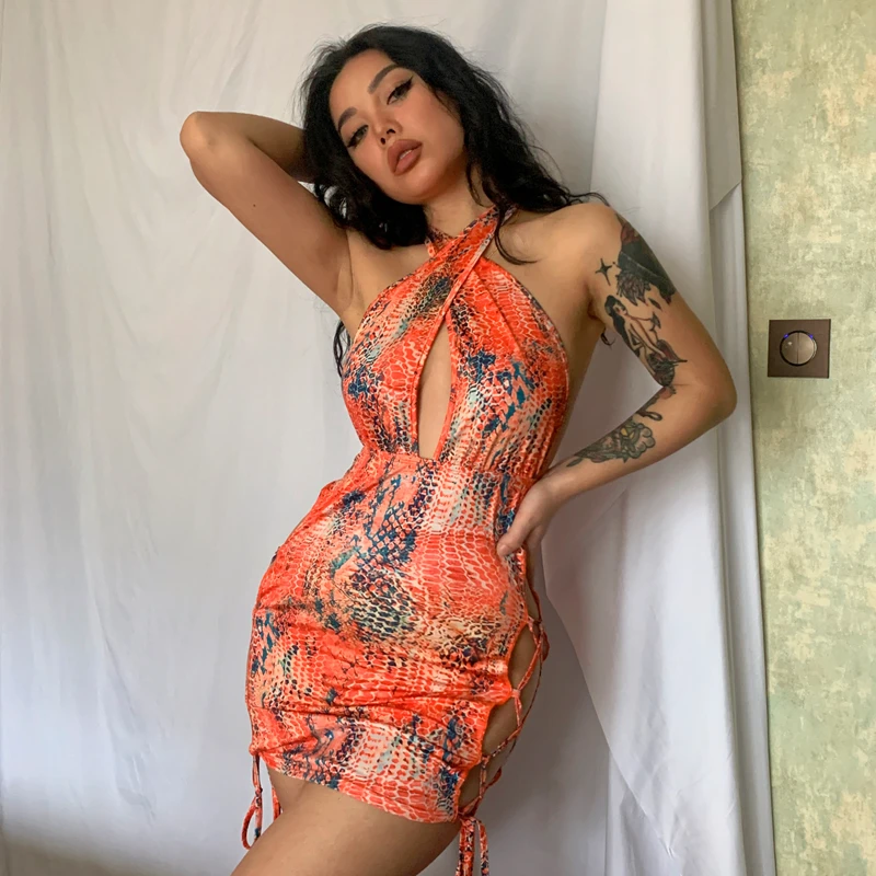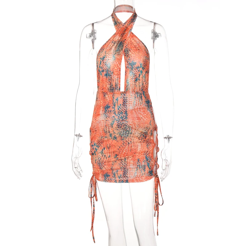 victoria’s vogue Snake Print Halter Hollow Out Sleeveless Backless Drawstrings Mini Dress 2022 Summer Sexy Bodycon Beach Club Wear Y2K