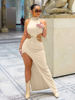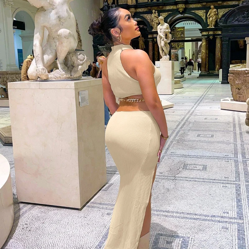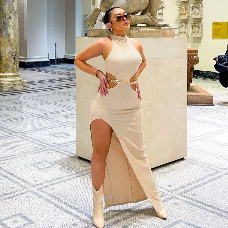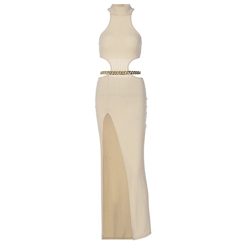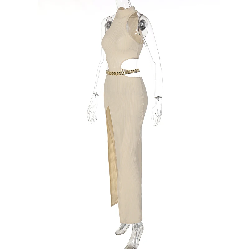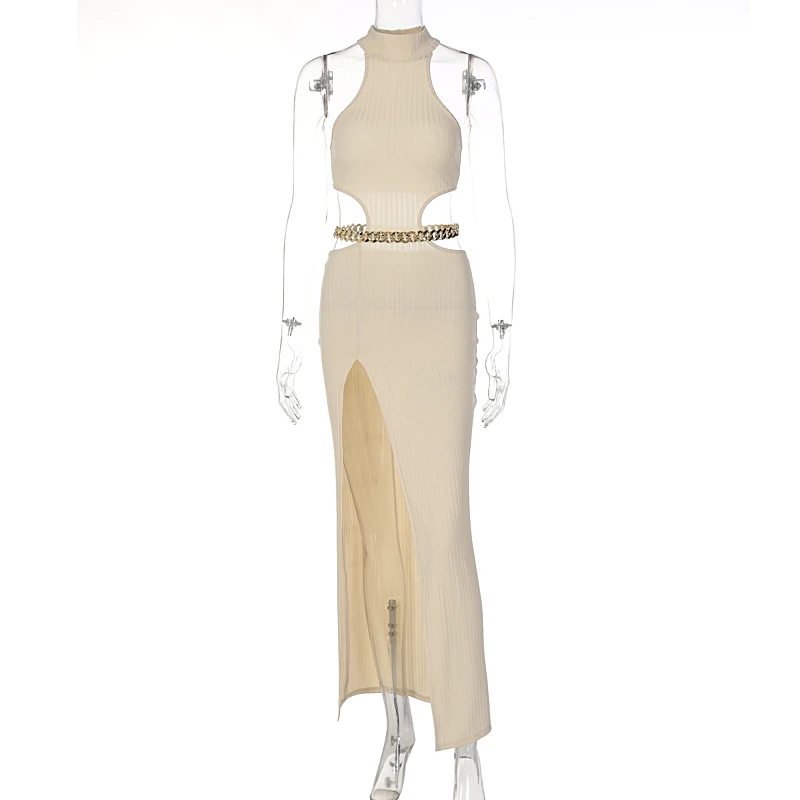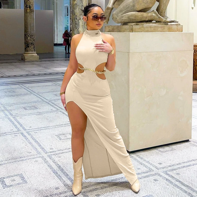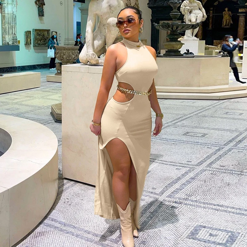 victoria’s vogue Solid Hollow Out Sleeveless Turtleneck Cut Out Metal Chain Slit Maxi Dress 2022 Summer Streetwear Party Beach Wear Y2K